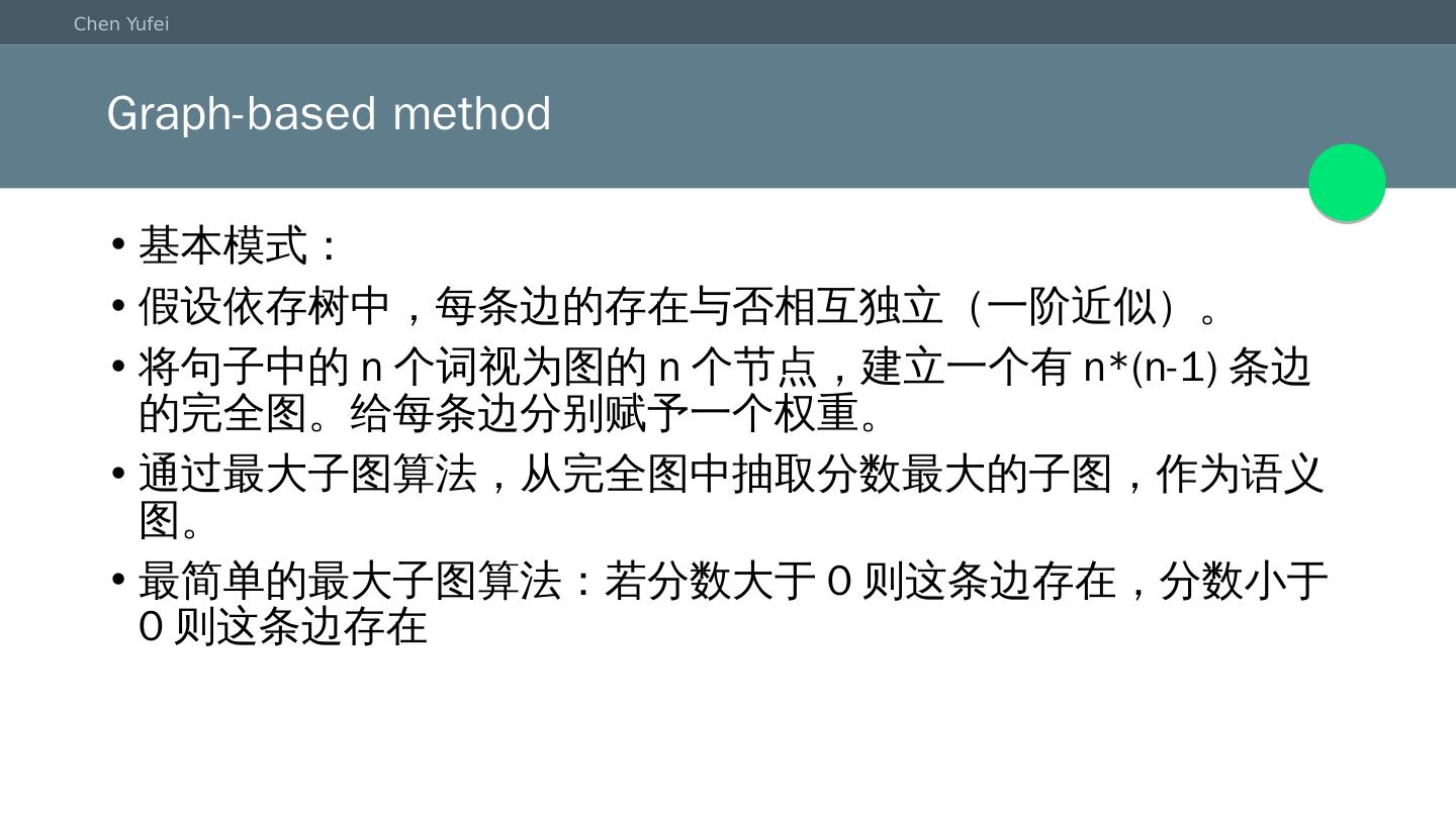 26 .Graph-based method 基本模式: 假设依存树中,每条边的存在与否相互独立 (一阶近似) 。 将句子中的n个词视为图的n个节点,建立一个有n*(n-1)条边的完全图。给每条边分别赋予一个权重。 通过最大 子图 算法,从完全图中抽取分数最大的 子图 ,作为 语义图 。 最简单的最大子图算法:若分数大于0则这条边存在,分数小于0则这条边存在