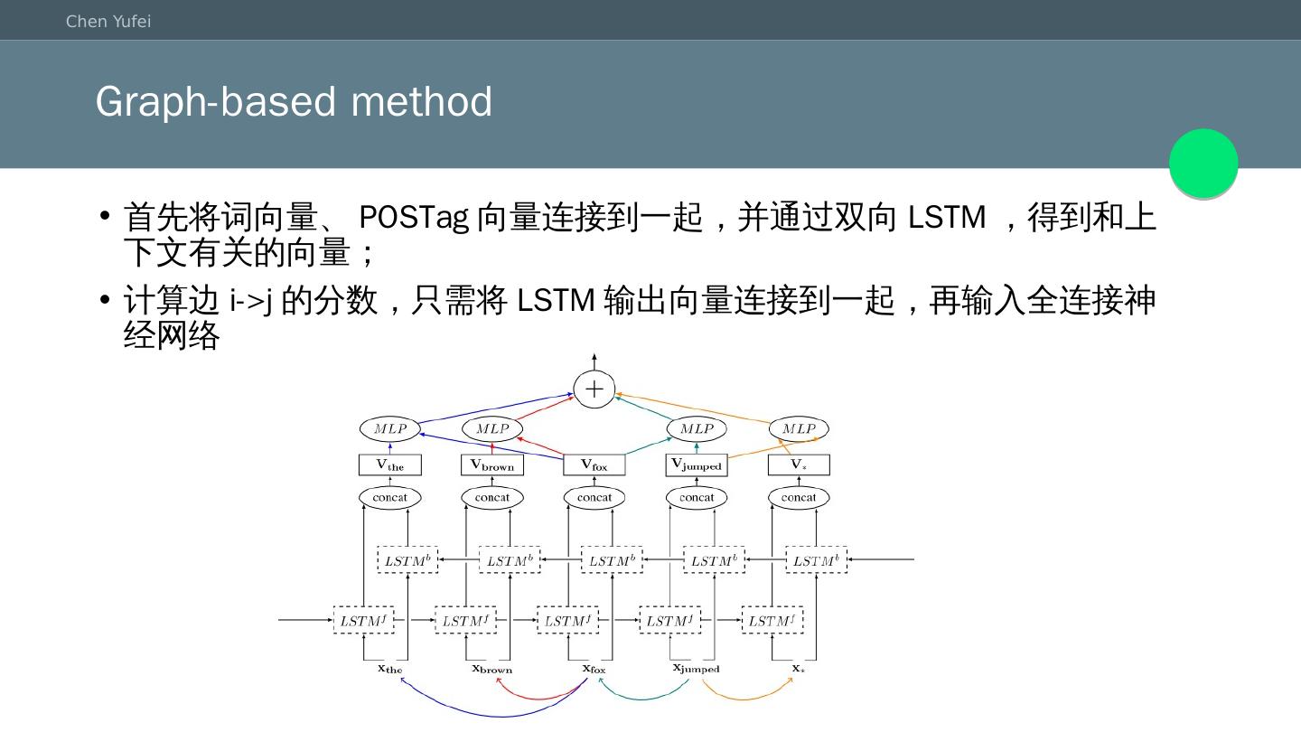 28 .Graph-based method 首先将词向量、POSTag向量连接到一起,并通过双向LSTM,得到和上下文有关的向量; 计算边i->j的分数,只需将LSTM输出向量连接到一起,再输入全连接神经网络