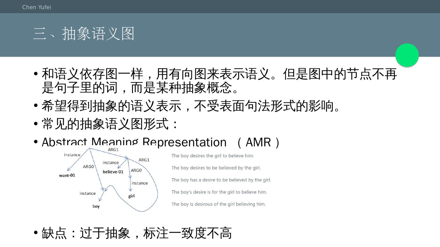 29 .三、抽象语义图 和语义依存图一样,用有向图来表示语义。但是图中的节点不再是句子里的词,而是某种抽象概念。 希望得到抽象的语义表示,不受表面句法形式的影响。 常见的抽象语义图形式: Abstract Meaning Representation(AMR) 缺点:过于抽象,标注一致度不高