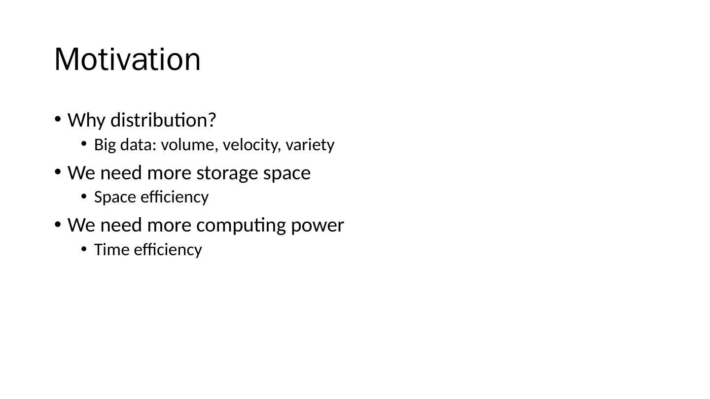3 .Motivation Why distribution? Big data: volume, velocity, variety We need more storage space Space efficiency We need more computing power Time efficiency