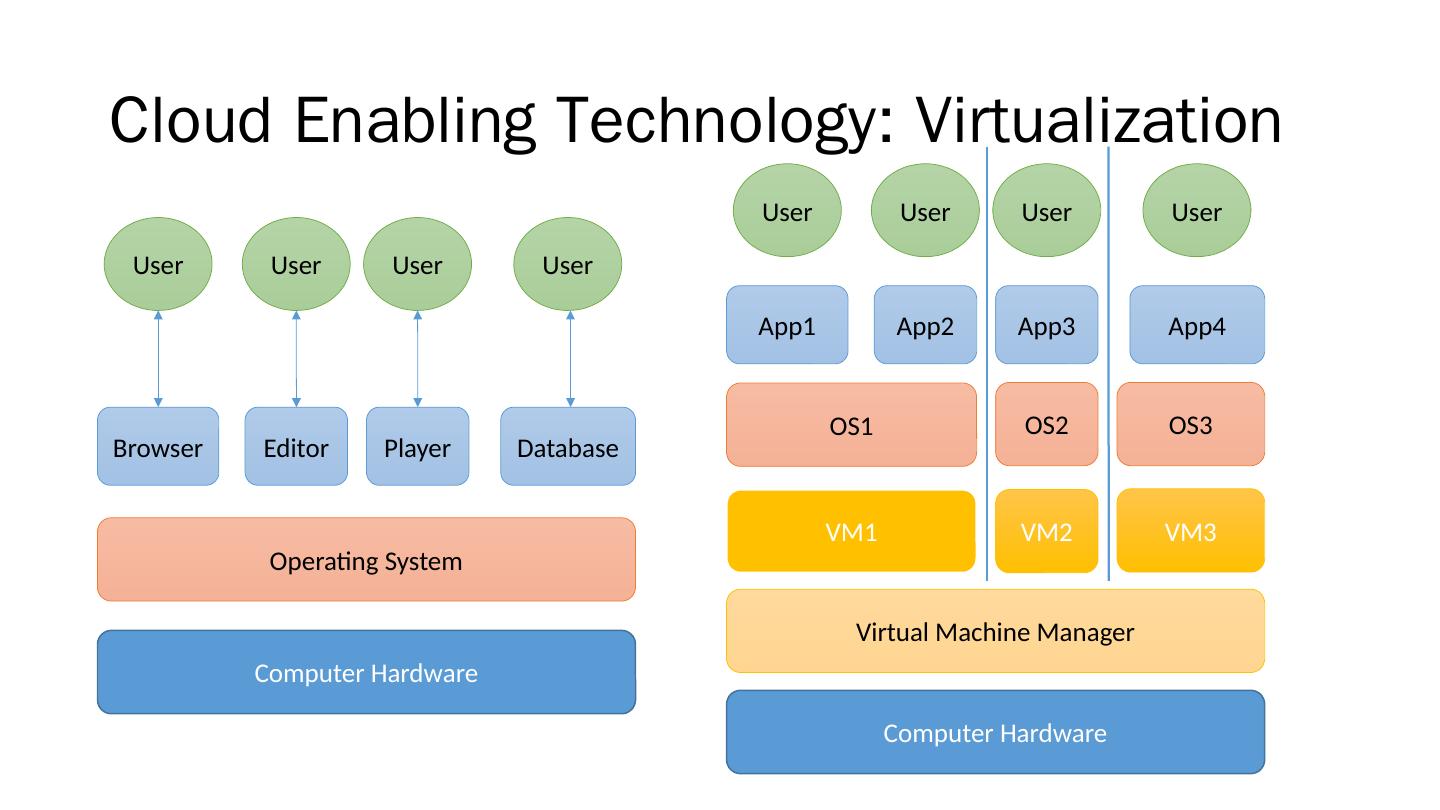 13 .Cloud Enabling Technology: Virtualization Computer Hardware OS1 App1 App2 App4 App3 User User User User Virtual Machine Manager OS2 OS3 VM1 VM2 VM3 Computer Hardware Operating System Browser Editor Database Player User User User User