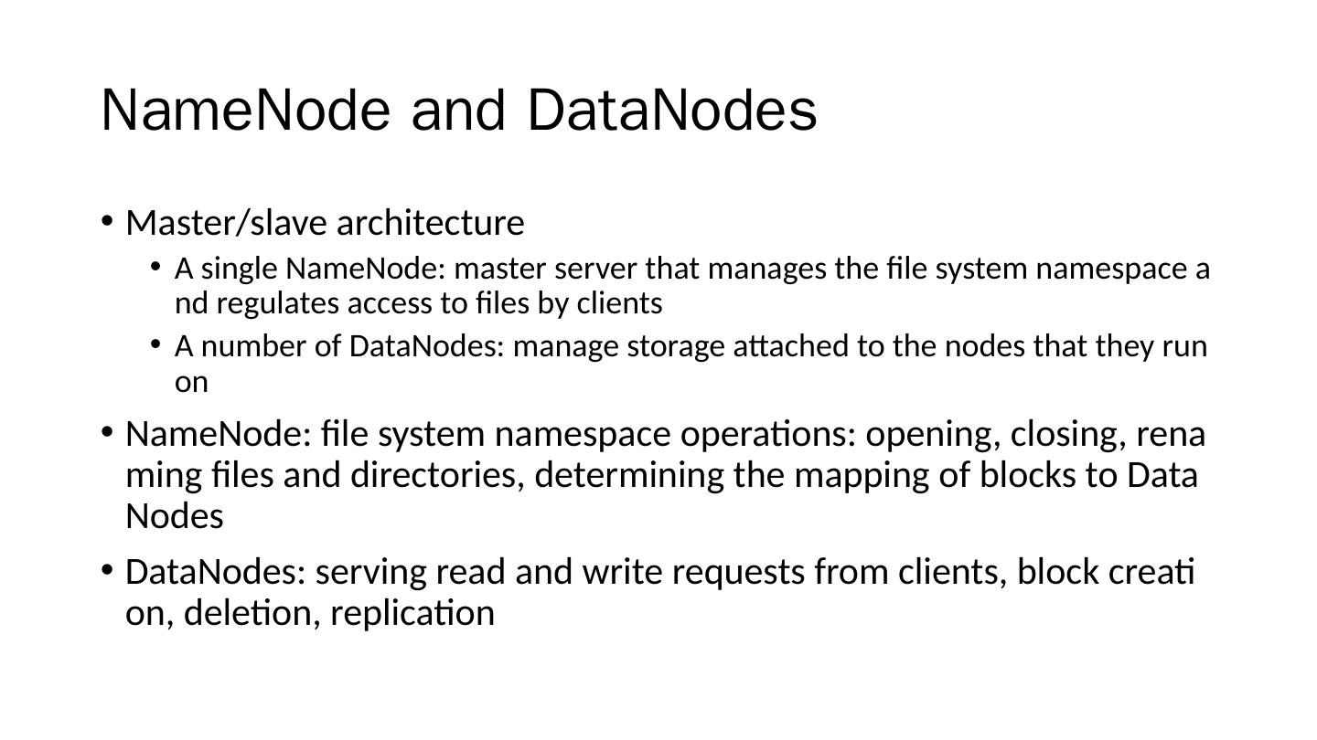 20 .NameNode and DataNodes Master/slave architecture A single NameNode : master server that manages the file system namespace and regulates access to files by clients A number of DataNodes : manage storage attached to the nodes that they run on NameNode : file system namespace operations: opening, closing, renaming files and directories, determining the mapping of blocks to DataNodes DataNodes : serving read and write requests from clients, block creation, deletion, replication