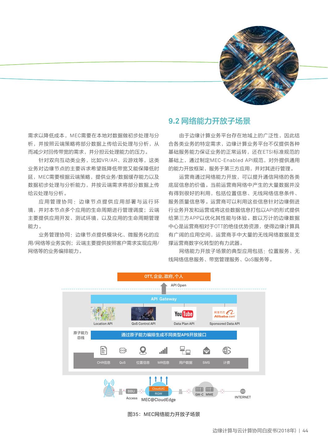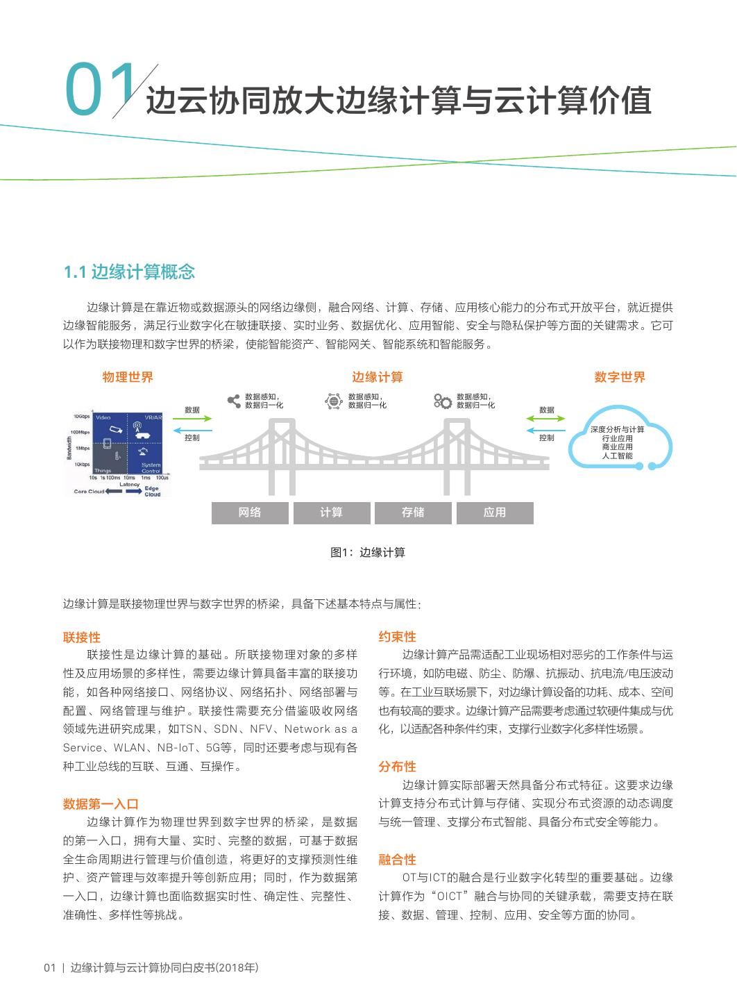 4 . 01边云协同放大边缘计算与云计算价值 1.1 边缘计算概念 边缘计算是在靠近物或数据源头的网络边缘侧,融合网络、计算、存储、应用核心能力的分布式开放平台,就近提供 边缘智能服务,满足行业数字化在敏捷联接、实时业务、数据优化、应用智能、安全与隐私保护等方面的关键需求。它可 以作为联接物理和数字世界的桥梁,使能智能资产、智能网关、智能系统和智能服务。 物理世界 边缘计算 数字世界 数据感知, 数据感知, 数据感知, 数据归一化 数据归一化 数据归一化 数据 数据 深度分析与计算 控制 控制 行业应用 商业应用 人工智能 网络 计算 存储 应用 图1:边缘计算 边缘计算是联接物理世界与数字世界的桥梁,具备下述基本特点与属性: 联接性 约束性 联接性是边缘计算的基础。所联接物理对象的多样 边缘计算产品需适配工业现场相对恶劣的工作条件与运 性及应用场景的多样性,需要边缘计算具备丰富的联接功 行环境,如防电磁、防尘、防爆、抗振动、抗电流/电压波动 能,如各种网络接口、网络协议、网络拓扑、网络部署与 等。在工业互联场景下,对边缘计算设备的功耗、成本、空间 配置、网络管理与维护。联接性需要充分借鉴吸收网络 也有较高的要求。边缘计算产品需要考虑通过软硬件集成与优 领域先进研究成果,如TSN、SDN、NFV、Network as a 化,以适配各种条件约束,支撑行业数字化多样性场景。 Service、WLAN、NB-IoT、5G等,同时还要考虑与现有各 种工业总线的互联、互通、互操作。 分布性 边缘计算实际部署天然具备分布式特征。这要求边缘 数据第一入口 计算支持分布式计算与存储、实现分布式资源的动态调度 边缘计算作为物理世界到数字世界的桥梁,是数据 与统一管理、支撑分布式智能、具备分布式安全等能力。 的第一入口,拥有大量、实时、完整的数据,可基于数据 全生命周期进行管理与价值创造,将更好的支撑预测性维 融合性 护、资产管理与效率提升等创新应用;同时,作为数据第 OT与ICT的融合是行业数字化转型的重要基础。边缘 一入口,边缘计算也面临数据实时性、确定性、完整性、 计算作为“OICT”融合与协同的关键承载,需要支持在联 准确性、多样性等挑战。 接、数据、管理、控制、应用、安全等方面的协同。 01 | 边缘计算与云计算协同白皮书(2018年)