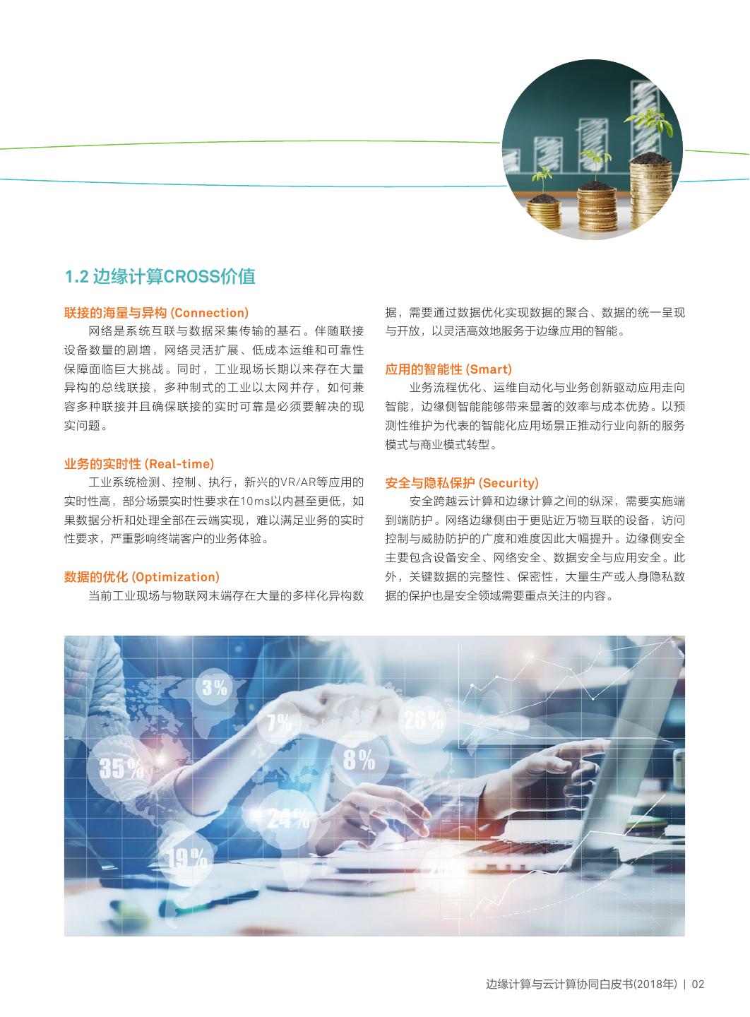 5 .1.2 边缘计算CROSS价值 联接的海量与异构 (Connection) 据,需要通过数据优化实现数据的聚合、数据的统一呈现 网络是系统互联与数据采集传输的基石。伴随联接 与开放,以灵活高效地服务于边缘应用的智能。 设备数量的剧增,网络灵活扩展、低成本运维和可靠性 保障面临巨大挑战。同时,工业现场长期以来存在大量 应用的智能性 (Smart) 异构的总线联接,多种制式的工业以太网并存,如何兼 业务流程优化、运维自动化与业务创新驱动应用走向 容多种联接并且确保联接的实时可靠是必须要解决的现 智能,边缘侧智能能够带来显著的效率与成本优势。以预 实问题。 测性维护为代表的智能化应用场景正推动行业向新的服务 模式与商业模式转型。 业务的实时性 (Real-time) 工业系统检测、控制、执行,新兴的VR/AR等应用的 安全与隐私保护 (Security) 实时性高,部分场景实时性要求在10ms以内甚至更低,如 安全跨越云计算和边缘计算之间的纵深,需要实施端 果数据分析和处理全部在云端实现,难以满足业务的实时 到端防护。网络边缘侧由于更贴近万物互联的设备,访问 性要求,严重影响终端客户的业务体验。 控制与威胁防护的广度和难度因此大幅提升。边缘侧安全 主要包含设备安全、网络安全、数据安全与应用安全。此 数据的优化 (Optimization) 外,关键数据的完整性、保密性,大量生产或人身隐私数 当前工业现场与物联网末端存在大量的多样化异构数 据的保护也是安全领域需要重点关注的内容。 边缘计算与云计算协同白皮书(2018年) | 02