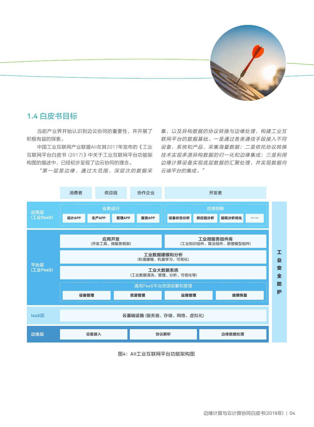 7 .1.4 白皮书目标 当前产业界开始认识到边云协同的重要性,并开展了 集,以及异构数据的协议转换与边缘处理,构建工业互 积极有益的探索。 联网平台的数据基础。一是通过各类通信手段接入不同 中国工业互联网产业联盟AII在其2017年发布的《工业 设备、系统和产品,采集海量数据;二是依托协议转换 互联网平台白皮书 (2017)》中关于工业互联网平台功能架 技术实现多源异构数据的归一化和边缘集成;三是利用 构图的描述中,已经初步呈现了边云协同的理念。 边缘计算设备实现底层数据的汇聚处理,并实现数据向 “第一层是边缘,通过大范围、深层次的数据采 云端平台的集成。” 消费者 供应链 协作企业 开发者 业务运行 应用创新 应用层 (工业SaaS) 设计APP 生产APP 管理APP 服务APP 设备状态分析 供应链分析 能耗分析优化 …… 应用开发 工业微服务组件库 (开发工具、微服务框架) (工业知识组件、算法组件、原理模型组件) 工业数据建模和分析 工 (机理建模、机器学习、可视化) 业 平台层 (工业PaaS) 工业大数据系统 安 (工业数据清洗、管理、分析、可视化等) 全 通用PaaS平台资源部署和管理 防 护 设备管理 资源管理 运维管理 故障恢复 IaaS层 云基础设施 (服务器、存储、网络、虚拟化) 边缘层 设备接入 协议解析 边缘数据处理 图4:AII工业互联网平台功能架构图 边缘计算与云计算协同白皮书(2018年) | 04