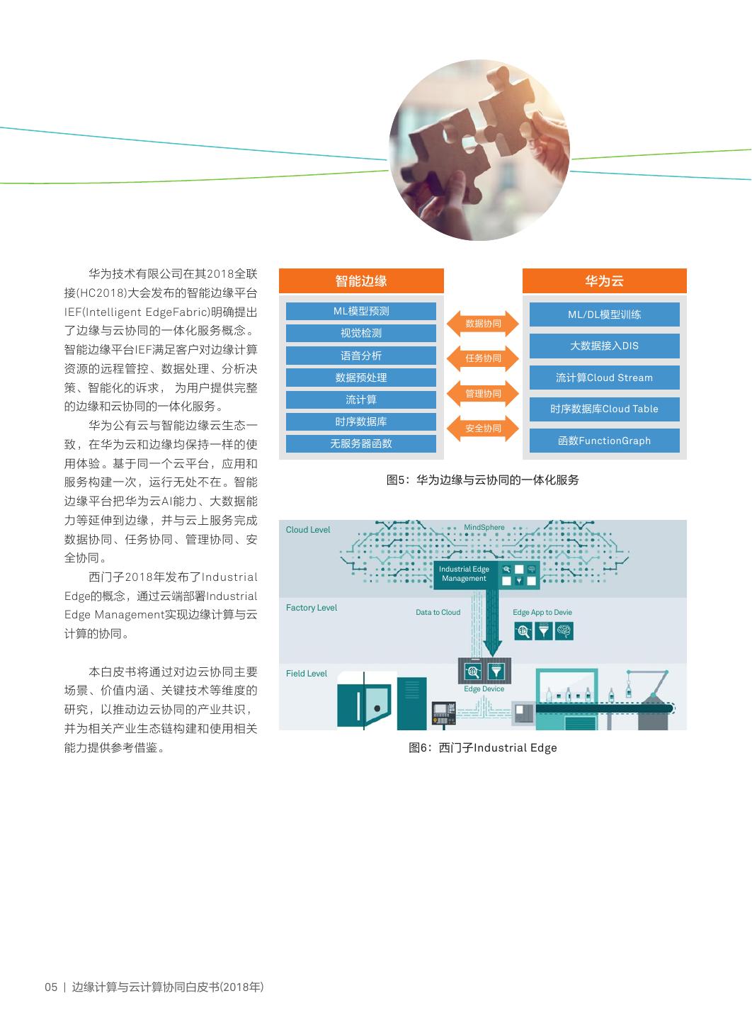 8 . 华为技术有限公司在其2018全联 智能边缘 华为云 接(HC2018)大会发布的智能边缘平台 IEF(Intelligent EdgeFabric)明确提出 ML模型预测 ML/DL模型训练 数据协同 了边缘与云协同的一体化服务概念。 视觉检测 智能边缘平台IEF满足客户对边缘计算 大数据接入DIS 语音分析 任务协同 资源的远程管控、数据处理、分析决 数据预处理 流计算Cloud Stream 策、智能化的诉求, 为用户提供完整 管理协同 流计算 的边缘和云协同的一体化服务。 时序数据库Cloud Table 华为公有云与智能边缘云生态一 时序数据库 安全协同 致,在华为云和边缘均保持一样的使 无服务器函数 函数FunctionGraph 用体验。基于同一个云平台,应用和 服务构建一次,运行无处不在。智能 图5:华为边缘与云协同的一体化服务 边缘平台把华为云AI能力、大数据能 力等延伸到边缘,并与云上服务完成 MindSphere Cloud Level 数据协同、任务协同、管理协同、安 全协同。 Industrial Edge 西门子2018年发布了Industrial Management Edge的概念,通过云端部署Industrial Factory Level Edge Management实现边缘计算与云 Data to Cloud Edge App to Devie 计算的协同。 本白皮书将通过对边云协同主要 Field Level 场景、价值内涵、关键技术等维度的 Edge Device 研究,以推动边云协同的产业共识, 并为相关产业生态链构建和使用相关 能力提供参考借鉴。 图6:西门子Industrial Edge 05 | 边缘计算与云计算协同白皮书(2018年)