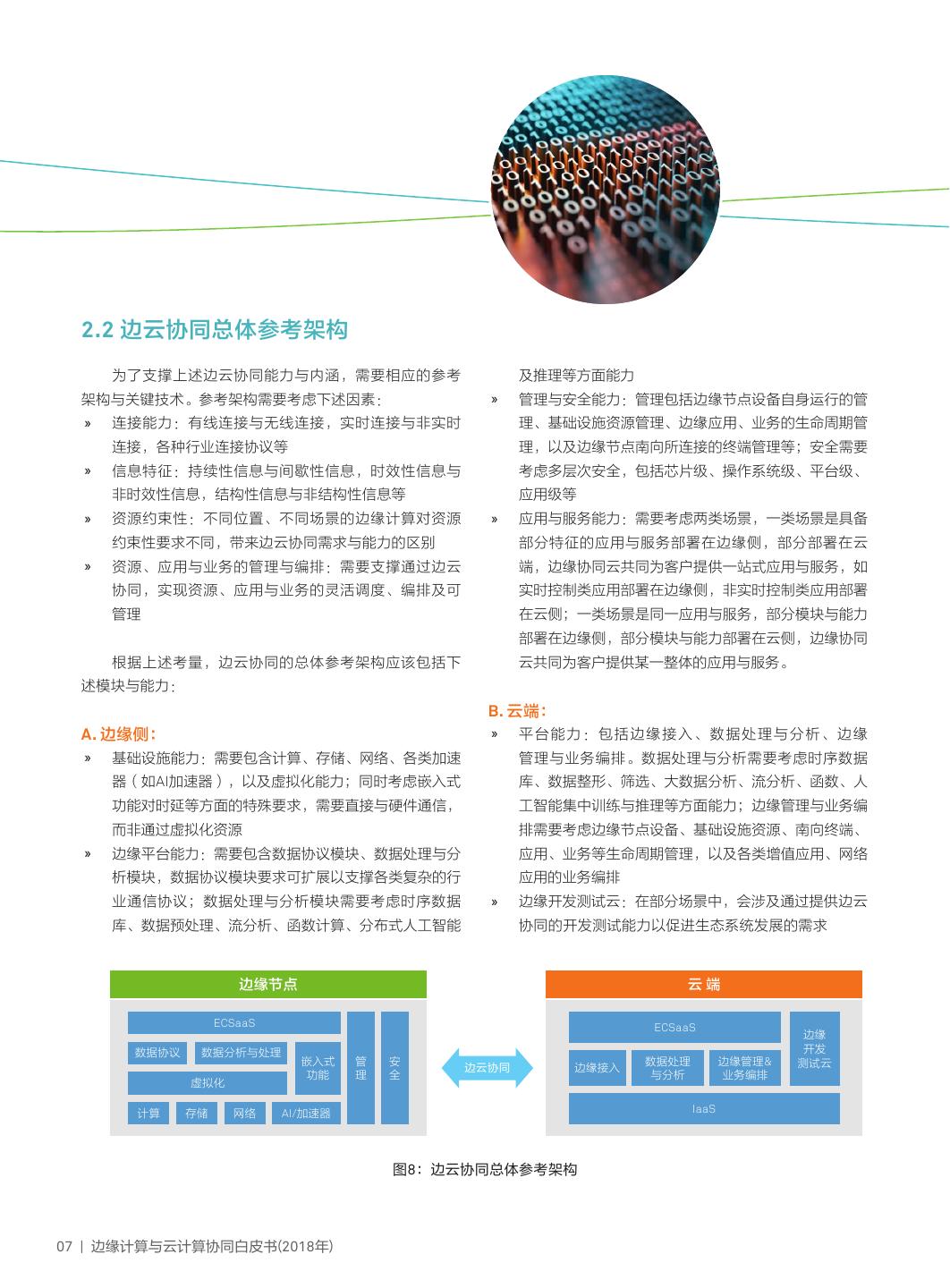 10 . 2.2 边云协同总体参考架构 为了支撑上述边云协同能力与内涵,需要相应的参考 及推理等方面能力 架构与关键技术。参考架构需要考虑下述因素: » 管理与安全能力:管理包括边缘节点设备自身运行的管 » 连接能力:有线连接与无线连接,实时连接与非实时 理、基础设施资源管理、边缘应用、业务的生命周期管 连接,各种行业连接协议等 理,以及边缘节点南向所连接的终端管理等;安全需要 » 信息特征:持续性信息与间歇性信息,时效性信息与 考虑多层次安全,包括芯片级、操作系统级、平台级、 非时效性信息,结构性信息与非结构性信息等 应用级等 » 资源约束性:不同位置、不同场景的边缘计算对资源 » 应用与服务能力:需要考虑两类场景,一类场景是具备 约束性要求不同,带来边云协同需求与能力的区别 部分特征的应用与服务部署在边缘侧,部分部署在云 » 资源、应用与业务的管理与编排:需要支撑通过边云 端,边缘协同云共同为客户提供一站式应用与服务,如 协同,实现资源、应用与业务的灵活调度、编排及可 实时控制类应用部署在边缘侧,非实时控制类应用部署 管理 在云侧;一类场景是同一应用与服务,部分模块与能力 部署在边缘侧,部分模块与能力部署在云侧,边缘协同 根据上述考量,边云协同的总体参考架构应该包括下 云共同为客户提供某一整体的应用与服务。 述模块与能力: B. 云端: A. 边缘侧: » 平台能力:包括边缘接入、数据处理与分析、边缘 » 基础设施能力:需要包含计算、存储、网络、各类加速 管理与业务编排。数据处理与分析需要考虑时序数据 器(如AI加速器),以及虚拟化能力;同时考虑嵌入式 库、数据整形、筛选、大数据分析、流分析、函数、人 功能对时延等方面的特殊要求,需要直接与硬件通信, 工智能集中训练与推理等方面能力;边缘管理与业务编 而非通过虚拟化资源 排需要考虑边缘节点设备、基础设施资源、南向终端、 » 边缘平台能力:需要包含数据协议模块、数据处理与分 应用、业务等生命周期管理,以及各类增值应用、网络 析模块,数据协议模块要求可扩展以支撑各类复杂的行 应用的业务编排 业通信协议;数据处理与分析模块需要考虑时序数据 » 边缘开发测试云:在部分场景中,会涉及通过提供边云 库、数据预处理、流分析、函数计算、分布式人工智能 协同的开发测试能力以促进生态系统发展的需求 边缘节点 云端 ECSaaS ECSaaS 边缘 数据协议 数据分析与处理 开发 嵌入式 管 安 数据处理 边缘管理& 测试云 边云协同 边缘接入 功能 理 全 与分析 业务编排 虚拟化 计算 存储 网络 AI/加速器 IaaS 图8:边云协同总体参考架构 07 | 边缘计算与云计算协同白皮书(2018年)