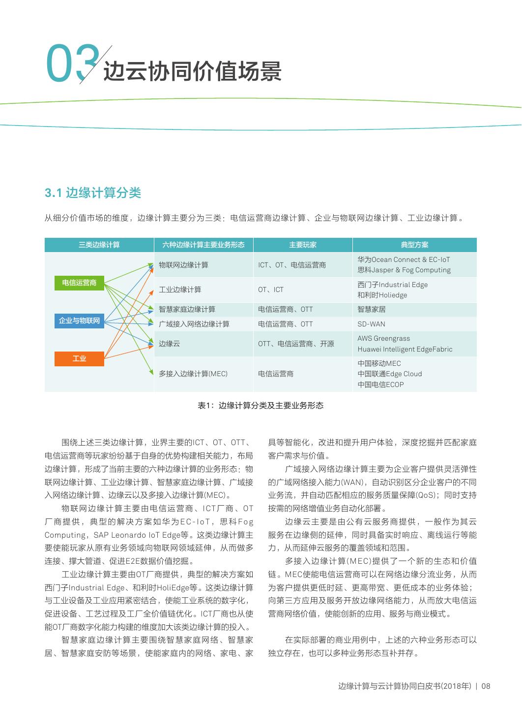 11 .03边云协同价值场景 3.1 边缘计算分类 从细分价值市场的维度,边缘计算主要分为三类:电信运营商边缘计算、企业与物联网边缘计算、工业边缘计算。 三类边缘计算 六种边缘计算主要业务形态 主要玩家 典型方案 华为Ocean Connect & EC-IoT 物联网边缘计算 ICT、OT、电信运营商 思科Jasper & Fog Computing 电信运营商 西门子Industrial Edge 工业边缘计算 OT、ICT 和利时Holiedge 智慧家庭边缘计算 电信运营商、OTT 智慧家居 企业与物联网 广域接入网络边缘计算 电信运营商、OTT SD-WAN AWS Greengrass 边缘云 OTT、电信运营商、开源 Huawei Intelligent EdgeFabric 工业 中国移动MEC 多接入边缘计算(MEC) 电信运营商 中国联通Edge Cloud 中国电信ECOP 表1:边缘计算分类及主要业务形态 围绕上述三类边缘计算,业界主要的ICT、OT、OTT、 具等智能化,改进和提升用户体验,深度挖掘并匹配家庭 电信运营商等玩家纷纷基于自身的优势构建相关能力,布局 客户需求与价值。 边缘计算,形成了当前主要的六种边缘计算的业务形态:物 广域接入网络边缘计算主要为企业客户提供灵活弹性 联网边缘计算、工业边缘计算、智慧家庭边缘计算、广域接 的广域网络接入能力(WAN),自动识别区分企业客户的不同 入网络边缘计算、边缘云以及多接入边缘计算(MEC)。 业务流,并自动匹配相应的服务质量保障(QoS);同时支持 物 联 网 边 缘 计 算 主 要 由 电 信 运 营 商 、 I CT 厂 商 、 OT 按需的网络增值业务自动化部署。 厂商提供,典型的解决方案如华为EC-IoT,思科Fog 边缘云主要是由公有云服务商提供,一般作为其云 Computing,SAP Leonardo IoT Edge等。这类边缘计算主 服务在边缘侧的延伸,同时具备实时响应、离线运行等能 要使能玩家从原有业务领域向物联网领域延伸,从而做多 力,从而延伸云服务的覆盖领域和范围。 连接、撑大管道、促进E2E数据价值挖掘。 多接入边缘计算(MEC)提供了一个新的生态和价值 工业边缘计算主要由OT厂商提供,典型的解决方案如 链。MEC使能电信运营商可以在网络边缘分流业务,从而 西门子Industrial Edge、和利时HoliEdge等。这类边缘计算 为客户提供更低时延、更高带宽、更低成本的业务体验; 与工业设备及工业应用紧密结合,使能工业系统的数字化, 向第三方应用及服务开放边缘网络能力,从而放大电信运 促进设备、工艺过程及工厂全价值链优化。ICT厂商也从使 营商网络价值,使能创新的应用、服务与商业模式。 能OT厂商数字化能力构建的维度加大该类边缘计算的投入。 智慧家庭边缘计算主要围绕智慧家庭网络、智慧家 在实际部署的商业用例中,上述的六种业务形态可以 居、智慧家庭安防等场景,使能家庭内的网络、家电、家 独立存在,也可以多种业务形态互补并存。 边缘计算与云计算协同白皮书(2018年) | 08