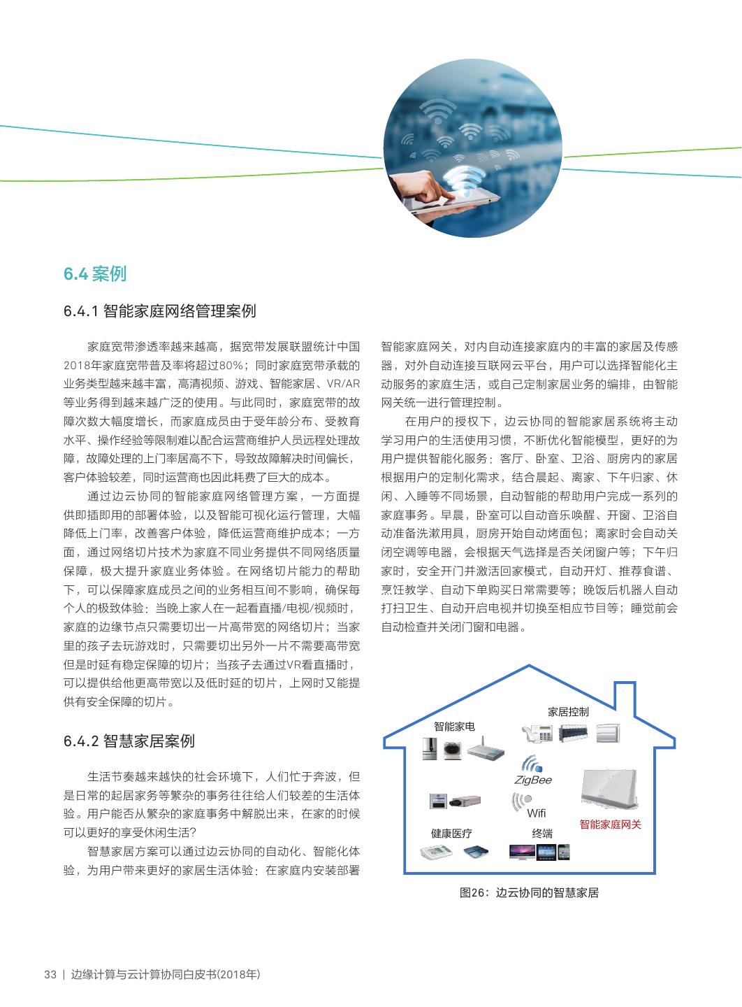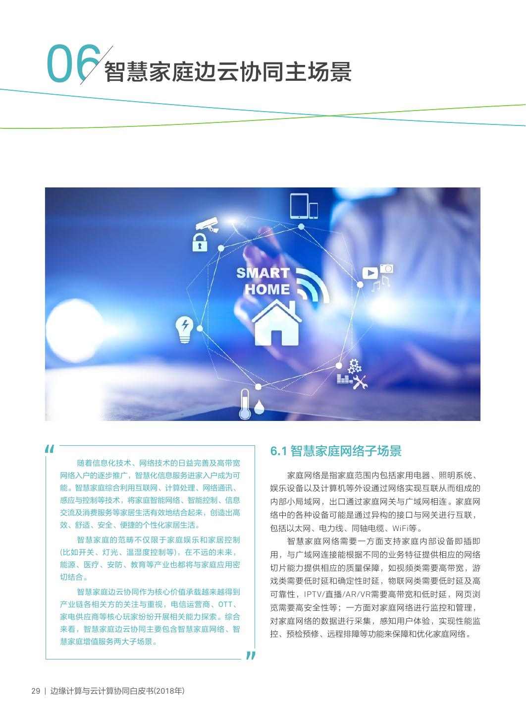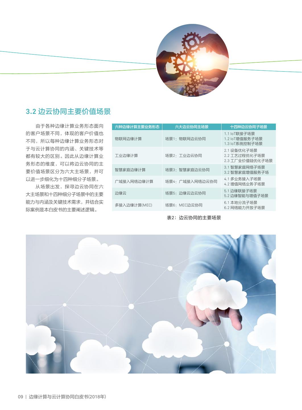 12 . 3.2 边云协同主要价值场景 由于各种边缘计算业务形态面向 六种边缘计算主要业务形态 六大边云协同主场景 十四种边云协同子场景 的客户场景不同,体现的客户价值也 1.1 IoT联接子场景 物联网边缘计算 场景1:物联网边云协同 1.2 IoT增值服务子场景 不同,所以每种边缘计算业务形态对 1.3 IoT系统控制子场景 于与云计算协同的内涵、关键技术等 2.1 设备优化子场景 都有较大的区别。因此从边缘计算业 工业边缘计算 场景2:工业边云协同 2.2 工艺过程优化子场景 2.3 工厂全价值链优化子场景 务形态的维度,可以将边云协同的主 3.1 智慧家庭网络子场景 智慧家庭边缘计算 场景3:智慧家庭边云协同 要价值场景区分为六大主场景,并可 3.2 智慧家庭增值服务子场 以进一步细化为十四种细分子场景。 广域接入网络边缘计算 场景4:广域接入网络边云协同 4.1 多业务接入子场景 4.2 增值网络业务子场景 从场景出发,探寻边云协同在六 5.1 边缘联接子场景 大主场景和十四种细分子场景中的主要 边缘云 场景5:边缘云边云协同 5.2 边缘智能与增值子场景 能力与内涵及关键技术需求,并结合实 6.1 本地分流子场景 多接入边缘计算(MEC) 场景6:MEC边云协同 6.2 网络能力开放子场景 际案例是本白皮书的主要阐述逻辑。 表2:边云协同的主要场景 09 | 边缘计算与云计算协同白皮书(2018年)