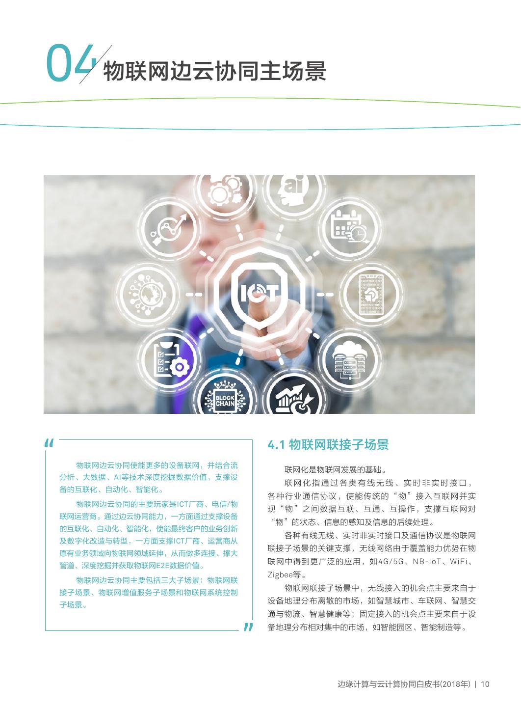 13 .04物联网边云协同主场景 4.1 物联网联接子场景 物联网边云协同使能更多的设备联网,并结合流 联网化是物联网发展的基础。 分析、大数据、AI等技术深度挖掘数据价值,支撑设 联网化指通过各类有线无线、实时非实时接口, 备的互联化、自动化、智能化。 各种行业通信协议,使能传统的“物”接入互联网并实 物联网边云协同的主要玩家是ICT厂商、电信/物 现“物”之间数据互联、互通、互操作,支撑互联网对 联网运营商。通过边云协同能力,一方面通过支撑设备 “物”的状态、信息的感知及信息的后续处理。 的互联化、自动化、智能化,使能最终客户的业务创新 各种有线无线、实时非实时接口及通信协议是物联网 及数字化改造与转型,一方面支撑ICT厂商、运营商从 联接子场景的关键支撑,无线网络由于覆盖能力优势在物 原有业务领域向物联网领域延伸,从而做多连接、撑大 联网中得到更广泛的应用,如4G/5G、NB-IoT、WiFi、 管道、深度挖掘并获取物联网E2E数据价值。 Zigbee等。 物联网边云协同主要包括三大子场景:物联网联 物联网联接子场景中,无线接入的机会点主要来自于 接子场景、物联网增值服务子场景和物联网系统控制 子场景。 设备地理分布离散的市场,如智慧城市、车联网、智慧交 通与物流、智慧健康等;固定接入的机会点主要来自于设 备地理分布相对集中的市场,如智能园区、智能制造等。 边缘计算与云计算协同白皮书(2018年) | 10