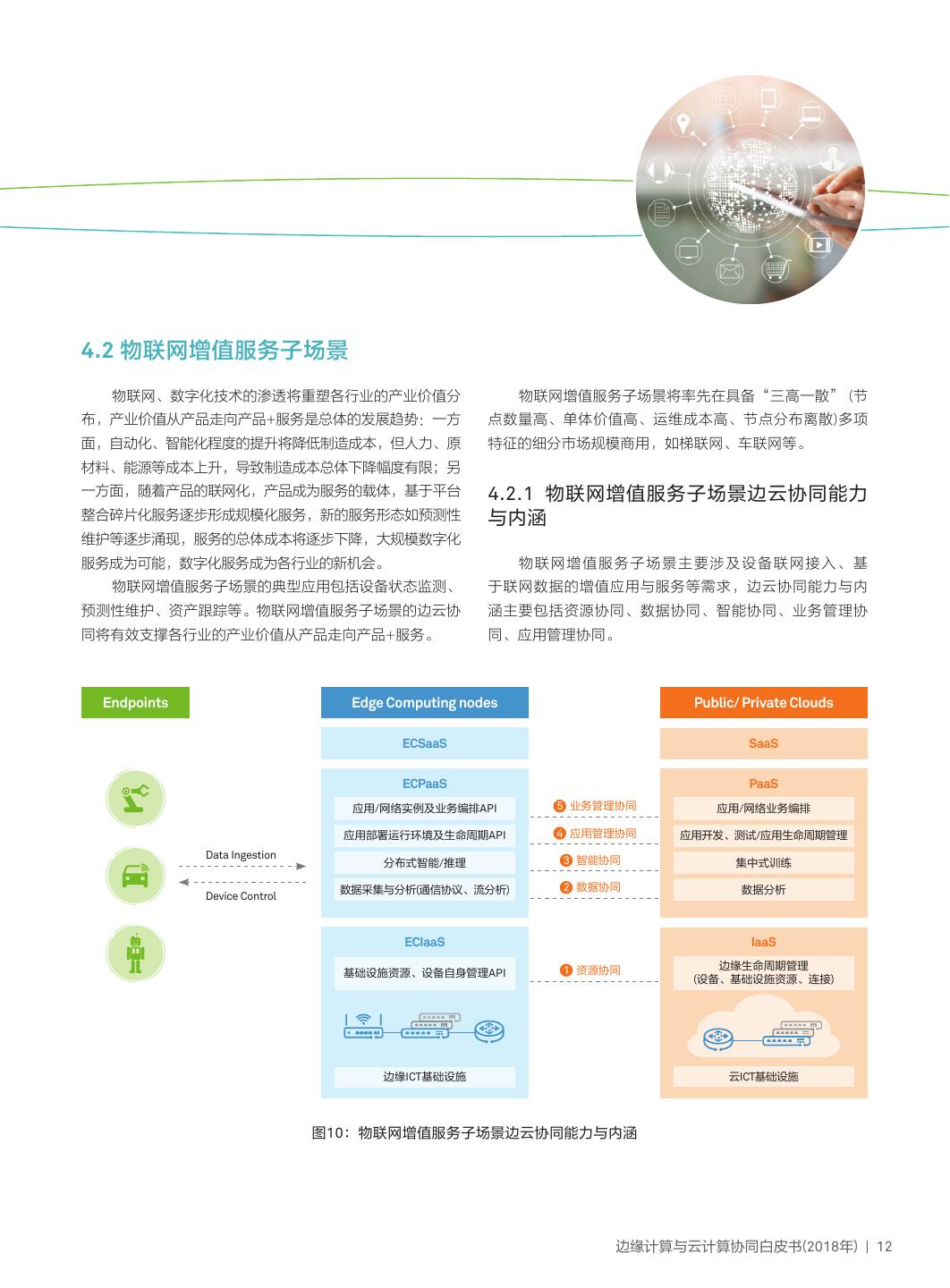 15 .4.2 物联网增值服务子场景 物联网、数字化技术的渗透将重塑各行业的产业价值分 物联网增值服务子场景将率先在具备“三高一散” (节 布,产业价值从产品走向产品+服务是总体的发展趋势:一方 点数量高、单体价值高、运维成本高、节点分布离散)多项 面,自动化、智能化程度的提升将降低制造成本,但人力、原 特征的细分市场规模商用,如梯联网、车联网等。 材料、能源等成本上升,导致制造成本总体下降幅度有限;另 一方面,随着产品的联网化,产品成为服务的载体,基于平台 4.2.1 物联网增值服务子场景边云协同能力 整合碎片化服务逐步形成规模化服务,新的服务形态如预测性 与内涵 维护等逐步涌现,服务的总体成本将逐步下降,大规模数字化 服务成为可能,数字化服务成为各行业的新机会。 物联网增值服务子场景主要涉及设备联网接入、基 物联网增值服务子场景的典型应用包括设备状态监测、 于联网数据的增值应用与服务等需求,边云协同能力与内 预测性维护、资产跟踪等。物联网增值服务子场景的边云协 涵主要包括资源协同、数据协同、智能协同、业务管理协 同将有效支撑各行业的产业价值从产品走向产品+服务。 同、应用管理协同。 Endpoints Edge Computing nodes Public/ Private Clouds ECSaaS SaaS ECPaaS PaaS 应用/网络实例及业务编排API 5 业务管理协同 应用/网络业务编排 应用部署运行环境及生命周期API 4 应用管理协同 应用开发、测试/应用生命周期管理 Data Ingestion 分布式智能/推理 3 智能协同 集中式训练 数据采集与分析(通信协议、流分析) 2 数据协同 数据分析 Device Control ECIaaS IaaS 1 资源协同 边缘生命周期管理 基础设施资源、设备自身管理API (设备、基础设施资源、连接) 边缘ICT基础设施 云ICT基础设施 图10:物联网增值服务子场景边云协同能力与内涵 边缘计算与云计算协同白皮书(2018年) | 12