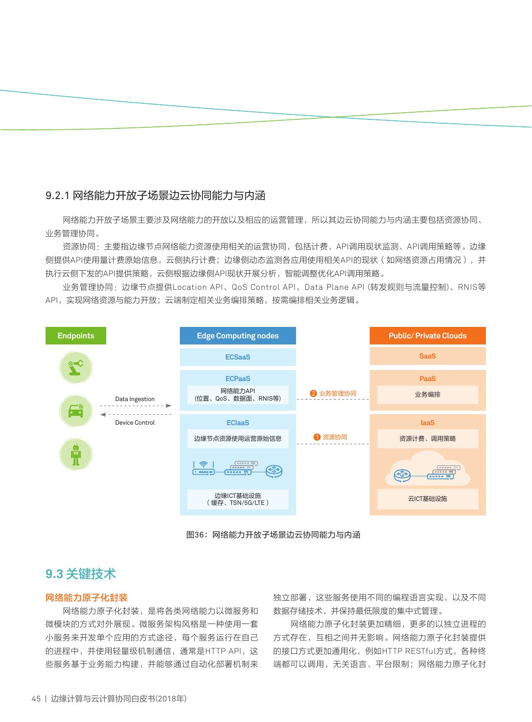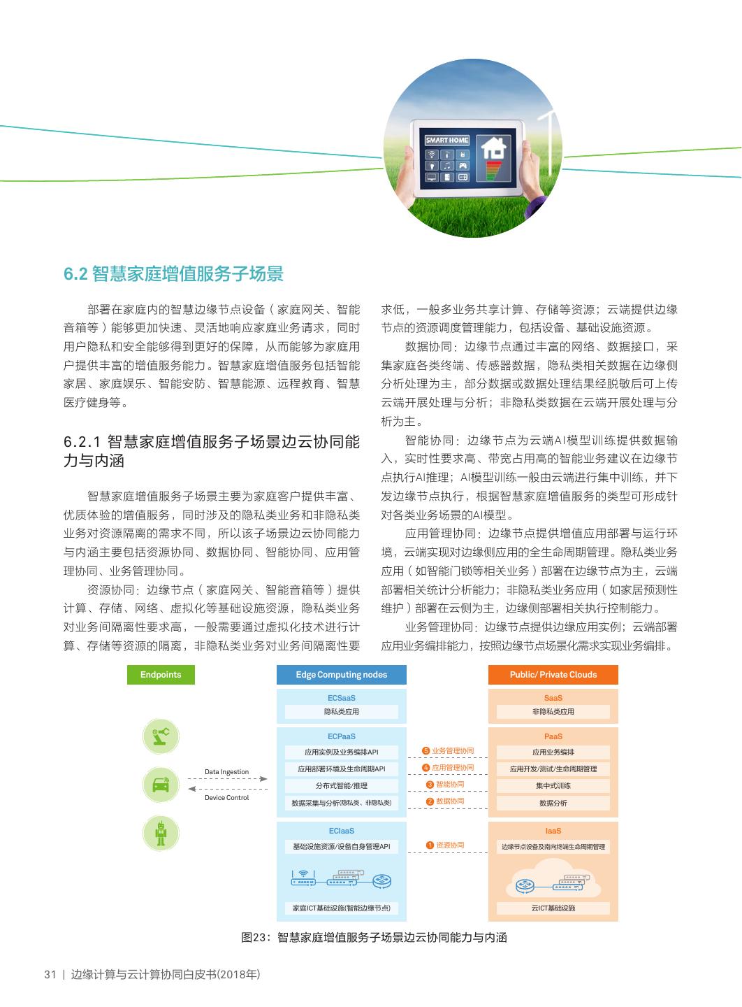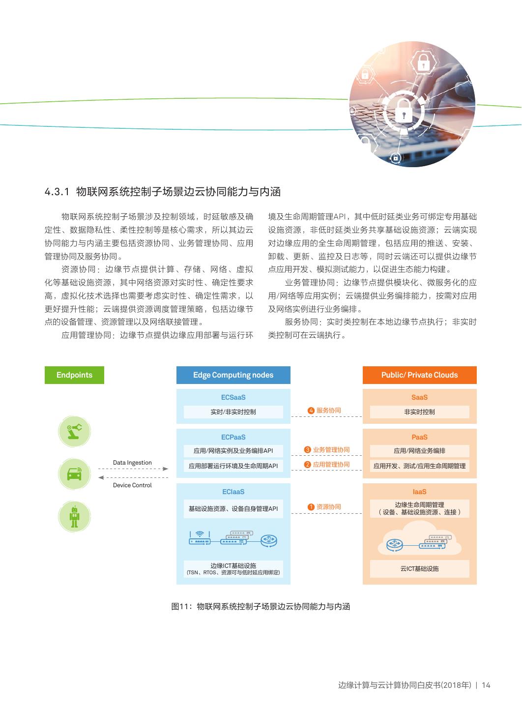 17 .4.3.1 物联网系统控制子场景边云协同能力与内涵 物联网系统控制子场景涉及控制领域,时延敏感及确 境及生命周期管理API,其中低时延类业务可绑定专用基础 定性、数据隐私性、柔性控制等是核心需求,所以其边云 设施资源,非低时延类业务共享基础设施资源;云端实现 协同能力与内涵主要包括资源协同、业务管理协同、应用 对边缘应用的全生命周期管理,包括应用的推送、安装、 管理协同及服务协同。 卸载、更新、监控及日志等,同时云端还可以提供边缘节 资源协同:边缘节点提供计算、存储、网络、虚拟 点应用开发、模拟测试能力,以促进生态能力构建。 化等基础设施资源,其中网络资源对实时性、确定性要求 业务管理协同:边缘节点提供模块化、微服务化的应 高,虚拟化技术选择也需要考虑实时性、确定性需求,以 用/网络等应用实例;云端提供业务编排能力,按需对应用 更好提升性能;云端提供资源调度管理策略,包括边缘节 及网络实例进行业务编排。 点的设备管理、资源管理以及网络联接管理。 服务协同:实时类控制在本地边缘节点执行;非实时 应用管理协同:边缘节点提供边缘应用部署与运行环 类控制可在云端执行。 Endpoints Edge Computing nodes Public/ Private Clouds ECSaaS SaaS 实时/非实时控制 4 服务协同 非实时控制 ECPaaS PaaS 应用/网络实例及业务编排API 3 业务管理协同 应用/网络业务编排 Data Ingestion 2 应用管理协同 应用部署运行环境及生命周期API 应用开发、测试/应用生命周期管理 Device Control ECIaaS IaaS 1 资源协同 边缘生命周期管理 基础设施资源、设备自身管理API (设备、基础设施资源、连接) 边缘ICT基础设施 云ICT基础设施 (TSN、RTOS、资源可与低时延应用绑定) 图11:物联网系统控制子场景边云协同能力与内涵 边缘计算与云计算协同白皮书(2018年) | 14