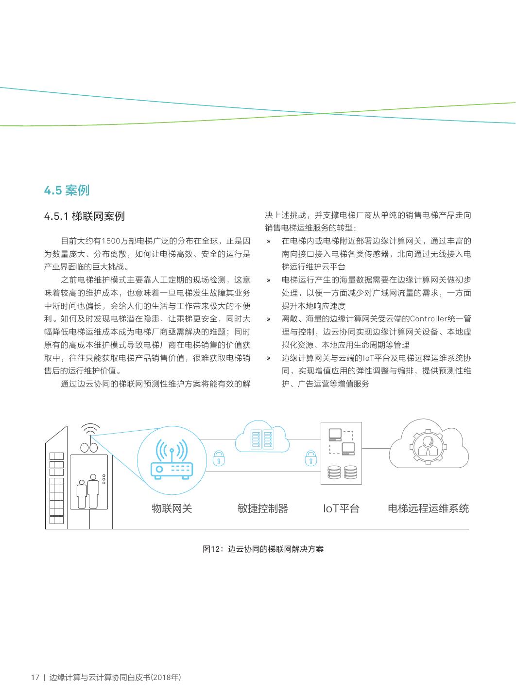 20 . 4.5 案例 4.5.1 梯联网案例 决上述挑战,并支撑电梯厂商从单纯的销售电梯产品走向 销售电梯运维服务的转型: 目前大约有1500万部电梯广泛的分布在全球,正是因 » 在电梯内或电梯附近部署边缘计算网关,通过丰富的 为数量庞大、分布离散,如何让电梯高效、安全的运行是 南向接口接入电梯各类传感器,北向通过无线接入电 产业界面临的巨大挑战。 梯运行维护云平台 之前电梯维护模式主要靠人工定期的现场检测,这意 » 电梯运行产生的海量数据需要在边缘计算网关做初步 味着较高的维护成本,也意味着一旦电梯发生故障其业务 处理,以便一方面减少对广域网流量的需求,一方面 中断时间也偏长,会给人们的生活与工作带来极大的不便 提升本地响应速度 利。如何及时发现电梯潜在隐患,让乘梯更安全,同时大 » 离散、海量的边缘计算网关受云端的Controller统一管 幅降低电梯运维成本成为电梯厂商亟需解决的难题;同时 理与控制,边云协同实现边缘计算网关设备、本地虚 原有的高成本维护模式导致电梯厂商在电梯销售的价值获 拟化资源、本地应用生命周期等管理 取中,往往只能获取电梯产品销售价值,很难获取电梯销 » 边缘计算网关与云端的IoT平台及电梯远程运维系统协 售后的运行维护价值。 同,实现增值应用的弹性调整与编排,提供预测性维 通过边云协同的梯联网预测性维护方案将能有效的解 护、广告运营等增值服务 物联网关 敏捷控制器 IoT平台 电梯远程运维系统 图12:边云协同的梯联网解决方案 17 | 边缘计算与云计算协同白皮书(2018年)