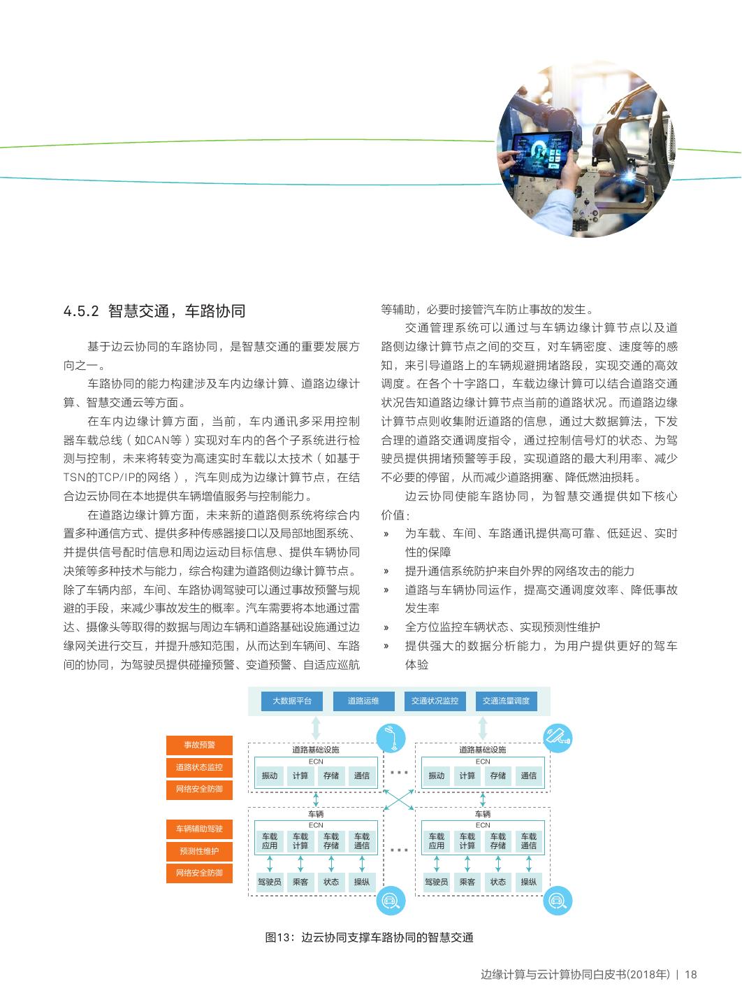 21 .4.5.2 智慧交通,车路协同 等辅助,必要时接管汽车防止事故的发生。 交通管理系统可以通过与车辆边缘计算节点以及道 基于边云协同的车路协同,是智慧交通的重要发展方 路侧边缘计算节点之间的交互,对车辆密度、速度等的感 向之一。 知,来引导道路上的车辆规避拥堵路段,实现交通的高效 车路协同的能力构建涉及车内边缘计算、道路边缘计 调度。在各个十字路口,车载边缘计算可以结合道路交通 算、智慧交通云等方面。 状况告知道路边缘计算节点当前的道路状况。而道路边缘 在车内边缘计算方面,当前,车内通讯多采用控制 计算节点则收集附近道路的信息,通过大数据算法,下发 器车载总线(如CAN等)实现对车内的各个子系统进行检 合理的道路交通调度指令,通过控制信号灯的状态、为驾 测与控制,未来将转变为高速实时车载以太技术(如基于 驶员提供拥堵预警等手段,实现道路的最大利用率、减少 TSN的TCP/IP的网络),汽车则成为边缘计算节点,在结 不必要的停留,从而减少道路拥塞、降低燃油损耗。 合边云协同在本地提供车辆增值服务与控制能力。 边云协同使能车路协同,为智慧交通提供如下核心 在道路边缘计算方面,未来新的道路侧系统将综合内 价值: 置多种通信方式、提供多种传感器接口以及局部地图系统、 » 为车载、车间、车路通讯提供高可靠、低延迟、实时 并提供信号配时信息和周边运动目标信息、提供车辆协同 性的保障 决策等多种技术与能力,综合构建为道路侧边缘计算节点。 » 提升通信系统防护来自外界的网络攻击的能力 除了车辆内部,车间、车路协调驾驶可以通过事故预警与规 » 道路与车辆协同运作,提高交通调度效率、降低事故 避的手段,来减少事故发生的概率。汽车需要将本地通过雷 发生率 达、摄像头等取得的数据与周边车辆和道路基础设施通过边 » 全方位监控车辆状态、实现预测性维护 缘网关进行交互,并提升感知范围,从而达到车辆间、车路 » 提供强大的数据分析能力,为用户提供更好的驾车 间的协同,为驾驶员提供碰撞预警、变道预警、自适应巡航 体验 大数据平台 道路运维 交通状况监控 交通流量调度 事故预警 道路基础设施 道路基础设施 ECN ECN 道路状态监控 振动 计算 存储 通信 … 振动 计算 存储 通信 网络安全防御 车辆 车辆 ECN ECN 车辆辅助驾驶 车载 车载 车载 车载 车载 车载 车载 车载 预测性维护 应用 计算 存储 通信 … 应用 计算 存储 通信 网络安全防御 驾驶员 乘客 状态 操纵 驾驶员 乘客 状态 操纵 图13:边云协同支撑车路协同的智慧交通 边缘计算与云计算协同白皮书(2018年) | 18