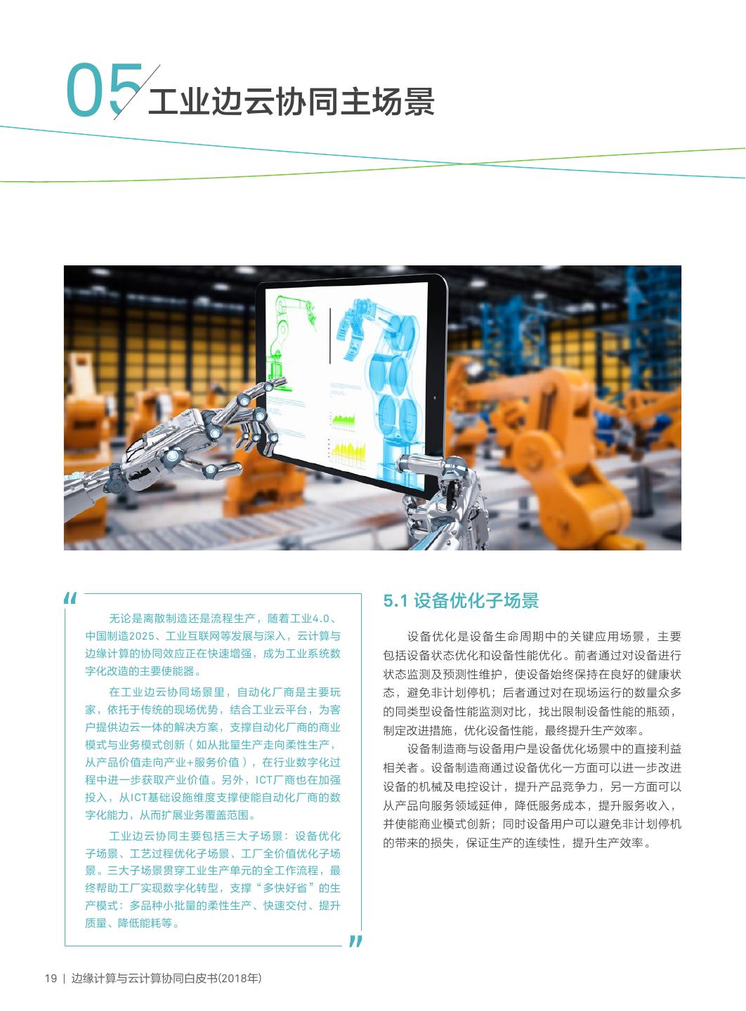 22 . 05工业边云协同主场景 5.1 设备优化子场景 无论是离散制造还是流程生产,随着工业4.0、 中国制造2025、工业互联网等发展与深入,云计算与 设备优化是设备生命周期中的关键应用场景,主要 边缘计算的协同效应正在快速增强,成为工业系统数 包括设备状态优化和设备性能优化。前者通过对设备进行 字化改造的主要使能器。 状态监测及预测性维护,使设备始终保持在良好的健康状 在工业边云协同场景里,自动化厂商是主要玩 态,避免非计划停机;后者通过对在现场运行的数量众多 家,依托于传统的现场优势,结合工业云平台,为客 的同类型设备性能监测对比,找出限制设备性能的瓶颈, 户提供边云一体的解决方案,支撑自动化厂商的商业 制定改进措施,优化设备性能,最终提升生产效率。 模式与业务模式创新(如从批量生产走向柔性生产, 设备制造商与设备用户是设备优化场景中的直接利益 从产品价值走向产业+服务价值),在行业数字化过 相关者。设备制造商通过设备优化一方面可以进一步改进 程中进一步获取产业价值。另外,ICT厂商也在加强 设备的机械及电控设计,提升产品竞争力,另一方面可以 投入,从ICT基础设施维度支撑使能自动化厂商的数 从产品向服务领域延伸,降低服务成本,提升服务收入, 字化能力,从而扩展业务覆盖范围。 并使能商业模式创新;同时设备用户可以避免非计划停机 工业边云协同主要包括三大子场景:设备优化 的带来的损失,保证生产的连续性,提升生产效率。 子场景、工艺过程优化子场景、工厂全价值优化子场 景。三大子场景贯穿工业生产单元的全工作流程,最 终帮助工厂实现数字化转型,支撑“多快好省”的生 产模式:多品种小批量的柔性生产、快速交付、提升 质量、降低能耗等。 19 | 边缘计算与云计算协同白皮书(2018年)