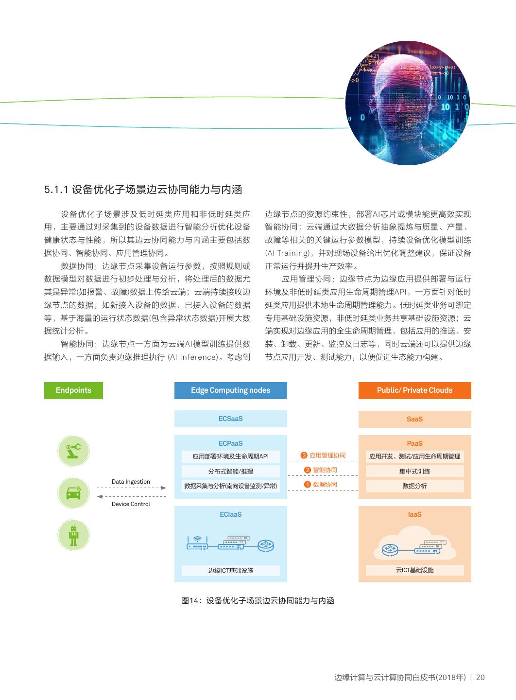 23 .5.1.1 设备优化子场景边云协同能力与内涵 设备优化子场景涉及低时延类应用和非低时延类应 边缘节点的资源约束性,部署AI芯片或模块能更高效实现 用,主要通过对采集到的设备数据进行智能分析优化设备 智能协同;云端通过大数据分析抽象提炼与质量、产量、 健康状态与性能,所以其边云协同能力与内涵主要包括数 故障等相关的关键运行参数模型,持续设备优化模型训练 据协同、智能协同、应用管理协同。 (AI Training),并对现场设备给出优化调整建议,保证设备 数据协同:边缘节点采集设备运行参数,按照规则或 正常运行并提升生产效率。 数据模型对数据进行初步处理与分析,将处理后的数据尤 应用管理协同:边缘节点为边缘应用提供部署与运行 其是异常(如报警、故障)数据上传给云端;云端持续接收边 环境及非低时延类应用生命周期管理API,一方面针对低时 缘节点的数据,如新接入设备的数据、已接入设备的数据 延类应用提供本地生命周期管理能力。低时延类业务可绑定 等,基于海量的运行状态数据(包含异常状态数据)开展大数 专用基础设施资源,非低时延类业务共享基础设施资源;云 据统计分析。 端实现对边缘应用的全生命周期管理,包括应用的推送、安 智能协同:边缘节点一方面为云端AI模型训练提供数 装、卸载、更新、监控及日志等,同时云端还可以提供边缘 据输入,一方面负责边缘推理执行 (AI Inference)。考虑到 节点应用开发、测试能力,以便促进生态能力构建。 Endpoints Edge Computing nodes Public/ Private Clouds ECSaaS SaaS ECPaaS PaaS 应用部署环境及生命周期API 3 应用管理协同 应用开发、测试/应用生命周期管理 分布式智能/推理 2 智能协同 集中式训练 Data Ingestion 1 数据协同 数据采集与分析(南向设备监测/异常) 数据分析 Device Control ECIaaS IaaS 边缘ICT基础设施 云ICT基础设施 图14:设备优化子场景边云协同能力与内涵 边缘计算与云计算协同白皮书(2018年) | 20