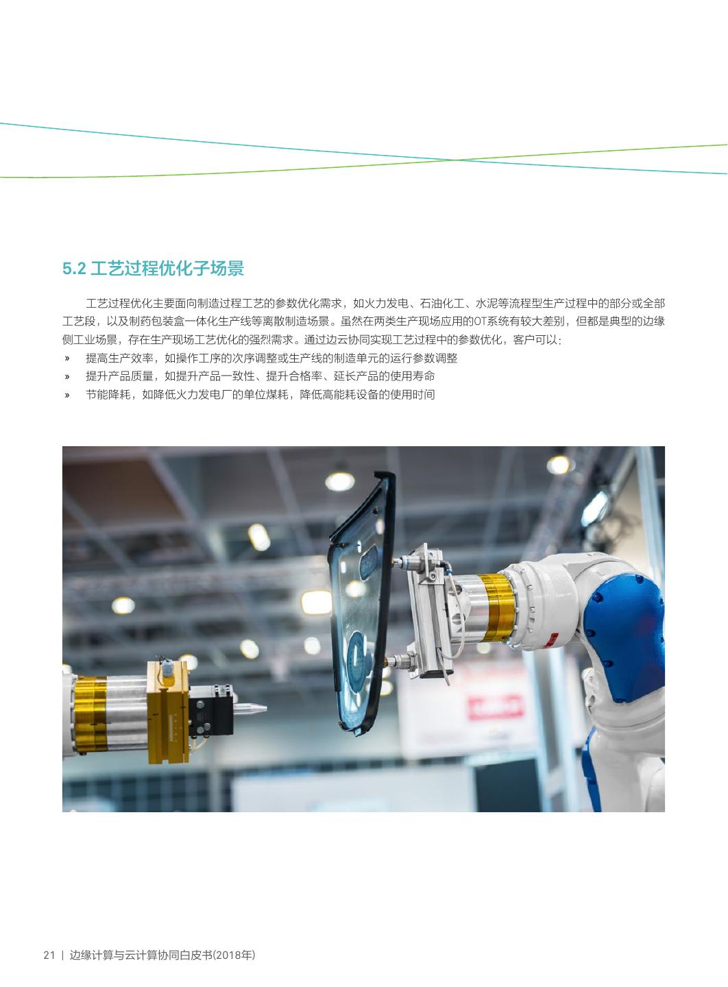 24 . 5.2 工艺过程优化子场景 工艺过程优化主要面向制造过程工艺的参数优化需求,如火力发电、石油化工、水泥等流程型生产过程中的部分或全部 工艺段,以及制药包装盒一体化生产线等离散制造场景。虽然在两类生产现场应用的OT系统有较大差别,但都是典型的边缘 侧工业场景,存在生产现场工艺优化的强烈需求。通过边云协同实现工艺过程中的参数优化,客户可以: » 提高生产效率,如操作工序的次序调整或生产线的制造单元的运行参数调整 » 提升产品质量,如提升产品一致性、提升合格率、延长产品的使用寿命 » 节能降耗,如降低火力发电厂的单位煤耗,降低高能耗设备的使用时间 21 | 边缘计算与云计算协同白皮书(2018年)