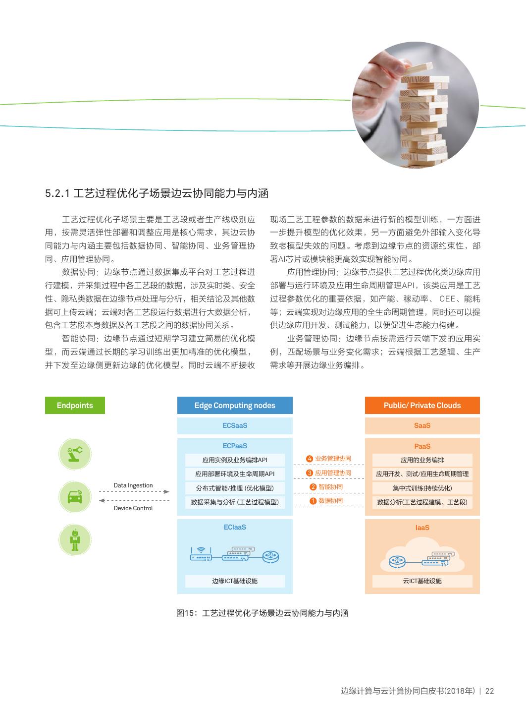25 .5.2.1 工艺过程优化子场景边云协同能力与内涵 工艺过程优化子场景主要是工艺段或者生产线级别应 现场工艺工程参数的数据来进行新的模型训练,一方面进 用,按需灵活弹性部署和调整应用是核心需求,其边云协 一步提升模型的优化效果,另一方面避免外部输入变化导 同能力与内涵主要包括数据协同、智能协同、业务管理协 致老模型失效的问题。考虑到边缘节点的资源约束性,部 同、应用管理协同。 署AI芯片或模块能更高效实现智能协同。 数据协同:边缘节点通过数据集成平台对工艺过程进 应用管理协同:边缘节点提供工艺过程优化类边缘应用 行建模,并采集过程中各工艺段的数据,涉及实时类、安全 部署与运行环境及应用生命周期管理API,该类应用是工艺 性、隐私类数据在边缘节点处理与分析,相关结论及其他数 过程参数优化的重要依据,如产能、稼动率、 OEE、能耗 据可上传云端;云端对各工艺段运行数据进行大数据分析, 等;云端实现对边缘应用的全生命周期管理,同时还可以提 包含工艺段本身数据及各工艺段之间的数据协同关系。 供边缘应用开发、测试能力,以便促进生态能力构建。 智能协同:边缘节点通过短期学习建立简易的优化模 业务管理协同:边缘节点按需运行云端下发的应用实 型,而云端通过长期的学习训练出更加精准的优化模型, 例,匹配场景与业务变化需求;云端根据工艺逻辑、生产 并下发至边缘侧更新边缘的优化模型。同时云端不断接收 需求等开展边缘业务编排。 Endpoints Edge Computing nodes Public/ Private Clouds ECSaaS SaaS ECPaaS PaaS 应用实例及业务编排API 4 业务管理协同 应用的业务编排 应用部署环境及生命周期API 3 应用管理协同 应用开发、测试/应用生命周期管理 Data Ingestion 分布式智能/推理 (优化模型) 2 智能协同 集中式训练(持续优化) 数据采集与分析 (工艺过程模型) 1 数据协同 数据分析(工艺过程建模、工艺段) Device Control ECIaaS IaaS 边缘ICT基础设施 云ICT基础设施 图15:工艺过程优化子场景边云协同能力与内涵 边缘计算与云计算协同白皮书(2018年) | 22