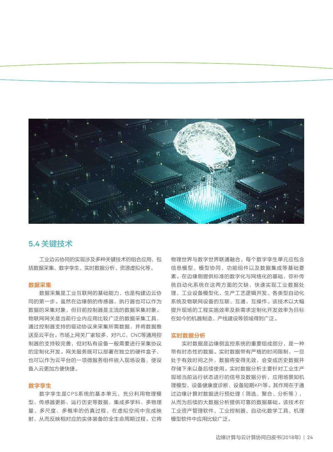 27 .5.4 关键技术 工业边云协同的实现涉及多种关键技术的组合应用,包 物理世界与数字世界联通融合,每个数字孪生单元应包含 括数据采集、数字孪生、实时数据分析、资源虚拟化等。 信息模型、模型协同、功能组件以及数据集成等基础要 素。在边缘侧提供标准的数字化与网络化的基础,弥补传 数据采集 统自动化系统在这两方面的欠缺,快速实现工业数据处 数据采集是工业互联网的基础能力,也是构建边云协 理、工业设备模型化、生产工艺逻辑开发、各类型自动化 同的第一步。虽然在边缘侧的传感器、执行器也可以作为 系统及物联网设备的互联、互通、互操作。该技术以大幅 数据的采集对象,但目前控制器是主流的数据采集对象。 提升现场的工程实施效率及新需求定制化开发效率为目标 物联网网关是当前行业内应用比较广泛的数据采集工具, 在如今的机器制造、产线建设等领域得到广泛。 通过控制器支持的驱动协议来采集所需数据,并将数据推 送至云平台。市场上网关厂家较多,对PLC、CNC等通用控 实时数据分析 制器的支持较完善,但对私有设备一般需要进行采集协议 实时数据是边缘侧监控系统的重要组成部分,是一种 的定制化开发。网关服务既可以部署在独立的硬件盒子, 带有时态性的数据。实时数据带有严格的时间限制,一旦 也可以作为云平台的一项微服务组件嵌入现场设备,使设 处于有效时间之外,数据将变得无效,会变成历史数据并 备入云更加方便快捷。 存储下来以备后续使用。实时数据分析主要针对工业生产 现场当前运行状态进行的信号及数据分析,应用场景如机 数字孪生 理模型、设备健康度诊断、设备短期KPI等。其作用在于通 数字孪生是CPS系统的基本单元,充分利用物理模 过边缘计算对数据进行预处理(筛选、聚合、分析等), 型、传感器更新、运行历史等数据,集成多学科、多物理 从而为后续的大数据分析提供可靠的数据基础。该技术在 量、多尺度、多概率的仿真过程,在虚拟空间中完成映 工业资产管理软件、工业控制器、自动化数学工具、机理 射,从而反映相对应的实体装备的全生命周期过程。它将 模型软件中应用比较广泛。 边缘计算与云计算协同白皮书(2018年) | 24