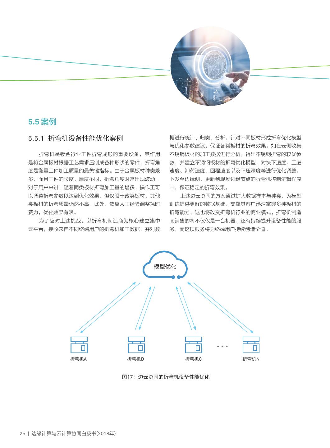 28 . 5.5 案例 5.5.1 折弯机设备性能优化案例 据进行统计、归类、分析,针对不同板材形成折弯优化模型 与优化参数建议,保证各类板材的折弯效果。如在云侧收集 折弯机是钣金行业工件折弯成形的重要设备,其作用 不锈钢板材的加工数据进行分析,得出不锈钢折弯的较优参 是将金属板材根据工艺需求压制成各种形状的零件,折弯角 数,并建立不锈钢板材的折弯优化模型,对快下速度、工进 度是衡量工件加工质量的最关键指标。由于金属板材种类繁 速度、卸荷速度、回程速度以及下压深度等进行优化调整, 多,而且工件的长度、厚度不同,折弯角度时常出现波动。 下发至边缘侧,更新到现场边缘节点的折弯机控制逻辑程序 对于用户来讲,随着同类板材折弯加工量的增多,操作工可 中,保证稳定的折弯效果。 以调整折弯参数以达到优化效果,但仅限于该类板材,其他 上述边云协同的方案通过扩大数据样本与种类,为模型 类板材的折弯质量仍然不高。此外,依靠人工经验调整耗时 训练提供更好的数据基础,支撑其客户迅速掌握多种板材的 费力,优化效果有限。 折弯能力。这也将改变折弯机行业的商业模式,折弯机制造 为了应对上述挑战,以折弯机制造商为核心建立集中 商销售的将不仅仅是一台机器,还有持续提升设备性能的服 云平台,接收来自不同终端用户的折弯机加工数据,并对数 务,而这项服务将为终端用户持续创造价值。 模型优化 折弯机A 折弯机B 折弯机C 折弯机N 图17:边云协同的折弯机设备性能优化 25 | 边缘计算与云计算协同白皮书(2018年)