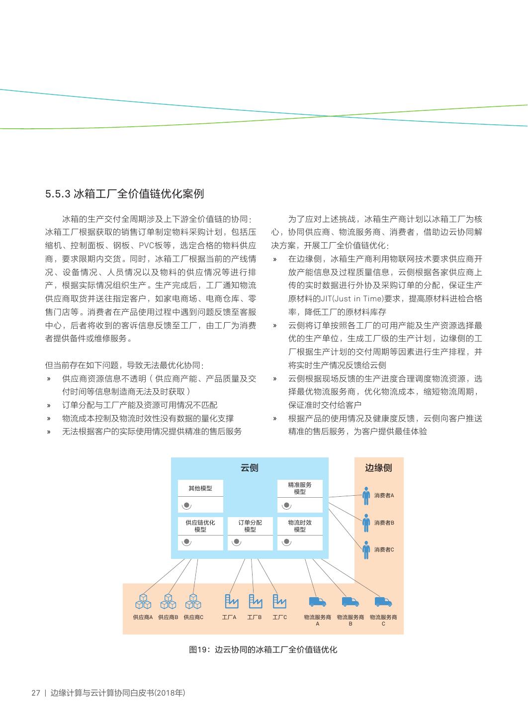 26 . 5.3 工厂全价值链优化子场景 智能工厂借助开放平台实现与上下游资源需求的无缝 所以该场景的边云协同能力与内涵主要包括数据协同、应 对接,打通工厂价值链上的各个环节,涵盖采购、生产、仓 用管理协同。 储、物流、服务等,彻底打破当前各环节的业务相对独立、 数据协同:边缘节点主要负责数据采集,要求数据接 数据分散且无法有效利用的局面,从容应对在实现零库存目 口丰富性以采集供应商的生产产能、产品质量、制造商多 标、产品快速交付、大规模定制等诸多方面的严峻挑战。 工厂产能现状、物流商交付能力、客户设备使用习惯与设 对于大型企业,由于涉及更多的上下游生态链,以及 备使用状况等E2E关键指标信息,按照规则和数据模型对数 自身多工厂间的协调,该场景能力能更好的促进其生态链 据做初步分析处理,将处理结果上传至云端进行持续的模 优化;对于中小型企业,该场景能力能够帮助其快速构建 型训练;云端开展供应链优化模型、订单分配优化模型、 上下游生态能力,并融入大企业生态链。 物流优化模型、精准服务优化模型等模型的持续训练与优 化,从而给出供应商选择、工厂选择、物流选择及客户服 5.3.1 工厂全价值链优化子场景边云协同能 务等决策建议。 力与内涵 应用管理协同:边缘节点提供信息综合采集类应用部 署与运行环境及应用生命周期管理API,如供应链、生产 工厂全价值链优化子场景通过对上下游全价值链的全 现场、物流服务等应用;云端负责边缘应用的生命周期管 局信息与资源的掌握,结合AI技术实现智能化全局优化, 理,并对具体应用的优化提供优化策略与建议。 Endpoints Edge Computing nodes Public/ Private Clouds ECSaaS SaaS ECPaaS PaaS 应用部署环境及生命周期API 2 应用管理协同 应用开发、测试/应用生命周期管理 1 数据协同 数据分析 Data Ingestion 数据采集与分析(上下游生态链数据) (供应链、订单、物流等优化模型) Device Control ECIaaS IaaS 边缘ICT基础设施 云ICT基础设施 图16:工厂全价值链优化子场景边云协同能力与内涵 23 | 边缘计算与云计算协同白皮书(2018年)
