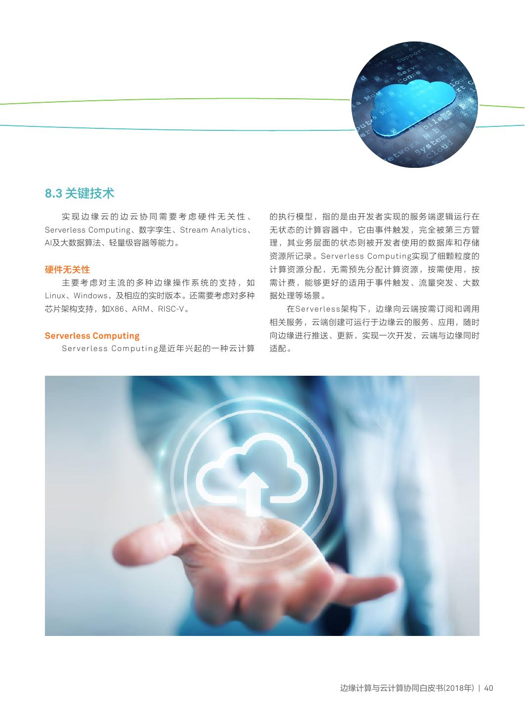 19 .的算力要求要小得多,可以在云端与边缘/终端完成。 拟机,容器拥有更高的资源使用效率,因为它并不需要为 AI发展的初期,由于边缘/终端设备的算力普遍有 每个应用分配单独的操作系统——实例规模更小、创建和 限,模型训练与推断大都在云端服务器上完成。由于边 迁移速度也更快,这意味相比于虚拟机,单个操作系统能 缘计算的CROSS价值及其快速发展,部分厂商已经推出 够承载更多的容器。 了可用于边缘推理(Edge Inference)的边缘AI芯片,如谷 云提供商十分热衷于容器技术,因为在相同的硬件设 歌2018年推出Edge TPU,华为海思2018年推出Ascend 备当中,可以部署数量更多的容器实例。此外,容器易于 310芯片。 迁移,但是只能被迁移到具有兼容操作系统内核的其他服 随着智能推理从云端下沉到边缘节点,预计智能边缘 务器当中,这样也会给迁移选择带来一定限制。 计算将得到快速发展。 虚拟机与容器技术 轻量级EC-PaaS类 虚拟化技术已经成为一种被大家广泛认可的服务器资 源共享方式,由于hypervisor虚拟化技术仍然存在一些性 流分析 能和资源使用效率方面的问题,因此出现了一种称为容器 流分析是一种新兴的技术,具备在数据流的移动过程 (Container)的新型虚拟化技术来帮助解决这些问题。 中持续性的统计计算分析,允许对实时流数据进行管理、 虚拟机会将虚拟硬件、内核(即操作系统)以及用户 监控和实时分析,涉及在任何时刻了解和处理业务中发生 空间打包在新虚拟机当中,虚拟机能够利用“虚拟机管理 的事件(Event),可以在数据失去价值之前在一个小机会 程序”运行在物理设备之上。容器可以看成一个装好了一 窗内快速处理分析数据,特别适用于物联网场景。 组特定应用的虚拟机,它直接利用了宿主机的内核,抽象 流分析的大型企业参与者包括微软、华为、SAP、 层比虚拟机更少,更加轻量化,启动速度极快。相比于虚 IBM、Software AG等。 边缘计算与云计算协同白皮书(2018年) | 16