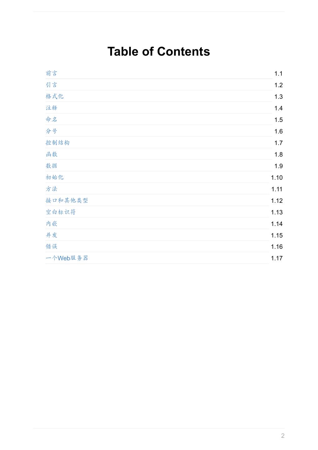 2 . Table of Contents 前言 1.1 引言 1.2 格式化 1.3 注释 1.4 命名 1.5 分号 1.6 控制结构 1.7 函数 1.8 数据 1.9 初始化 1.10 方法 1.11 接口和其他类型 1.12 空白标识符 1.13 内嵌 1.14 并发 1.15 错误 1.16 一个Web服务器 1.17 2