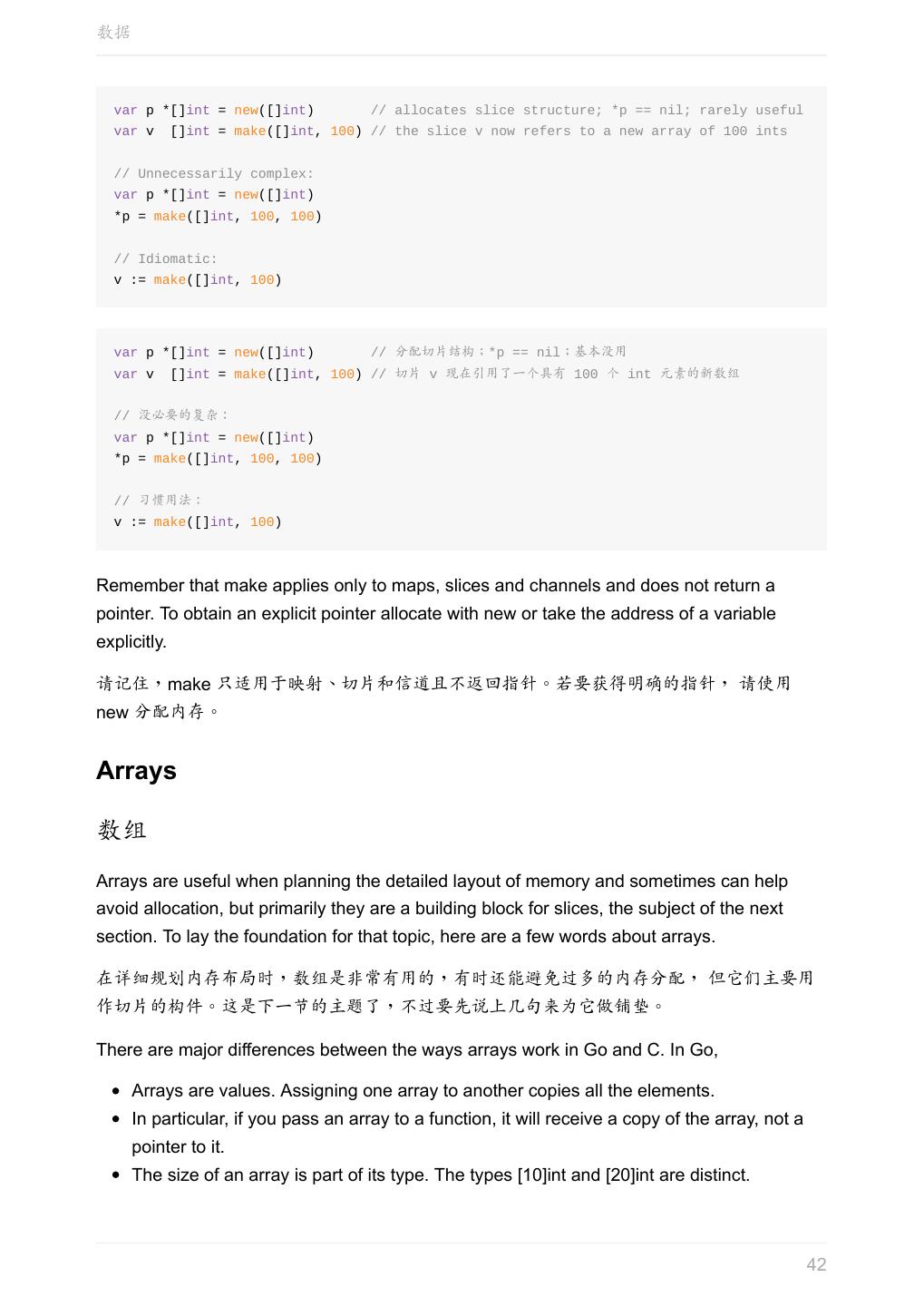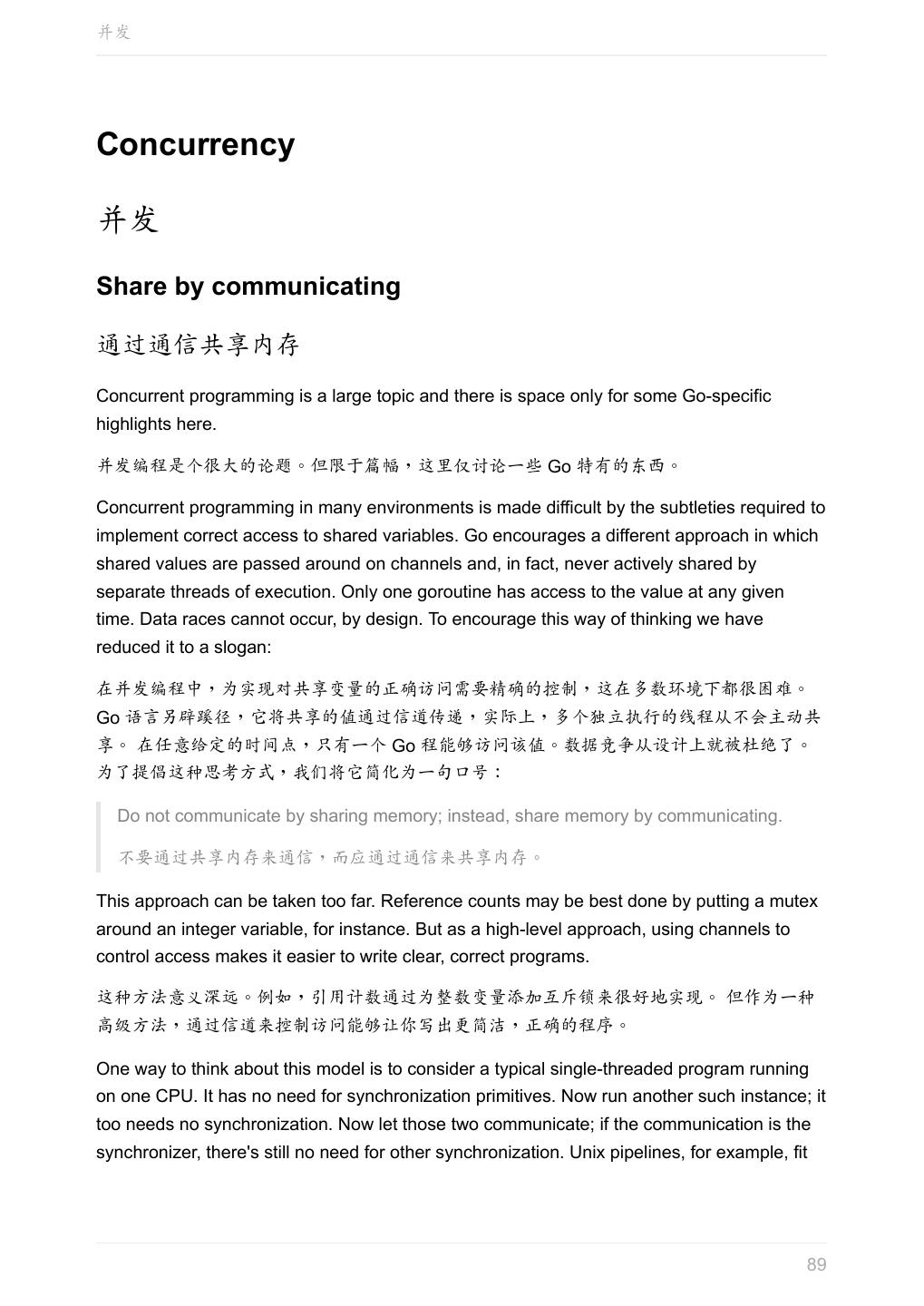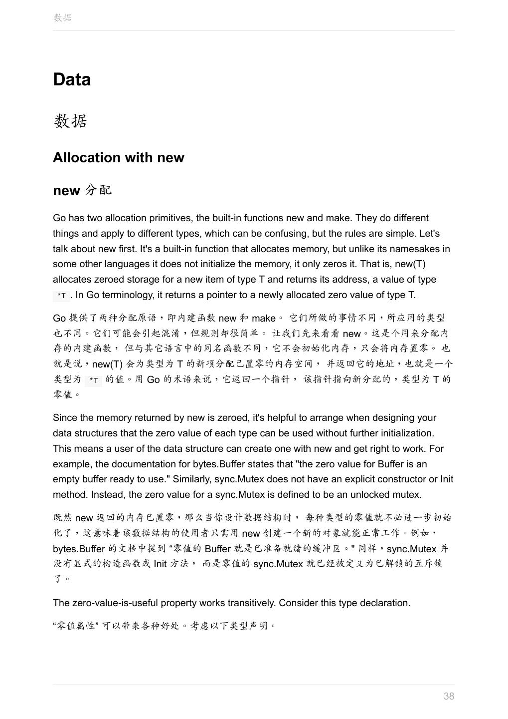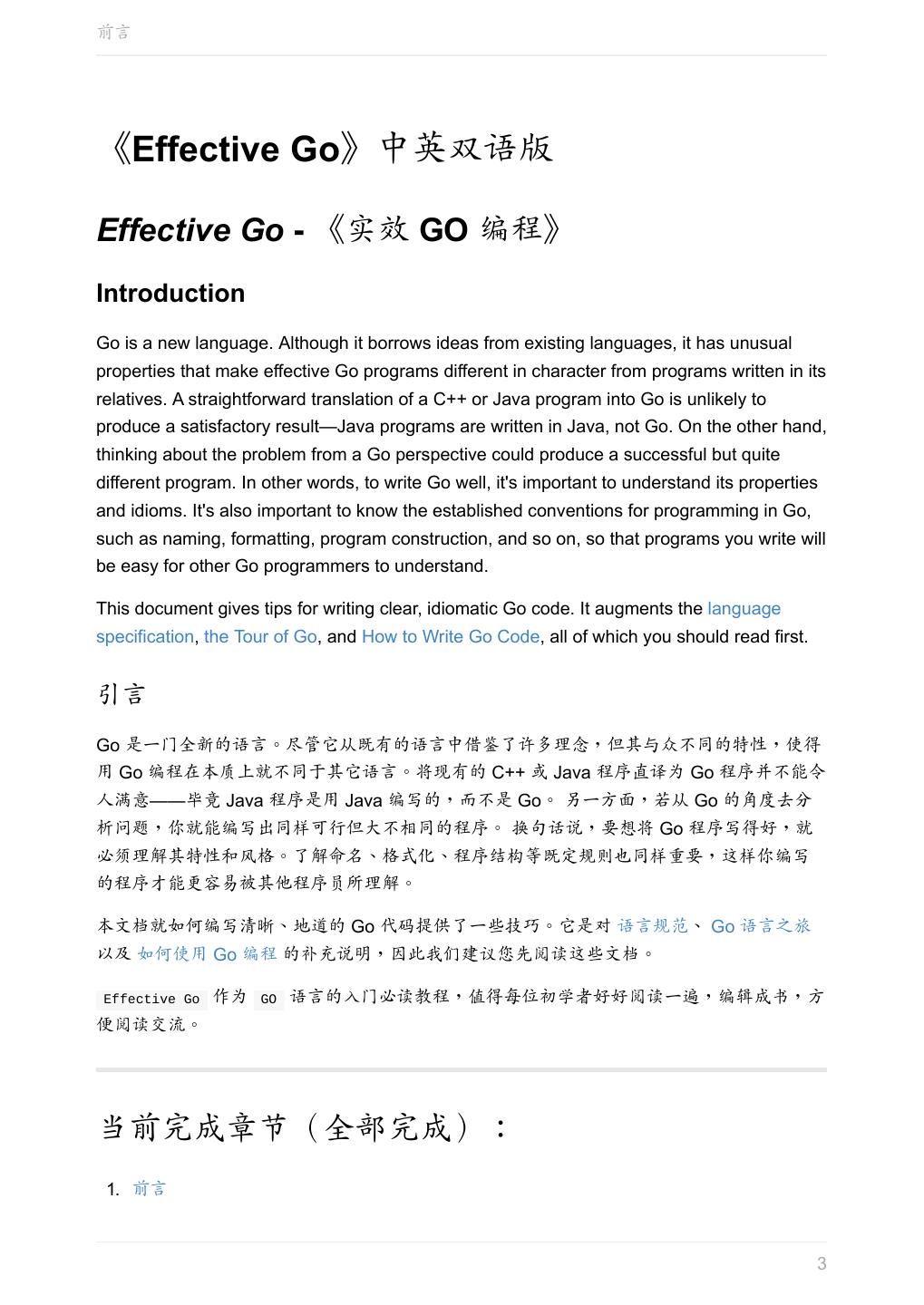 3 .前言 《Effective Go》中英双语版 Effective Go - 《实效 GO 编程》 Introduction Go is a new language. Although it borrows ideas from existing languages, it has unusual properties that make effective Go programs different in character from programs written in its relatives. A straightforward translation of a C++ or Java program into Go is unlikely to produce a satisfactory result—Java programs are written in Java, not Go. On the other hand, thinking about the problem from a Go perspective could produce a successful but quite different program. In other words, to write Go well, it's important to understand its properties and idioms. It's also important to know the established conventions for programming in Go, such as naming, formatting, program construction, and so on, so that programs you write will be easy for other Go programmers to understand. This document gives tips for writing clear, idiomatic Go code. It augments the language specification, the Tour of Go, and How to Write Go Code, all of which you should read first. 引言 Go 是一门全新的语言。尽管它从既有的语言中借鉴了许多理念,但其与众不同的特性,使得 用 Go 编程在本质上就不同于其它语言。将现有的 C++ 或 Java 程序直译为 Go 程序并不能令 人满意——毕竟 Java 程序是用 Java 编写的,而不是 Go。 另一方面,若从 Go 的角度去分 析问题,你就能编写出同样可行但大不相同的程序。 换句话说,要想将 Go 程序写得好,就 必须理解其特性和风格。了解命名、格式化、程序结构等既定规则也同样重要,这样你编写 的程序才能更容易被其他程序员所理解。 本文档就如何编写清晰、地道的 Go 代码提供了一些技巧。它是对 语言规范、 Go 语言之旅 以及 如何使用 Go 编程 的补充说明,因此我们建议您先阅读这些文档。 Effective Go 作为 GO 语言的入门必读教程,值得每位初学者好好阅读一遍,编辑成书,方 便阅读交流。 当前完成章节(全部完成): 1. 前言 3