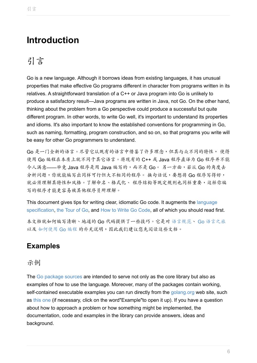 6 .引言 Introduction 引言 Go is a new language. Although it borrows ideas from existing languages, it has unusual properties that make effective Go programs different in character from programs written in its relatives. A straightforward translation of a C++ or Java program into Go is unlikely to produce a satisfactory result—Java programs are written in Java, not Go. On the other hand, thinking about the problem from a Go perspective could produce a successful but quite different program. In other words, to write Go well, it's important to understand its properties and idioms. It's also important to know the established conventions for programming in Go, such as naming, formatting, program construction, and so on, so that programs you write will be easy for other Go programmers to understand. Go 是一门全新的语言。尽管它从既有的语言中借鉴了许多理念,但其与众不同的特性, 使得 使用 Go 编程在本质上就不同于其它语言。将现有的 C++ 或 Java 程序直译为 Go 程序并不能 令人满意——毕竟 Java 程序是用 Java 编写的,而不是 Go。 另一方面,若从 Go 的角度去 分析问题,你就能编写出同样可行但大不相同的程序。 换句话说,要想将 Go 程序写得好, 就必须理解其特性和风格。了解命名、格式化、 程序结构等既定规则也同样重要,这样你编 写的程序才能更容易被其他程序员所理解。 This document gives tips for writing clear, idiomatic Go code. It augments the language specification, the Tour of Go, and How to Write Go Code, all of which you should read first. 本文档就如何编写清晰、地道的 Go 代码提供了一些技巧。它是对 语言规范、 Go 语言之旅 以及 如何使用 Go 编程 的补充说明,因此我们建议您先阅读这些文档。 Examples 示例 The Go package sources are intended to serve not only as the core library but also as examples of how to use the language. Moreover, many of the packages contain working, self-contained executable examples you can run directly from the golang.org web site, such as this one (if necessary, click on the word"Example"to open it up). If you have a question about how to approach a problem or how something might be implemented, the documentation, code and examples in the library can provide answers, ideas and background. 6