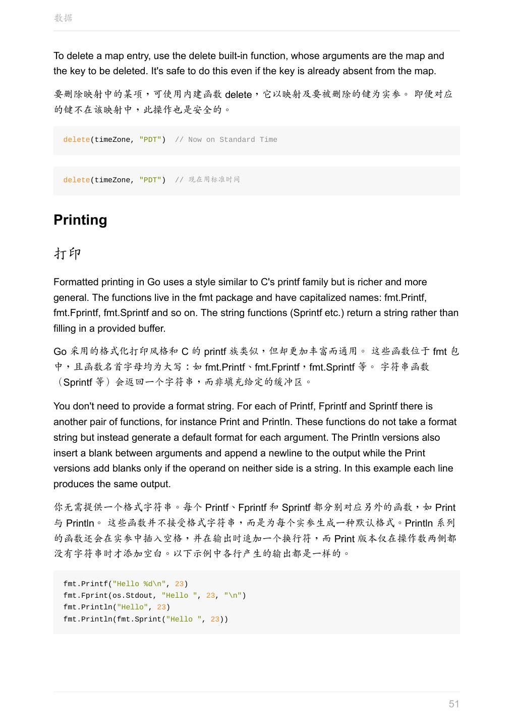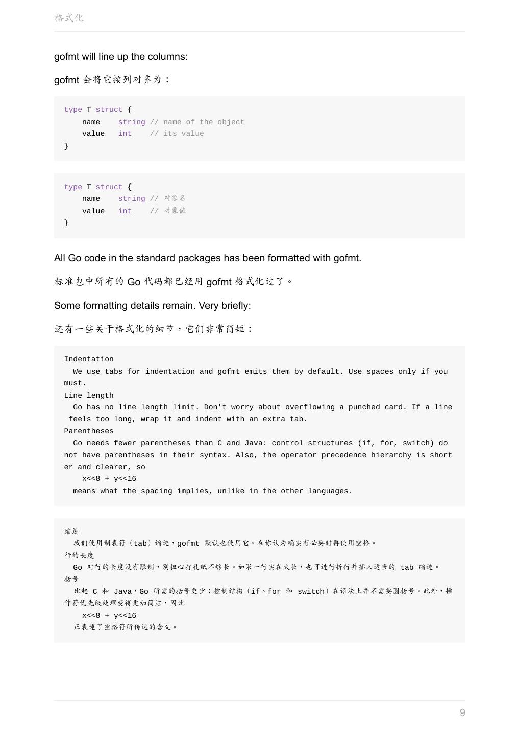 9 .格式化 gofmt will line up the columns: gofmt 会将它按列对齐为: type T struct { name string // name of the object value int // its value } type T struct { name string // 对象名 value int // 对象值 } All Go code in the standard packages has been formatted with gofmt. 标准包中所有的 Go 代码都已经用 gofmt 格式化过了。 Some formatting details remain. Very briefly: 还有一些关于格式化的细节,它们非常简短: Indentation We use tabs for indentation and gofmt emits them by default. Use spaces only if you must. Line length Go has no line length limit. Don't worry about overflowing a punched card. If a line feels too long, wrap it and indent with an extra tab. Parentheses Go needs fewer parentheses than C and Java: control structures (if, for, switch) do not have parentheses in their syntax. Also, the operator precedence hierarchy is short er and clearer, so x<<8 + y<<16 means what the spacing implies, unlike in the other languages. 缩进 我们使用制表符(tab)缩进,gofmt 默认也使用它。在你认为确实有必要时再使用空格。 行的长度 Go 对行的长度没有限制,别担心打孔纸不够长。如果一行实在太长,也可进行折行并插入适当的 tab 缩进。 括号 比起 C 和 Java,Go 所需的括号更少:控制结构(if、for 和 switch)在语法上并不需要圆括号。此外,操 作符优先级处理变得更加简洁,因此 x<<8 + y<<16 正表述了空格符所传达的含义。 9