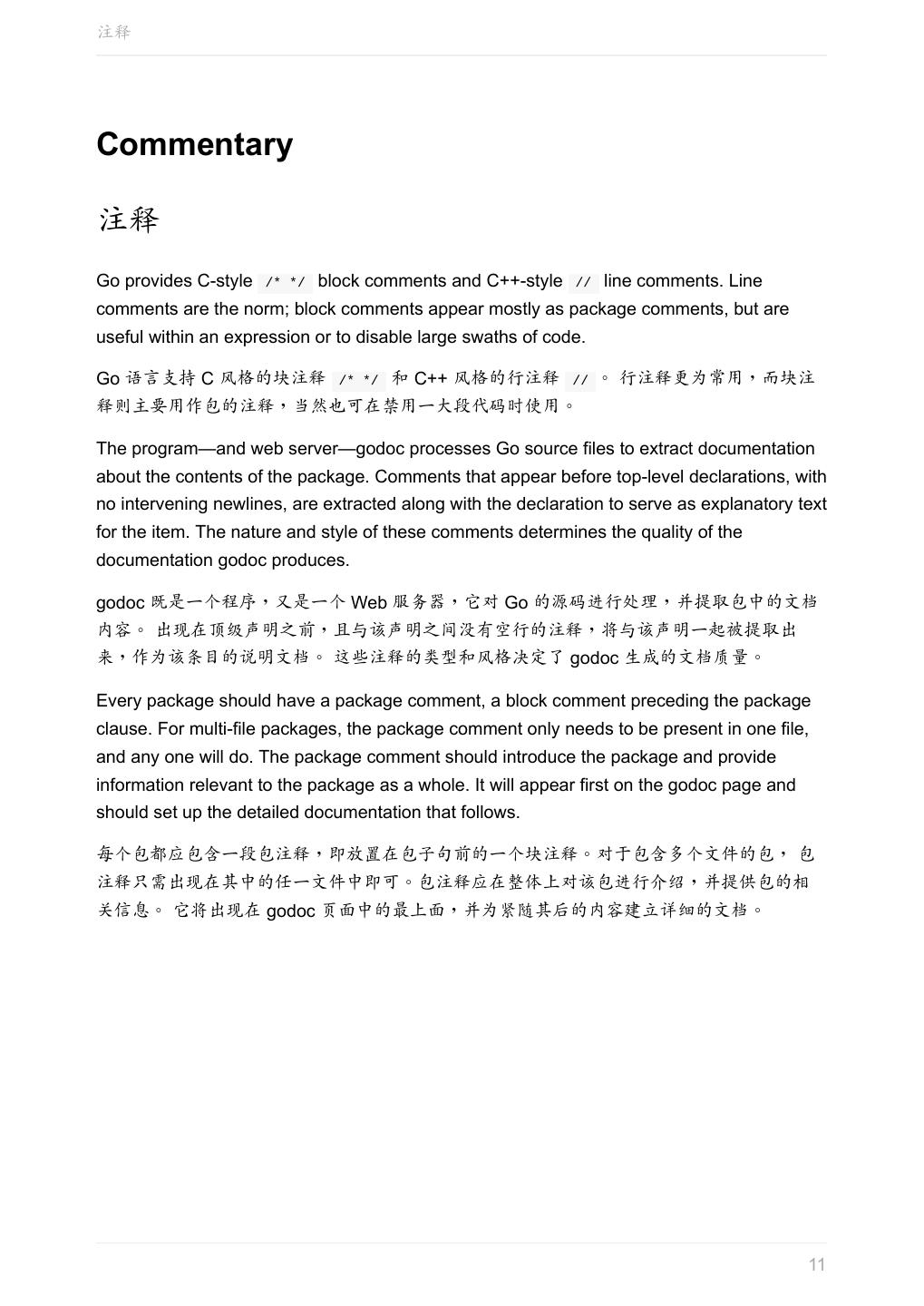 11 .注释 Commentary 注释 Go provides C-style /* */ block comments and C++-style // line comments. Line comments are the norm; block comments appear mostly as package comments, but are useful within an expression or to disable large swaths of code. Go 语言支持 C 风格的块注释 /* */ 和 C++ 风格的行注释 // 。 行注释更为常用,而块注 释则主要用作包的注释,当然也可在禁用一大段代码时使用。 The program—and web server—godoc processes Go source files to extract documentation about the contents of the package. Comments that appear before top-level declarations, with no intervening newlines, are extracted along with the declaration to serve as explanatory text for the item. The nature and style of these comments determines the quality of the documentation godoc produces. godoc 既是一个程序,又是一个 Web 服务器,它对 Go 的源码进行处理,并提取包中的文档 内容。 出现在顶级声明之前,且与该声明之间没有空行的注释,将与该声明一起被提取出 来,作为该条目的说明文档。 这些注释的类型和风格决定了 godoc 生成的文档质量。 Every package should have a package comment, a block comment preceding the package clause. For multi-file packages, the package comment only needs to be present in one file, and any one will do. The package comment should introduce the package and provide information relevant to the package as a whole. It will appear first on the godoc page and should set up the detailed documentation that follows. 每个包都应包含一段包注释,即放置在包子句前的一个块注释。对于包含多个文件的包, 包 注释只需出现在其中的任一文件中即可。包注释应在整体上对该包进行介绍,并提供包的相 关信息。 它将出现在 godoc 页面中的最上面,并为紧随其后的内容建立详细的文档。 11