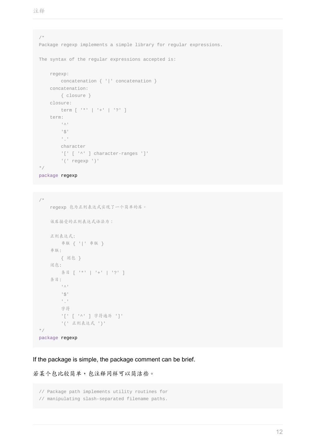 12 .注释 /* Package regexp implements a simple library for regular expressions. The syntax of the regular expressions accepted is: regexp: concatenation { '|' concatenation } concatenation: { closure } closure: term [ '*' | '+' | '?' ] term: '^' '$' '.' character '[' [ '^' ] character-ranges ']' '(' regexp ')' */ package regexp /* regexp 包为正则表达式实现了一个简单的库。 该库接受的正则表达式语法为: 正则表达式: 串联 { '|' 串联 } 串联: { 闭包 } 闭包: 条目 [ '*' | '+' | '?' ] 条目: '^' '$' '.' 字符 '[' [ '^' ] 字符遍历 ']' '(' 正则表达式 ')' */ package regexp If the package is simple, the package comment can be brief. 若某个包比较简单,包注释同样可以简洁些。 // Package path implements utility routines for // manipulating slash-separated filename paths. 12