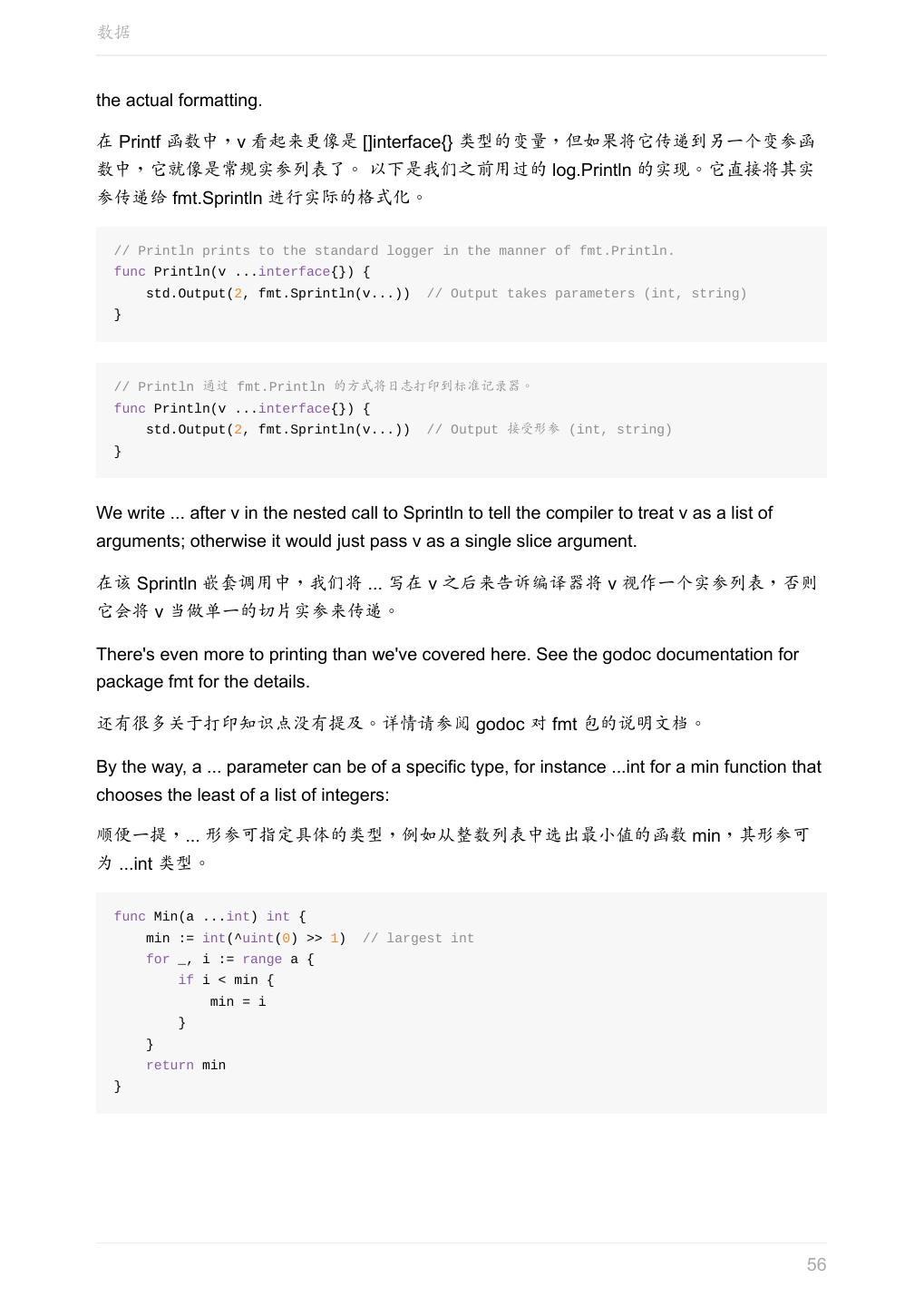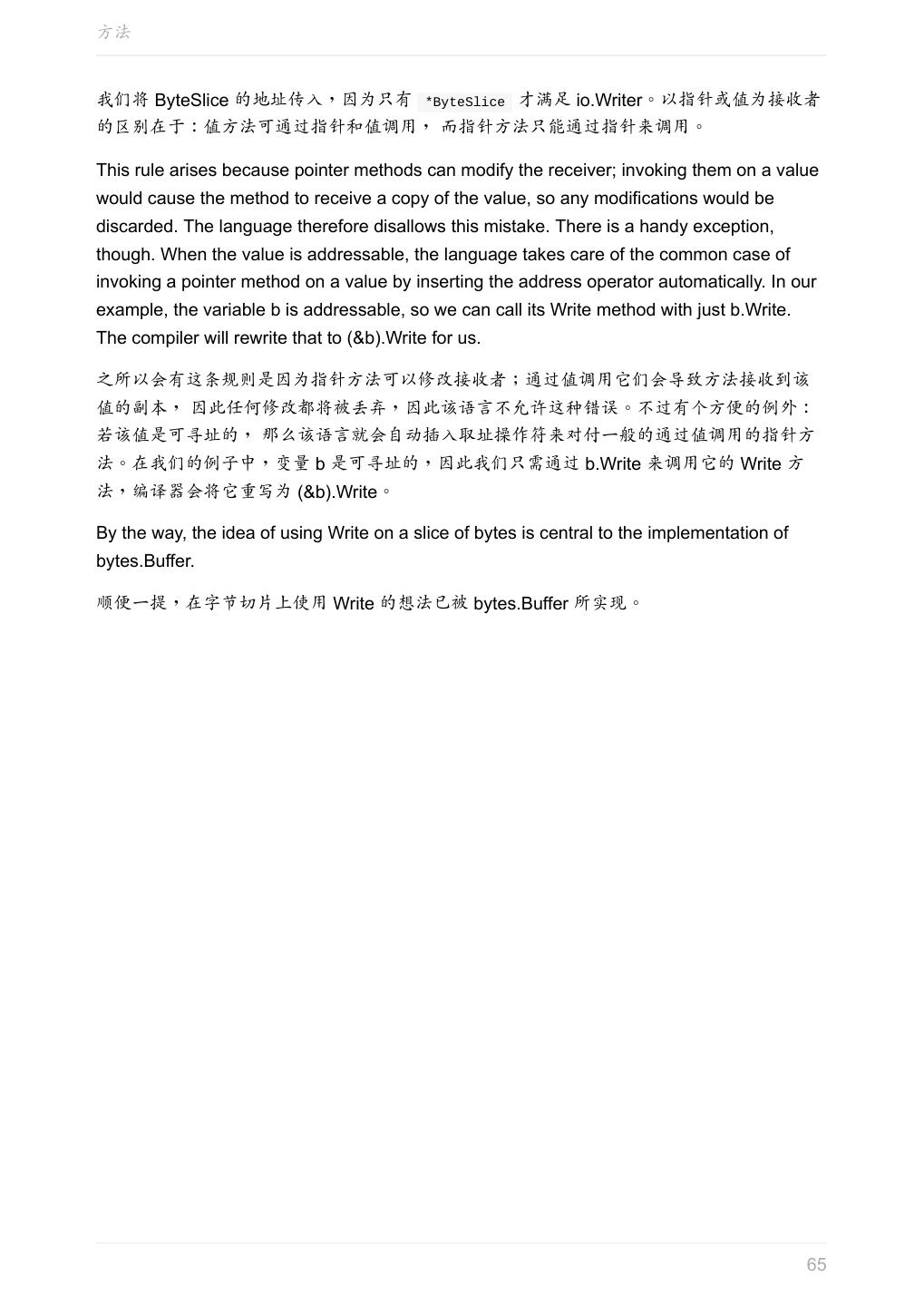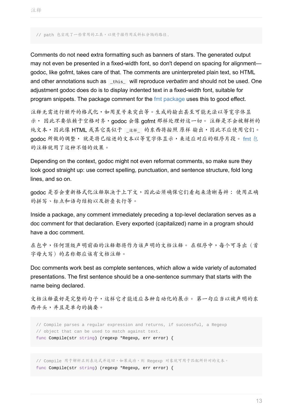 13 .注释 // path 包实现了一些常用的工具,以便于操作用反斜杠分隔的路径. Comments do not need extra formatting such as banners of stars. The generated output may not even be presented in a fixed-width font, so don't depend on spacing for alignment— godoc, like gofmt, takes care of that. The comments are uninterpreted plain text, so HTML and other annotations such as _this_ will reproduce verbatim and should not be used. One adjustment godoc does do is to display indented text in a fixed-width font, suitable for program snippets. The package comment for the fmt package uses this to good effect. 注释无需进行额外的格式化,如用星号来突出等。生成的输出甚至可能无法以等宽字体显 示, 因此不要依赖于空格对齐,godoc 会像 gofmt 那样处理好这一切。 注释是不会被解析的 纯文本,因此像 HTML 或其它类似于 _这样_ 的东西将按照 原样 输出,因此不应使用它们。 godoc 所做的调整, 就是将已缩进的文本以等宽字体显示,来适应对应的程序片段。 fmt 包 的注释就用了这种不错的效果。 Depending on the context, godoc might not even reformat comments, so make sure they look good straight up: use correct spelling, punctuation, and sentence structure, fold long lines, and so on. godoc 是否会重新格式化注释取决于上下文,因此必须确保它们看起来清晰易辨: 使用正确 的拼写、标点和语句结构以及折叠长行等。 Inside a package, any comment immediately preceding a top-level declaration serves as a doc comment for that declaration. Every exported (capitalized) name in a program should have a doc comment. 在包中,任何顶级声明前面的注释都将作为该声明的文档注释。 在程序中,每个可导出(首 字母大写)的名称都应该有文档注释。 Doc comments work best as complete sentences, which allow a wide variety of automated presentations. The first sentence should be a one-sentence summary that starts with the name being declared. 文档注释最好是完整的句子,这样它才能适应各种自动化的展示。 第一句应当以被声明的东 西开头,并且是单句的摘要。 // Compile parses a regular expression and returns, if successful, a Regexp // object that can be used to match against text. func Compile(str string) (regexp *Regexp, err error) { // Compile 用于解析正则表达式并返回,如果成功,则 Regexp 对象就可用于匹配所针对的文本。 func Compile(str string) (regexp *Regexp, err error) { 13