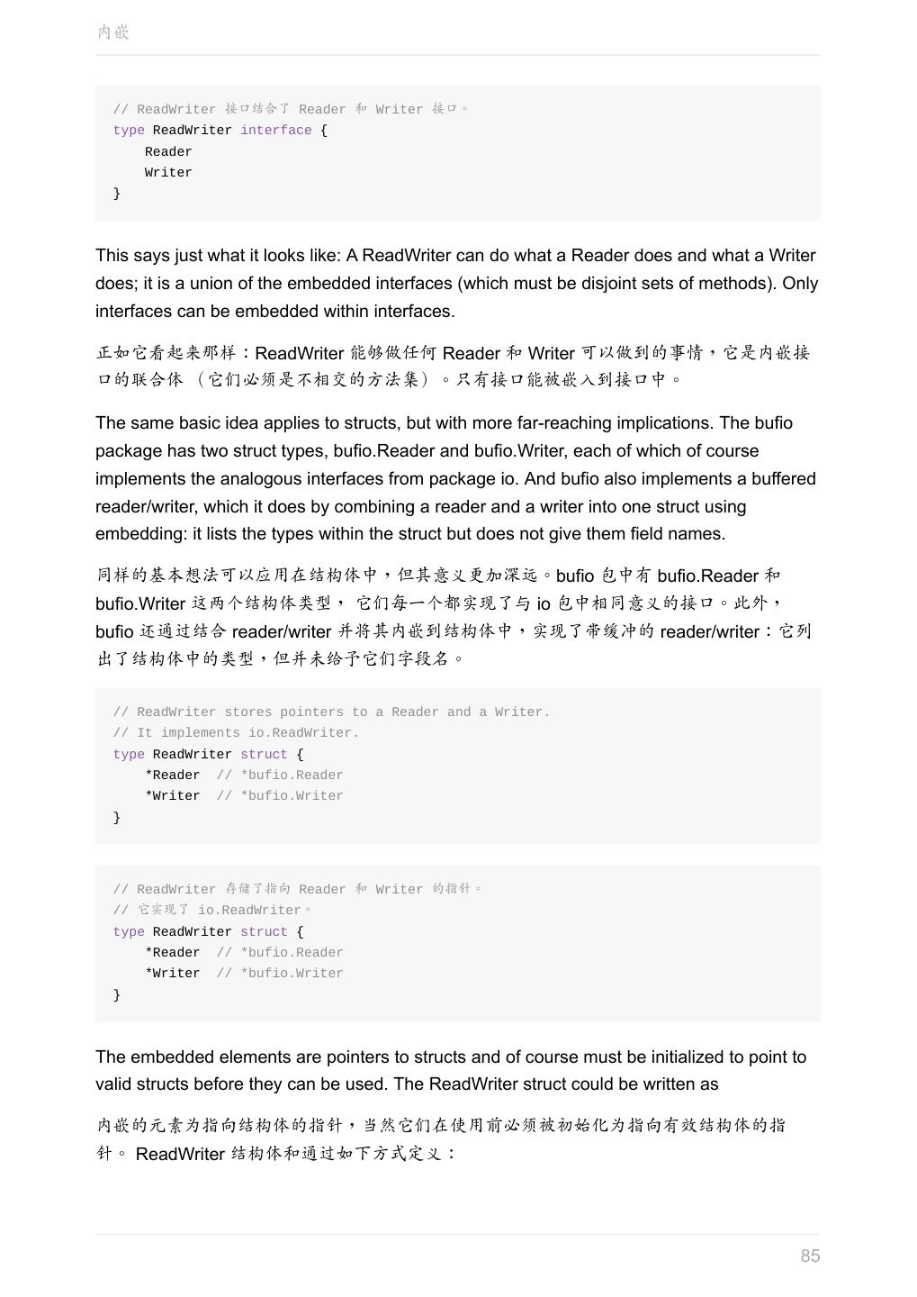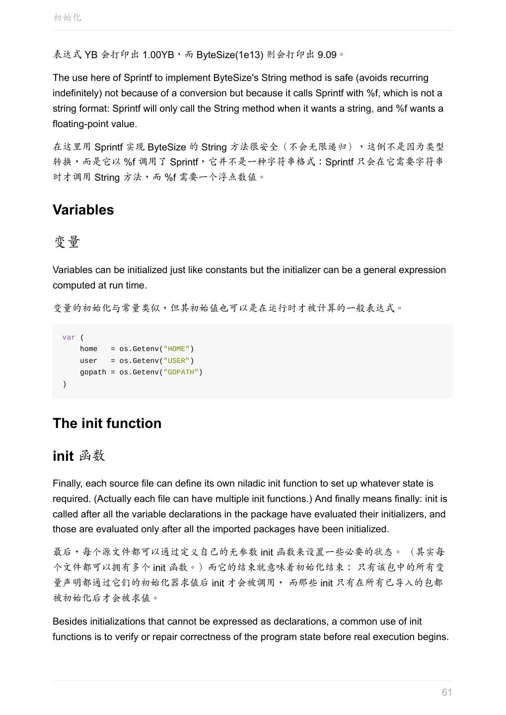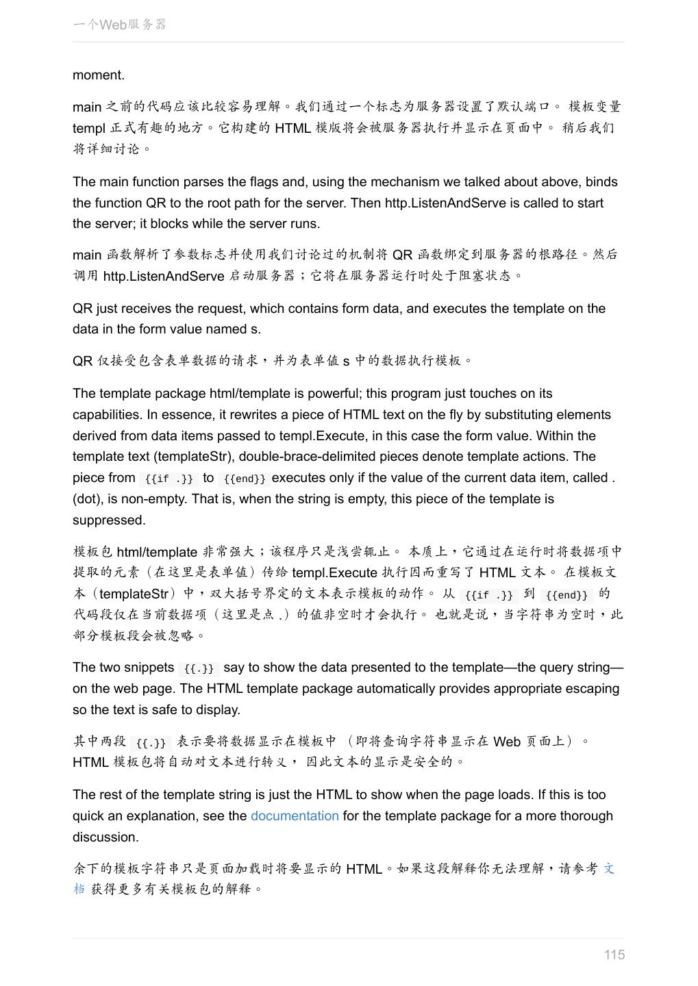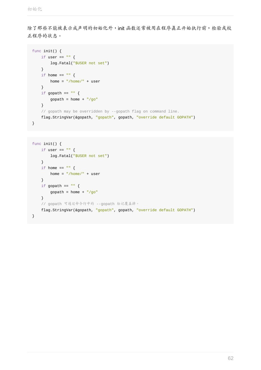 13 .注释 // path 包实现了一些常用的工具,以便于操作用反斜杠分隔的路径. Comments do not need extra formatting such as banners of stars. The generated output may not even be presented in a fixed-width font, so don't depend on spacing for alignment— godoc, like gofmt, takes care of that. The comments are uninterpreted plain text, so HTML and other annotations such as _this_ will reproduce verbatim and should not be used. One adjustment godoc does do is to display indented text in a fixed-width font, suitable for program snippets. The package comment for the fmt package uses this to good effect. 注释无需进行额外的格式化,如用星号来突出等。生成的输出甚至可能无法以等宽字体显 示, 因此不要依赖于空格对齐,godoc 会像 gofmt 那样处理好这一切。 注释是不会被解析的 纯文本,因此像 HTML 或其它类似于 _这样_ 的东西将按照 原样 输出,因此不应使用它们。 godoc 所做的调整, 就是将已缩进的文本以等宽字体显示,来适应对应的程序片段。 fmt 包 的注释就用了这种不错的效果。 Depending on the context, godoc might not even reformat comments, so make sure they look good straight up: use correct spelling, punctuation, and sentence structure, fold long lines, and so on. godoc 是否会重新格式化注释取决于上下文,因此必须确保它们看起来清晰易辨: 使用正确 的拼写、标点和语句结构以及折叠长行等。 Inside a package, any comment immediately preceding a top-level declaration serves as a doc comment for that declaration. Every exported (capitalized) name in a program should have a doc comment. 在包中,任何顶级声明前面的注释都将作为该声明的文档注释。 在程序中,每个可导出(首 字母大写)的名称都应该有文档注释。 Doc comments work best as complete sentences, which allow a wide variety of automated presentations. The first sentence should be a one-sentence summary that starts with the name being declared. 文档注释最好是完整的句子,这样它才能适应各种自动化的展示。 第一句应当以被声明的东 西开头,并且是单句的摘要。 // Compile parses a regular expression and returns, if successful, a Regexp // object that can be used to match against text. func Compile(str string) (regexp *Regexp, err error) { // Compile 用于解析正则表达式并返回,如果成功,则 Regexp 对象就可用于匹配所针对的文本。 func Compile(str string) (regexp *Regexp, err error) { 13