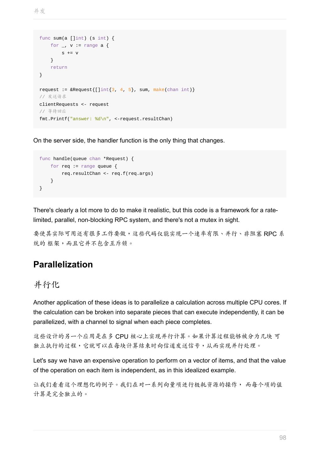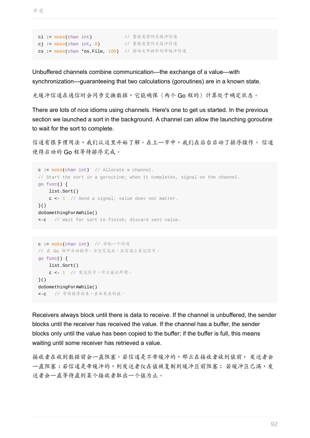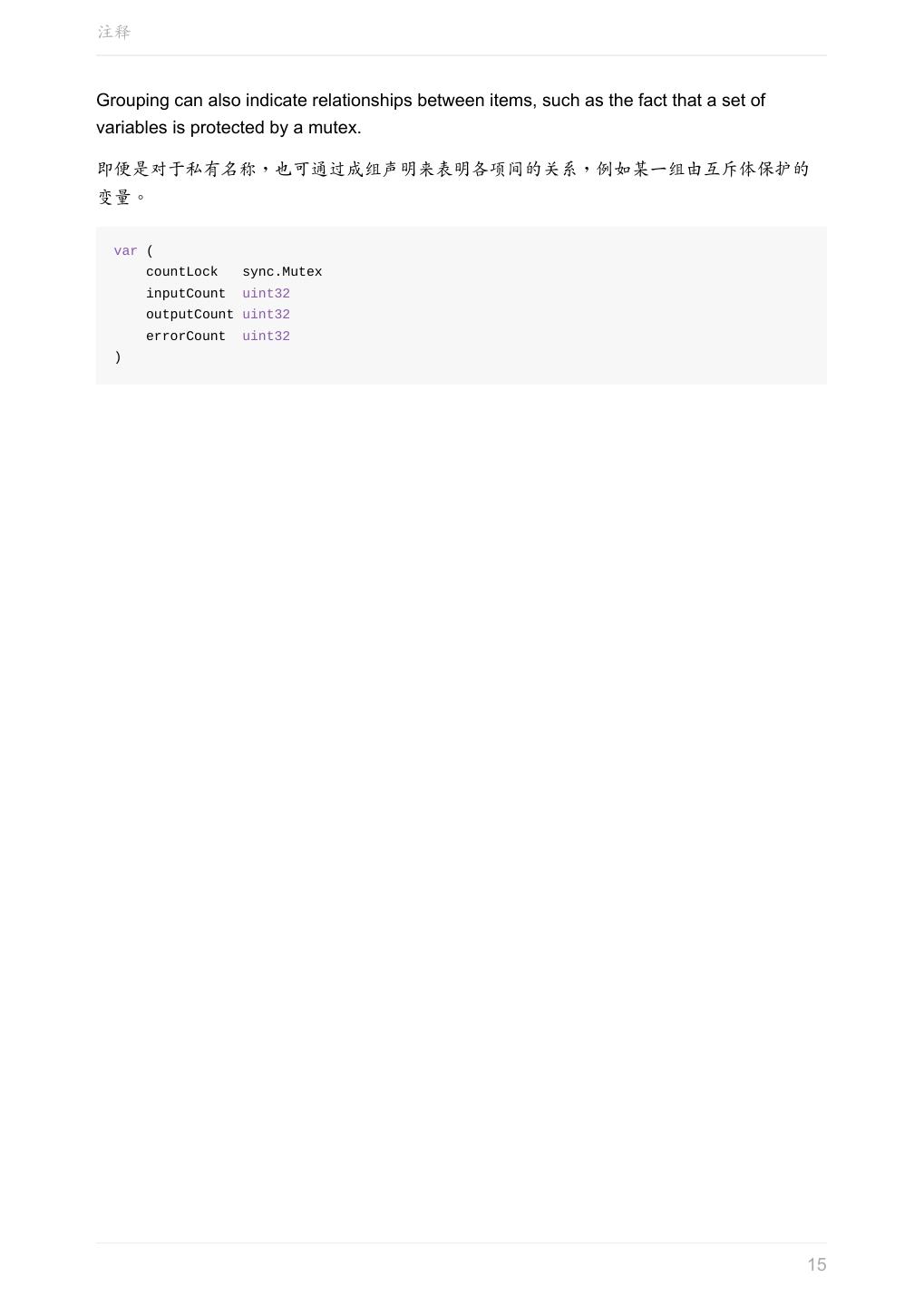 15 .注释 Grouping can also indicate relationships between items, such as the fact that a set of variables is protected by a mutex. 即便是对于私有名称,也可通过成组声明来表明各项间的关系,例如某一组由互斥体保护的 变量。 var ( countLock sync.Mutex inputCount uint32 outputCount uint32 errorCount uint32 ) 15