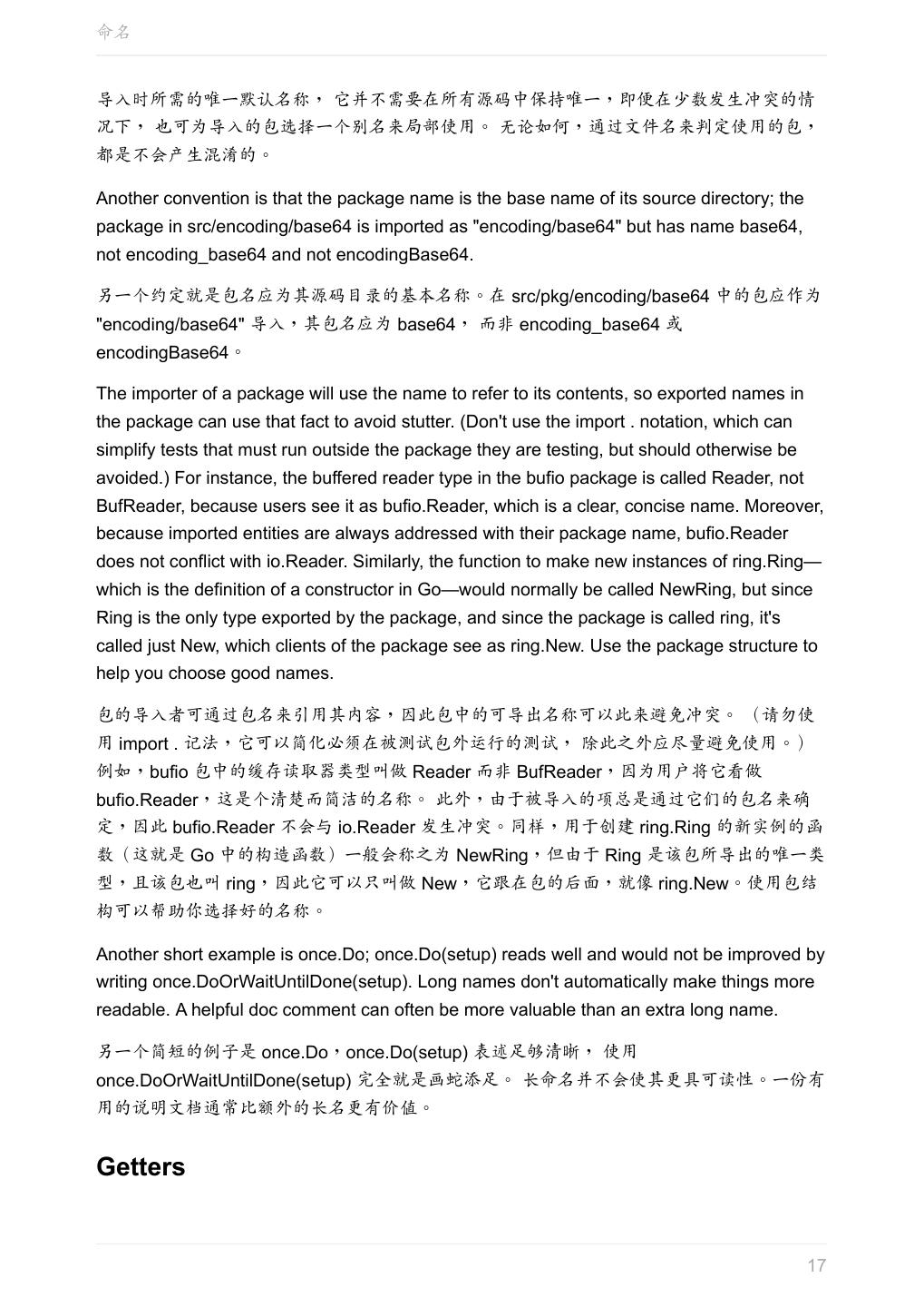 17 .命名 导入时所需的唯一默认名称, 它并不需要在所有源码中保持唯一,即便在少数发生冲突的情 况下, 也可为导入的包选择一个别名来局部使用。 无论如何,通过文件名来判定使用的包, 都是不会产生混淆的。 Another convention is that the package name is the base name of its source directory; the package in src/encoding/base64 is imported as "encoding/base64" but has name base64, not encoding_base64 and not encodingBase64. 另一个约定就是包名应为其源码目录的基本名称。在 src/pkg/encoding/base64 中的包应作为 "encoding/base64" 导入,其包名应为 base64, 而非 encoding_base64 或 encodingBase64。 The importer of a package will use the name to refer to its contents, so exported names in the package can use that fact to avoid stutter. (Don't use the import . notation, which can simplify tests that must run outside the package they are testing, but should otherwise be avoided.) For instance, the buffered reader type in the bufio package is called Reader, not BufReader, because users see it as bufio.Reader, which is a clear, concise name. Moreover, because imported entities are always addressed with their package name, bufio.Reader does not conflict with io.Reader. Similarly, the function to make new instances of ring.Ring— which is the definition of a constructor in Go—would normally be called NewRing, but since Ring is the only type exported by the package, and since the package is called ring, it's called just New, which clients of the package see as ring.New. Use the package structure to help you choose good names. 包的导入者可通过包名来引用其内容,因此包中的可导出名称可以此来避免冲突。 (请勿使 用 import . 记法,它可以简化必须在被测试包外运行的测试, 除此之外应尽量避免使用。) 例如,bufio 包中的缓存读取器类型叫做 Reader 而非 BufReader,因为用户将它看做 bufio.Reader,这是个清楚而简洁的名称。 此外,由于被导入的项总是通过它们的包名来确 定,因此 bufio.Reader 不会与 io.Reader 发生冲突。同样,用于创建 ring.Ring 的新实例的函 数(这就是 Go 中的构造函数)一般会称之为 NewRing,但由于 Ring 是该包所导出的唯一类 型,且该包也叫 ring,因此它可以只叫做 New,它跟在包的后面,就像 ring.New。使用包结 构可以帮助你选择好的名称。 Another short example is once.Do; once.Do(setup) reads well and would not be improved by writing once.DoOrWaitUntilDone(setup). Long names don't automatically make things more readable. A helpful doc comment can often be more valuable than an extra long name. 另一个简短的例子是 once.Do,once.Do(setup) 表述足够清晰, 使用 once.DoOrWaitUntilDone(setup) 完全就是画蛇添足。 长命名并不会使其更具可读性。一份有 用的说明文档通常比额外的长名更有价值。 Getters 17