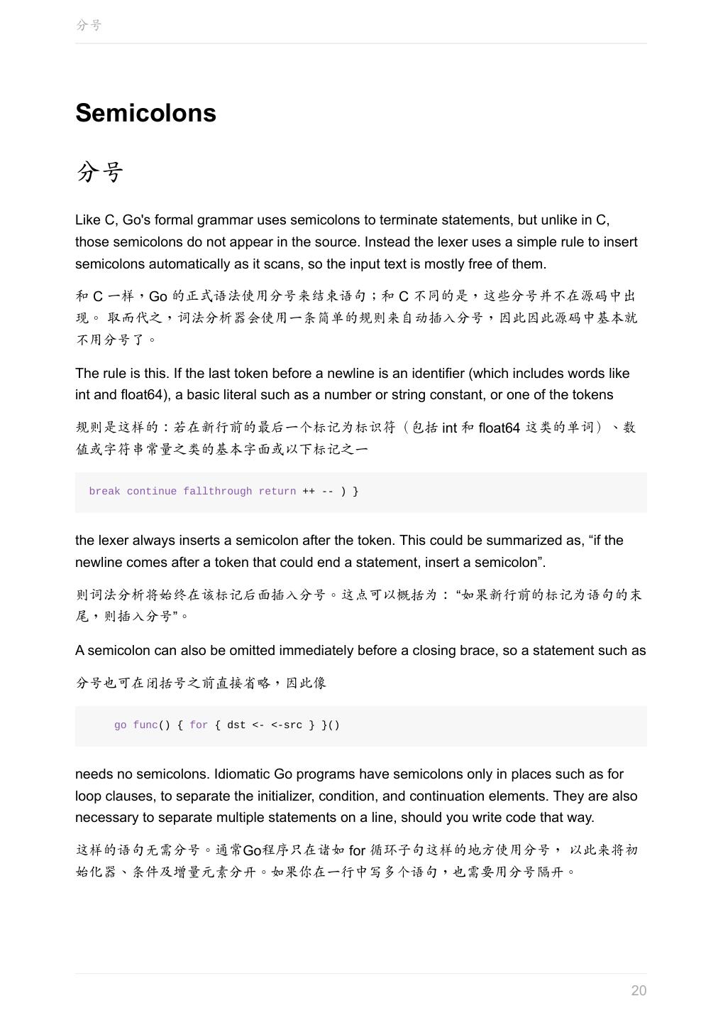 20 .分号 Semicolons 分号 Like C, Go's formal grammar uses semicolons to terminate statements, but unlike in C, those semicolons do not appear in the source. Instead the lexer uses a simple rule to insert semicolons automatically as it scans, so the input text is mostly free of them. 和 C 一样,Go 的正式语法使用分号来结束语句;和 C 不同的是,这些分号并不在源码中出 现。 取而代之,词法分析器会使用一条简单的规则来自动插入分号,因此因此源码中基本就 不用分号了。 The rule is this. If the last token before a newline is an identifier (which includes words like int and float64), a basic literal such as a number or string constant, or one of the tokens 规则是这样的:若在新行前的最后一个标记为标识符(包括 int 和 float64 这类的单词)、数 值或字符串常量之类的基本字面或以下标记之一 break continue fallthrough return ++ -- ) } the lexer always inserts a semicolon after the token. This could be summarized as, “if the newline comes after a token that could end a statement, insert a semicolon”. 则词法分析将始终在该标记后面插入分号。这点可以概括为: “如果新行前的标记为语句的末 尾,则插入分号”。 A semicolon can also be omitted immediately before a closing brace, so a statement such as 分号也可在闭括号之前直接省略,因此像 go func() { for { dst <- <-src } }() needs no semicolons. Idiomatic Go programs have semicolons only in places such as for loop clauses, to separate the initializer, condition, and continuation elements. They are also necessary to separate multiple statements on a line, should you write code that way. 这样的语句无需分号。通常Go程序只在诸如 for 循环子句这样的地方使用分号, 以此来将初 始化器、条件及增量元素分开。如果你在一行中写多个语句,也需要用分号隔开。 20