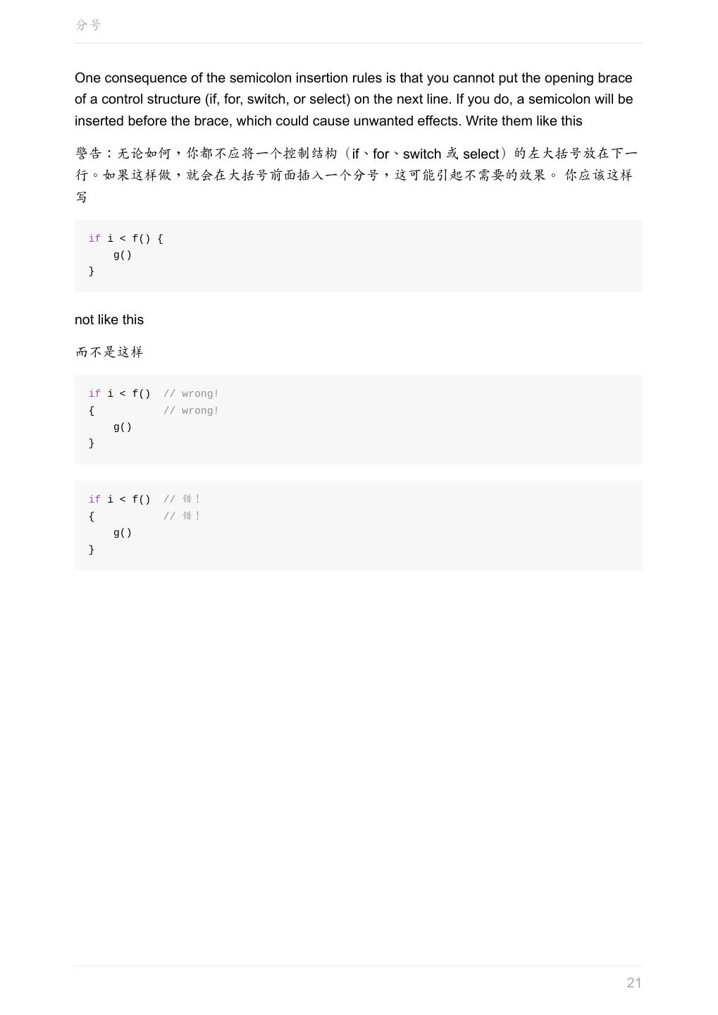 21 .分号 One consequence of the semicolon insertion rules is that you cannot put the opening brace of a control structure (if, for, switch, or select) on the next line. If you do, a semicolon will be inserted before the brace, which could cause unwanted effects. Write them like this 警告:无论如何,你都不应将一个控制结构(if、for、switch 或 select)的左大括号放在下一 行。如果这样做,就会在大括号前面插入一个分号,这可能引起不需要的效果。 你应该这样 写 if i < f() { g() } not like this 而不是这样 if i < f() // wrong! { // wrong! g() } if i < f() // 错! { // 错! g() } 21