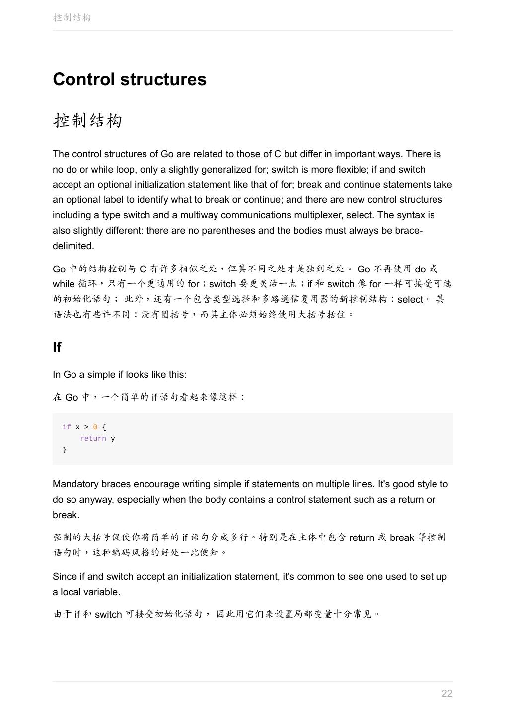22 .控制结构 Control structures 控制结构 The control structures of Go are related to those of C but differ in important ways. There is no do or while loop, only a slightly generalized for; switch is more flexible; if and switch accept an optional initialization statement like that of for; break and continue statements take an optional label to identify what to break or continue; and there are new control structures including a type switch and a multiway communications multiplexer, select. The syntax is also slightly different: there are no parentheses and the bodies must always be brace- delimited. Go 中的结构控制与 C 有许多相似之处,但其不同之处才是独到之处。 Go 不再使用 do 或 while 循环,只有一个更通用的 for;switch 要更灵活一点;if 和 switch 像 for 一样可接受可选 的初始化语句; 此外,还有一个包含类型选择和多路通信复用器的新控制结构:select。 其 语法也有些许不同:没有圆括号,而其主体必须始终使用大括号括住。 If In Go a simple if looks like this: 在 Go 中,一个简单的 if 语句看起来像这样: if x > 0 { return y } Mandatory braces encourage writing simple if statements on multiple lines. It's good style to do so anyway, especially when the body contains a control statement such as a return or break. 强制的大括号促使你将简单的 if 语句分成多行。特别是在主体中包含 return 或 break 等控制 语句时,这种编码风格的好处一比便知。 Since if and switch accept an initialization statement, it's common to see one used to set up a local variable. 由于 if 和 switch 可接受初始化语句, 因此用它们来设置局部变量十分常见。 22