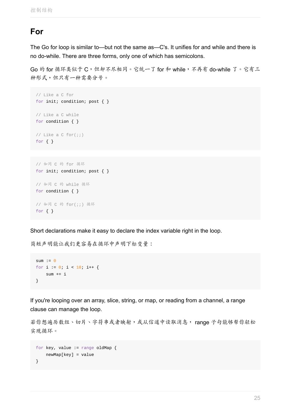 25 .控制结构 For The Go for loop is similar to—but not the same as—C's. It unifies for and while and there is no do-while. There are three forms, only one of which has semicolons. Go 的 for 循环类似于 C,但却不尽相同。它统一了 for 和 while,不再有 do-while 了。它有三 种形式,但只有一种需要分号。 // Like a C for for init; condition; post { } // Like a C while for condition { } // Like a C for(;;) for { } // 如同 C 的 for 循环 for init; condition; post { } // 如同 C 的 while 循环 for condition { } // 如同 C 的 for(;;) 循环 for { } Short declarations make it easy to declare the index variable right in the loop. 简短声明能让我们更容易在循环中声明下标变量: sum := 0 for i := 0; i < 10; i++ { sum += i } If you're looping over an array, slice, string, or map, or reading from a channel, a range clause can manage the loop. 若你想遍历数组、切片、字符串或者映射,或从信道中读取消息, range 子句能够帮你轻松 实现循环。 for key, value := range oldMap { newMap[key] = value } 25