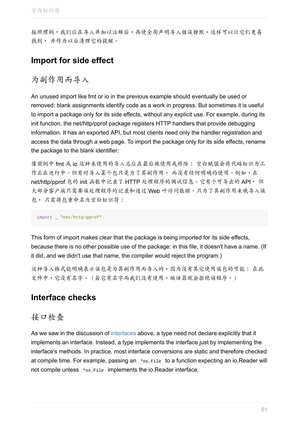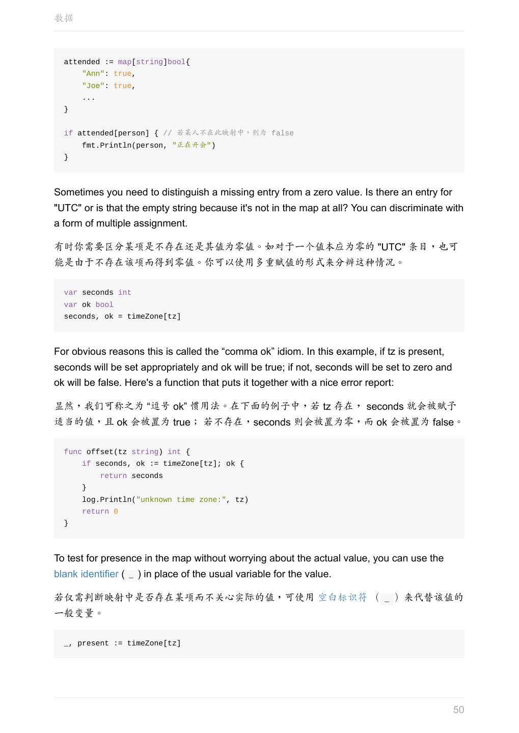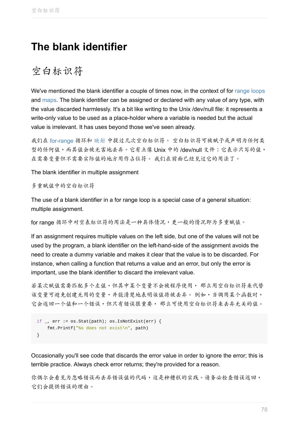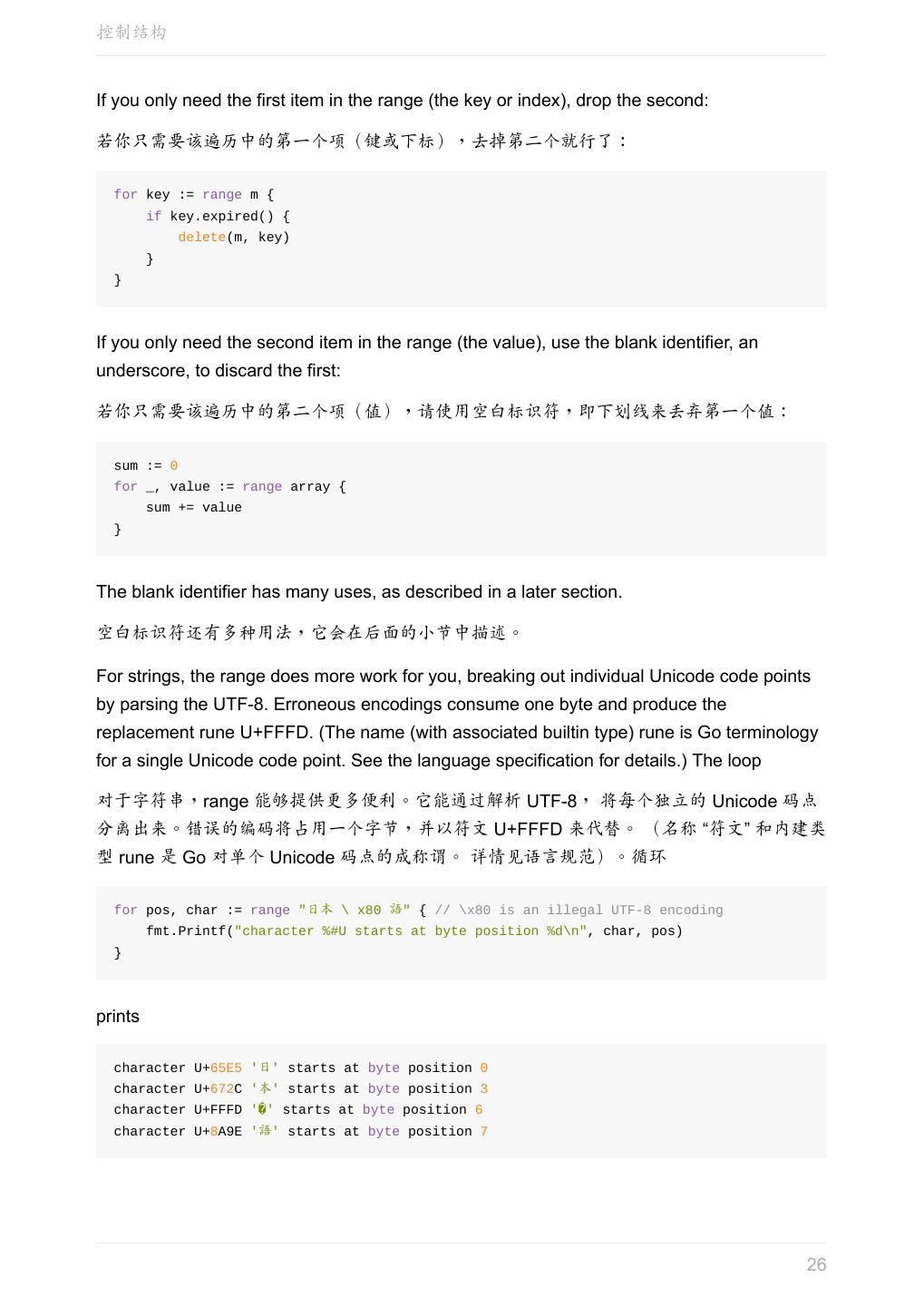 26 .控制结构 If you only need the first item in the range (the key or index), drop the second: 若你只需要该遍历中的第一个项(键或下标),去掉第二个就行了: for key := range m { if key.expired() { delete(m, key) } } If you only need the second item in the range (the value), use the blank identifier, an underscore, to discard the first: 若你只需要该遍历中的第二个项(值),请使用空白标识符,即下划线来丢弃第一个值: sum := 0 for _, value := range array { sum += value } The blank identifier has many uses, as described in a later section. 空白标识符还有多种用法,它会在后面的小节中描述。 For strings, the range does more work for you, breaking out individual Unicode code points by parsing the UTF-8. Erroneous encodings consume one byte and produce the replacement rune U+FFFD. (The name (with associated builtin type) rune is Go terminology for a single Unicode code point. See the language specification for details.) The loop 对于字符串,range 能够提供更多便利。它能通过解析 UTF-8, 将每个独立的 Unicode 码点 分离出来。错误的编码将占用一个字节,并以符文 U+FFFD 来代替。 (名称 “符文” 和内建类 型 rune 是 Go 对单个 Unicode 码点的成称谓。 详情见语言规范)。循环 for pos, char := range "日本 \ x80 語" { // \x80 is an illegal UTF-8 encoding fmt.Printf("character %#U starts at byte position %d\n", char, pos) } prints character U+65E5 '日' starts at byte position 0 character U+672C '本' starts at byte position 3 character U+FFFD '�' starts at byte position 6 character U+8A9E '語' starts at byte position 7 26