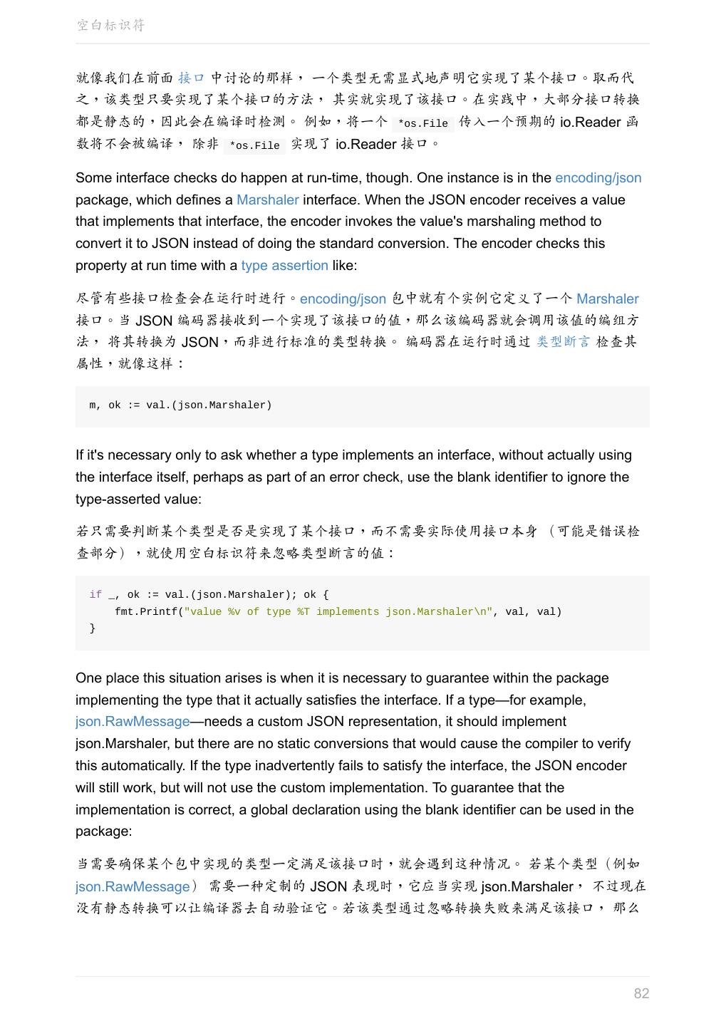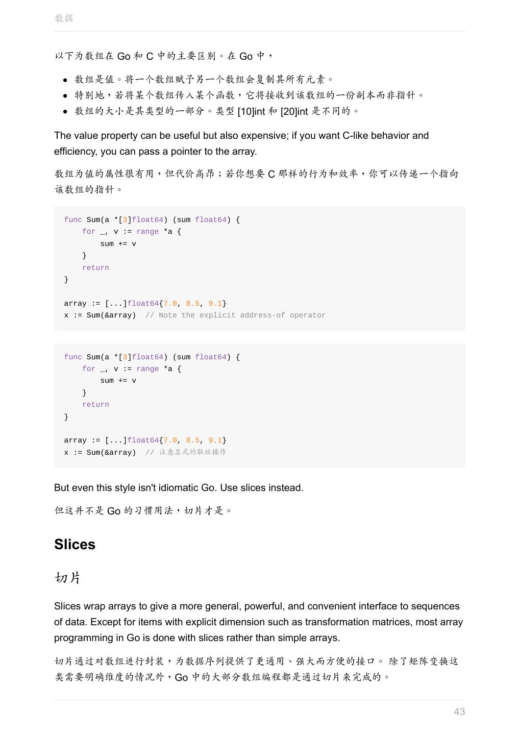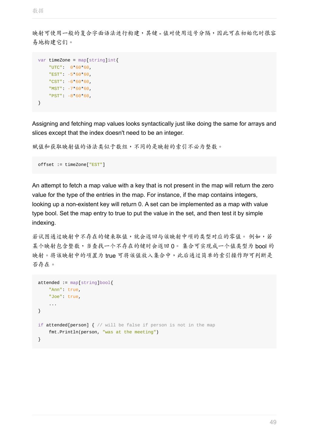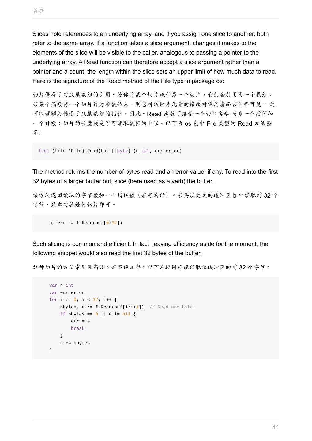 26 .控制结构 If you only need the first item in the range (the key or index), drop the second: 若你只需要该遍历中的第一个项(键或下标),去掉第二个就行了: for key := range m { if key.expired() { delete(m, key) } } If you only need the second item in the range (the value), use the blank identifier, an underscore, to discard the first: 若你只需要该遍历中的第二个项(值),请使用空白标识符,即下划线来丢弃第一个值: sum := 0 for _, value := range array { sum += value } The blank identifier has many uses, as described in a later section. 空白标识符还有多种用法,它会在后面的小节中描述。 For strings, the range does more work for you, breaking out individual Unicode code points by parsing the UTF-8. Erroneous encodings consume one byte and produce the replacement rune U+FFFD. (The name (with associated builtin type) rune is Go terminology for a single Unicode code point. See the language specification for details.) The loop 对于字符串,range 能够提供更多便利。它能通过解析 UTF-8, 将每个独立的 Unicode 码点 分离出来。错误的编码将占用一个字节,并以符文 U+FFFD 来代替。 (名称 “符文” 和内建类 型 rune 是 Go 对单个 Unicode 码点的成称谓。 详情见语言规范)。循环 for pos, char := range "日本 \ x80 語" { // \x80 is an illegal UTF-8 encoding fmt.Printf("character %#U starts at byte position %d\n", char, pos) } prints character U+65E5 '日' starts at byte position 0 character U+672C '本' starts at byte position 3 character U+FFFD '�' starts at byte position 6 character U+8A9E '語' starts at byte position 7 26