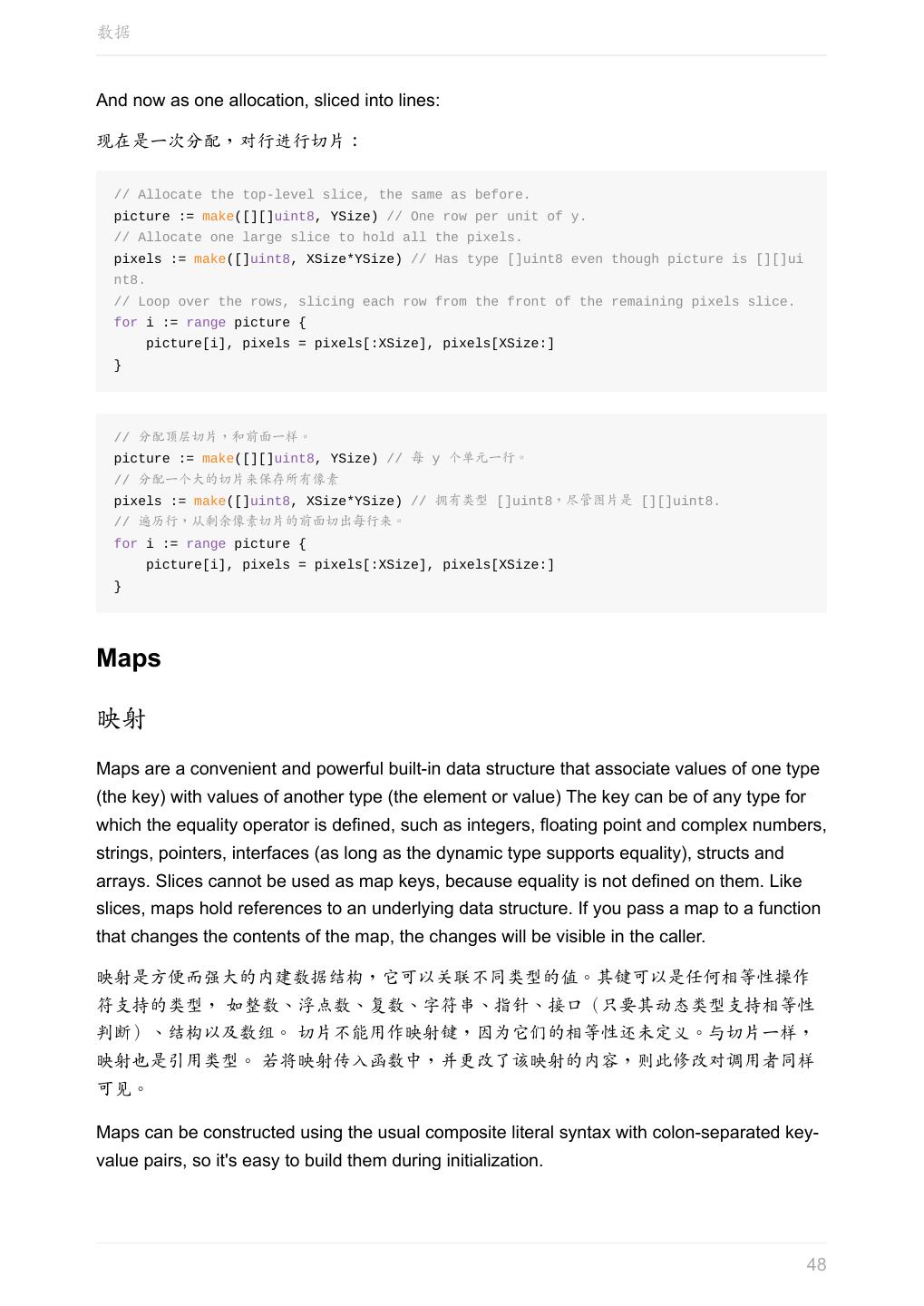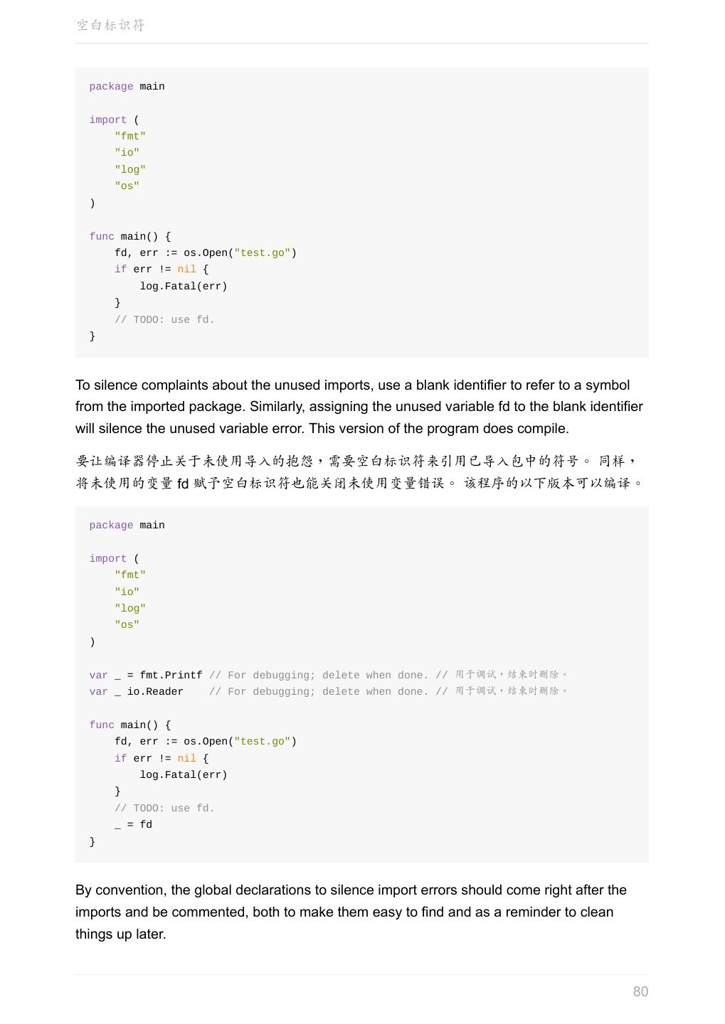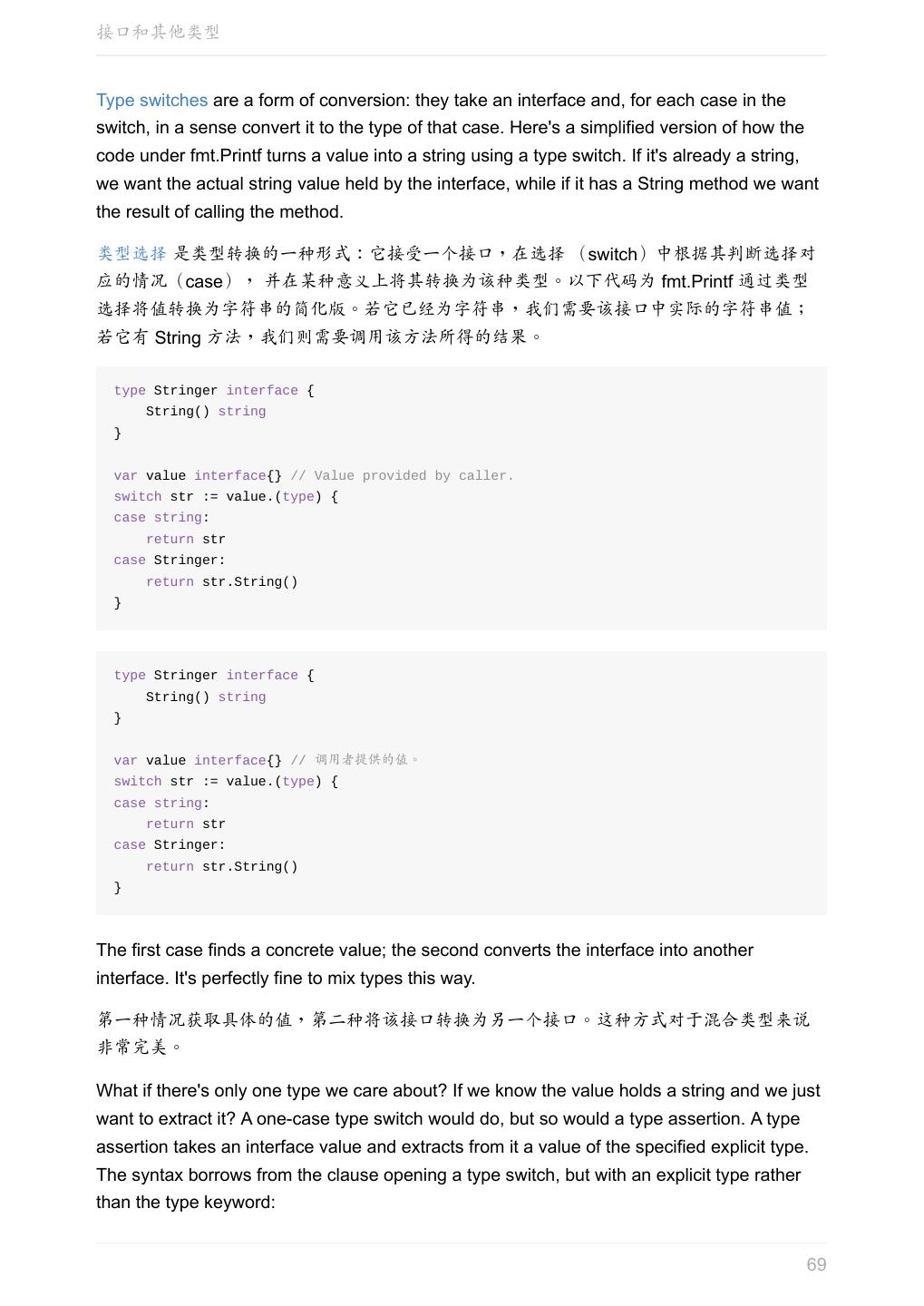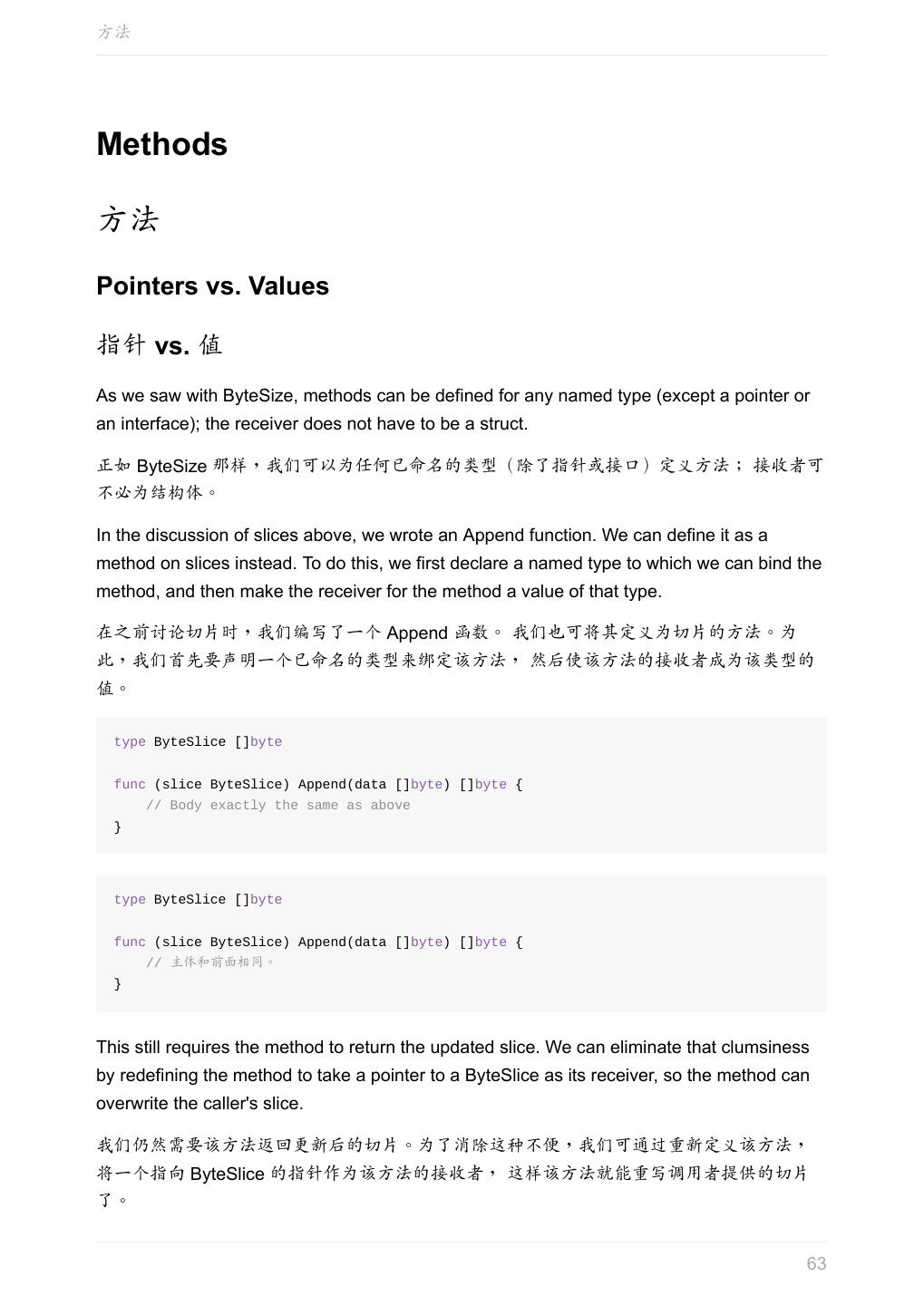 26 .控制结构 If you only need the first item in the range (the key or index), drop the second: 若你只需要该遍历中的第一个项(键或下标),去掉第二个就行了: for key := range m { if key.expired() { delete(m, key) } } If you only need the second item in the range (the value), use the blank identifier, an underscore, to discard the first: 若你只需要该遍历中的第二个项(值),请使用空白标识符,即下划线来丢弃第一个值: sum := 0 for _, value := range array { sum += value } The blank identifier has many uses, as described in a later section. 空白标识符还有多种用法,它会在后面的小节中描述。 For strings, the range does more work for you, breaking out individual Unicode code points by parsing the UTF-8. Erroneous encodings consume one byte and produce the replacement rune U+FFFD. (The name (with associated builtin type) rune is Go terminology for a single Unicode code point. See the language specification for details.) The loop 对于字符串,range 能够提供更多便利。它能通过解析 UTF-8, 将每个独立的 Unicode 码点 分离出来。错误的编码将占用一个字节,并以符文 U+FFFD 来代替。 (名称 “符文” 和内建类 型 rune 是 Go 对单个 Unicode 码点的成称谓。 详情见语言规范)。循环 for pos, char := range "日本 \ x80 語" { // \x80 is an illegal UTF-8 encoding fmt.Printf("character %#U starts at byte position %d\n", char, pos) } prints character U+65E5 '日' starts at byte position 0 character U+672C '本' starts at byte position 3 character U+FFFD '�' starts at byte position 6 character U+8A9E '語' starts at byte position 7 26