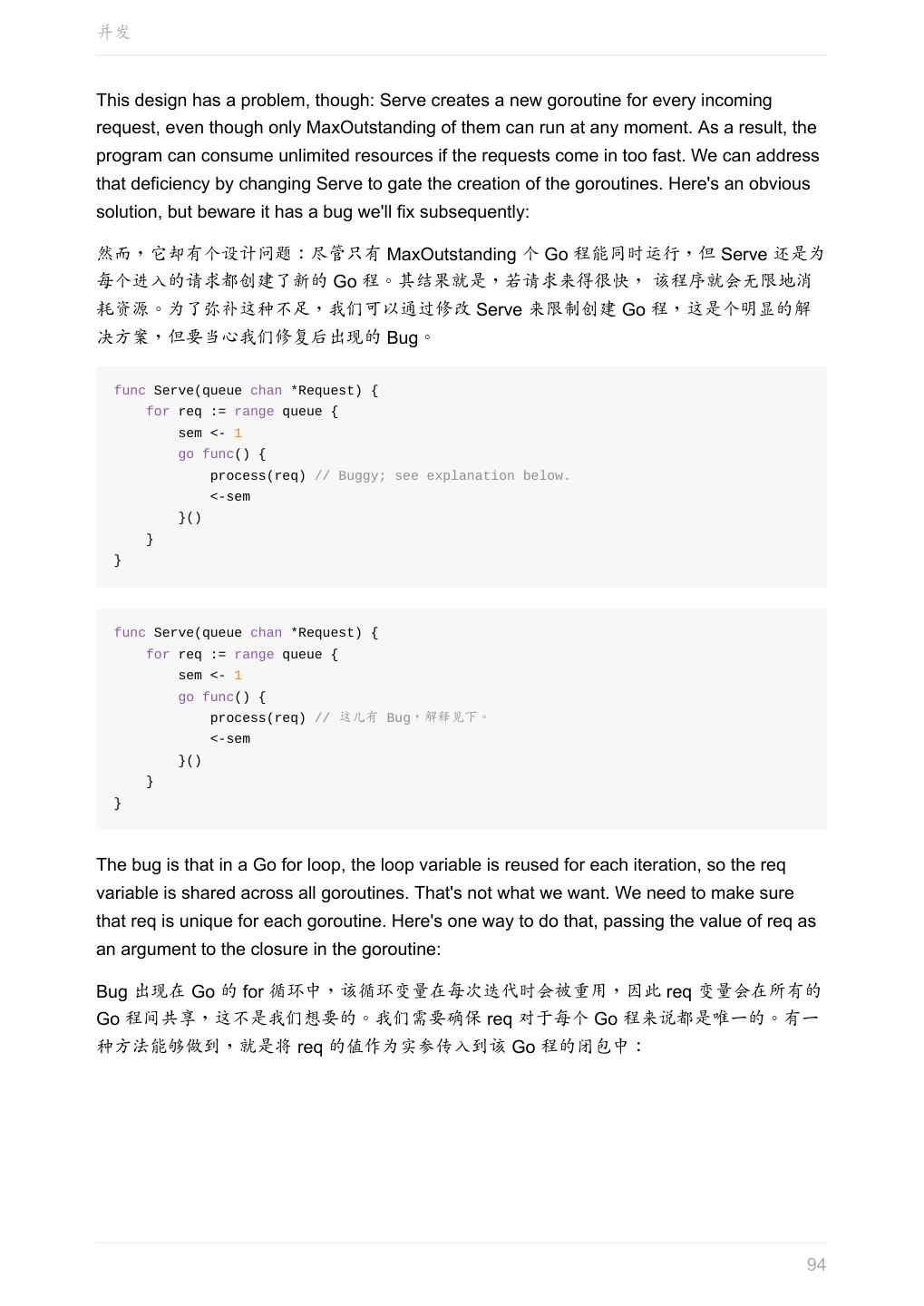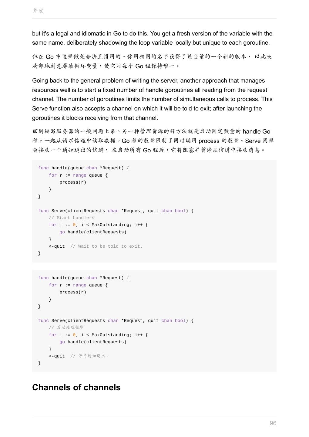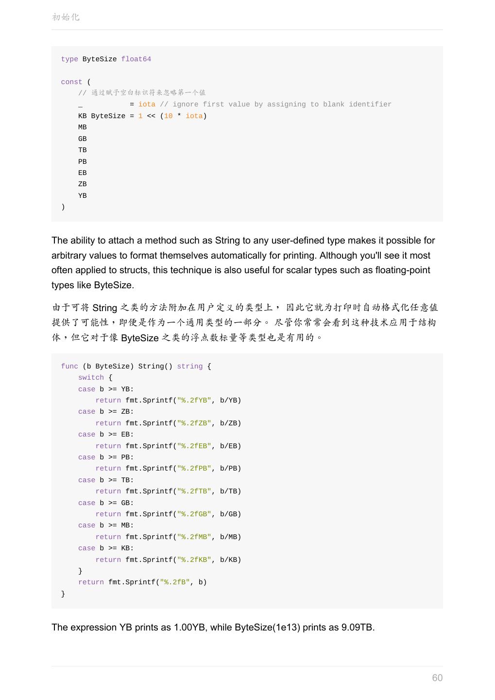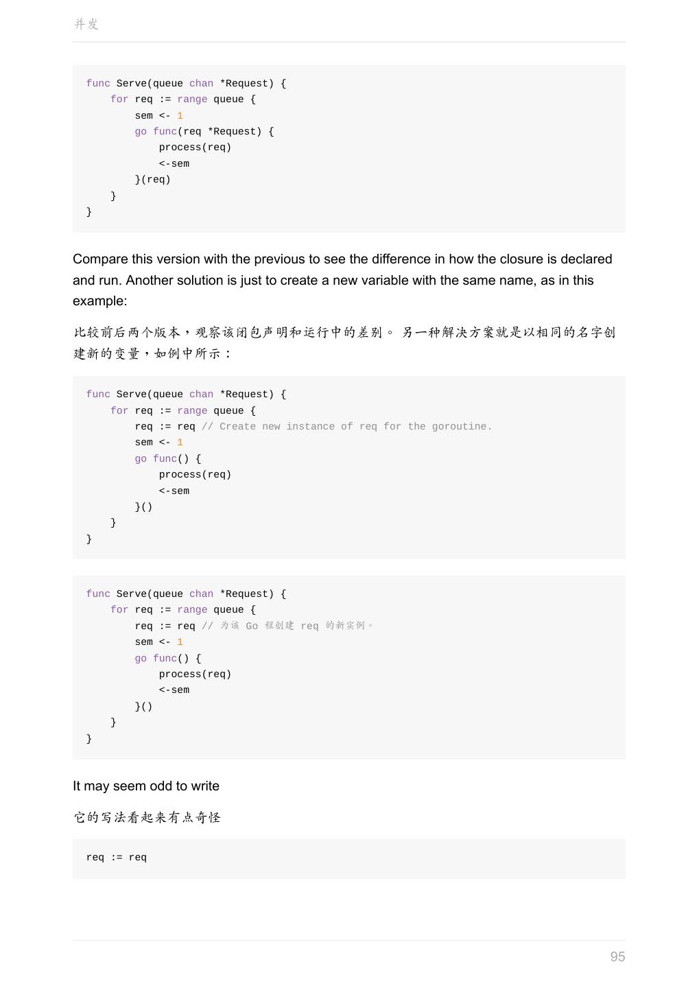 26 .控制结构 If you only need the first item in the range (the key or index), drop the second: 若你只需要该遍历中的第一个项(键或下标),去掉第二个就行了: for key := range m { if key.expired() { delete(m, key) } } If you only need the second item in the range (the value), use the blank identifier, an underscore, to discard the first: 若你只需要该遍历中的第二个项(值),请使用空白标识符,即下划线来丢弃第一个值: sum := 0 for _, value := range array { sum += value } The blank identifier has many uses, as described in a later section. 空白标识符还有多种用法,它会在后面的小节中描述。 For strings, the range does more work for you, breaking out individual Unicode code points by parsing the UTF-8. Erroneous encodings consume one byte and produce the replacement rune U+FFFD. (The name (with associated builtin type) rune is Go terminology for a single Unicode code point. See the language specification for details.) The loop 对于字符串,range 能够提供更多便利。它能通过解析 UTF-8, 将每个独立的 Unicode 码点 分离出来。错误的编码将占用一个字节,并以符文 U+FFFD 来代替。 (名称 “符文” 和内建类 型 rune 是 Go 对单个 Unicode 码点的成称谓。 详情见语言规范)。循环 for pos, char := range "日本 \ x80 語" { // \x80 is an illegal UTF-8 encoding fmt.Printf("character %#U starts at byte position %d\n", char, pos) } prints character U+65E5 '日' starts at byte position 0 character U+672C '本' starts at byte position 3 character U+FFFD '�' starts at byte position 6 character U+8A9E '語' starts at byte position 7 26