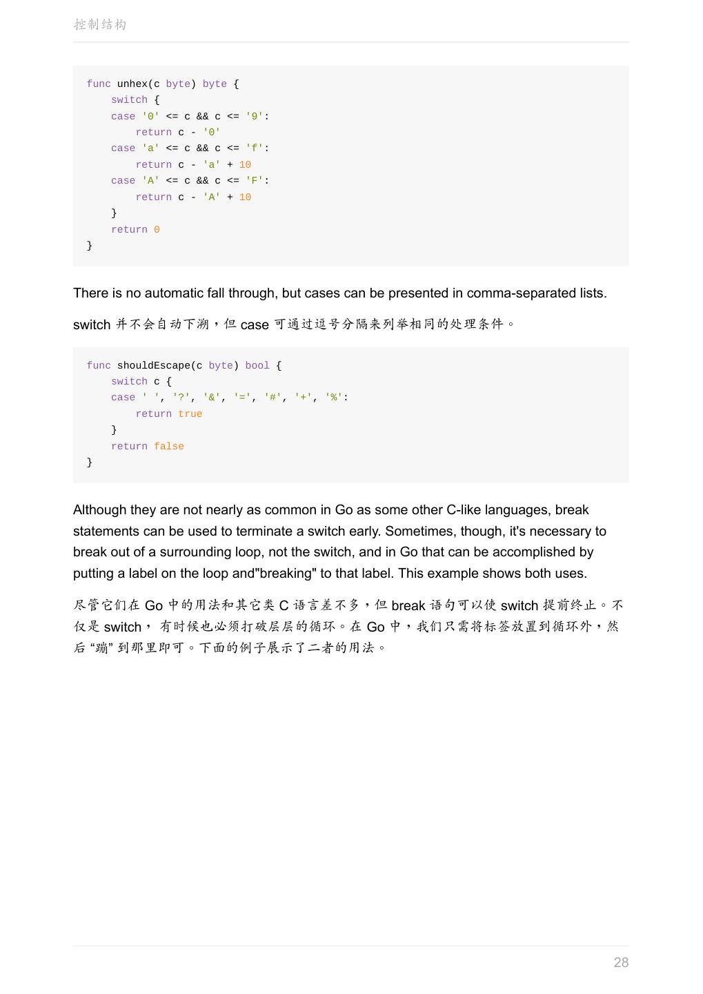 28 .控制结构 func unhex(c byte) byte { switch { case '0' <= c && c <= '9': return c - '0' case 'a' <= c && c <= 'f': return c - 'a' + 10 case 'A' <= c && c <= 'F': return c - 'A' + 10 } return 0 } There is no automatic fall through, but cases can be presented in comma-separated lists. switch 并不会自动下溯,但 case 可通过逗号分隔来列举相同的处理条件。 func shouldEscape(c byte) bool { switch c { case ' ', '?', '&', '=', '#', '+', '%': return true } return false } Although they are not nearly as common in Go as some other C-like languages, break statements can be used to terminate a switch early. Sometimes, though, it's necessary to break out of a surrounding loop, not the switch, and in Go that can be accomplished by putting a label on the loop and"breaking" to that label. This example shows both uses. 尽管它们在 Go 中的用法和其它类 C 语言差不多,但 break 语句可以使 switch 提前终止。不 仅是 switch, 有时候也必须打破层层的循环。在 Go 中,我们只需将标签放置到循环外,然 后 “蹦” 到那里即可。下面的例子展示了二者的用法。 28