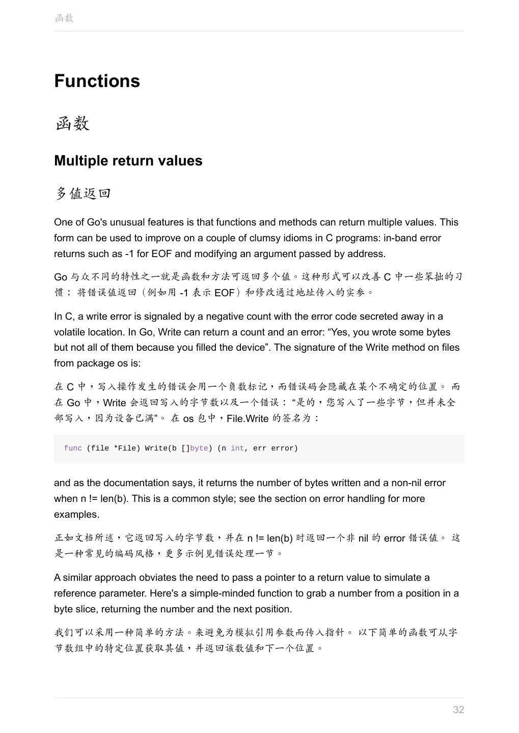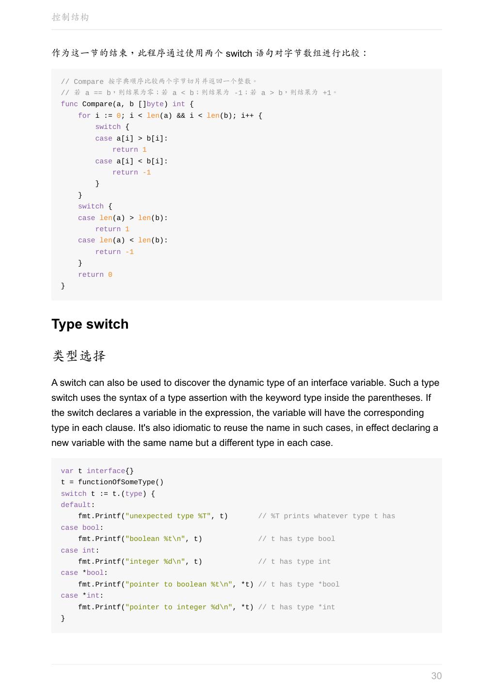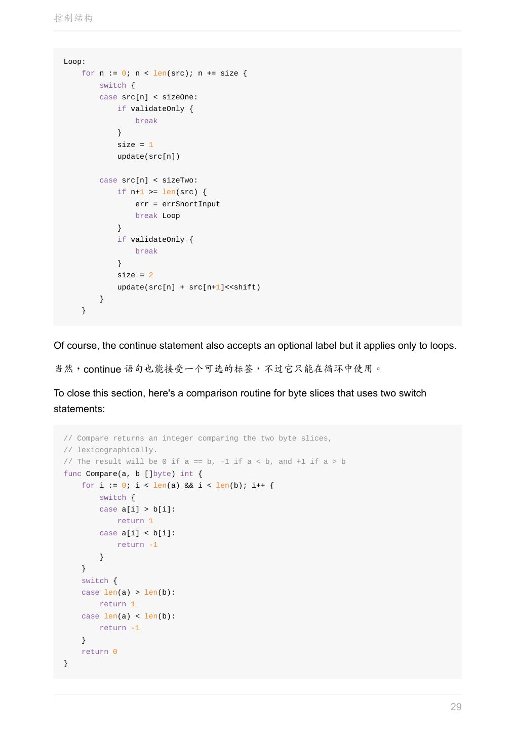29 .控制结构 Loop: for n := 0; n < len(src); n += size { switch { case src[n] < sizeOne: if validateOnly { break } size = 1 update(src[n]) case src[n] < sizeTwo: if n+1 >= len(src) { err = errShortInput break Loop } if validateOnly { break } size = 2 update(src[n] + src[n+1]<<shift) } } Of course, the continue statement also accepts an optional label but it applies only to loops. 当然,continue 语句也能接受一个可选的标签,不过它只能在循环中使用。 To close this section, here's a comparison routine for byte slices that uses two switch statements: // Compare returns an integer comparing the two byte slices, // lexicographically. // The result will be 0 if a == b, -1 if a < b, and +1 if a > b func Compare(a, b []byte) int { for i := 0; i < len(a) && i < len(b); i++ { switch { case a[i] > b[i]: return 1 case a[i] < b[i]: return -1 } } switch { case len(a) > len(b): return 1 case len(a) < len(b): return -1 } return 0 } 29