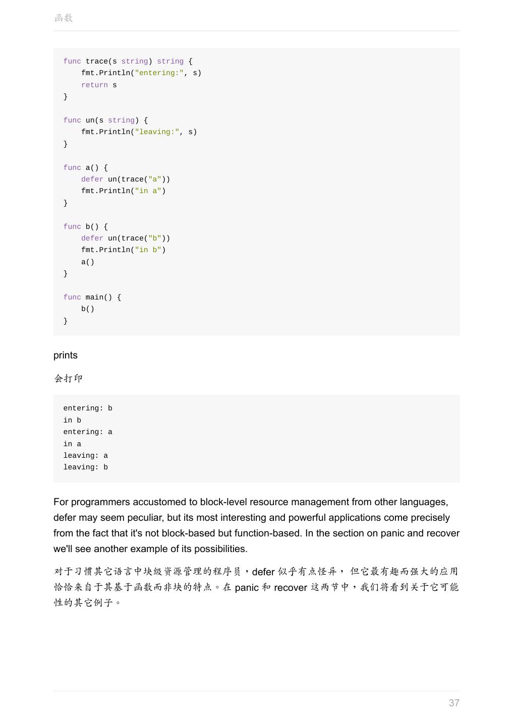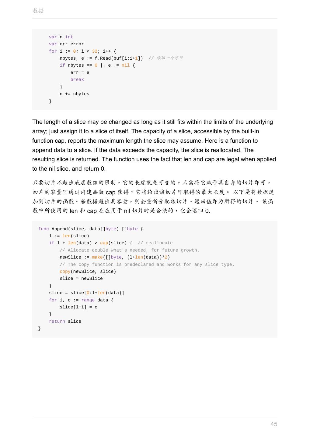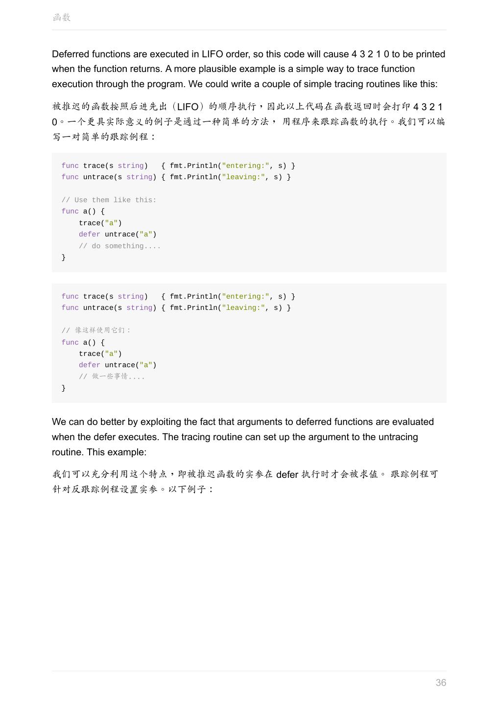 29 .控制结构 Loop: for n := 0; n < len(src); n += size { switch { case src[n] < sizeOne: if validateOnly { break } size = 1 update(src[n]) case src[n] < sizeTwo: if n+1 >= len(src) { err = errShortInput break Loop } if validateOnly { break } size = 2 update(src[n] + src[n+1]<<shift) } } Of course, the continue statement also accepts an optional label but it applies only to loops. 当然,continue 语句也能接受一个可选的标签,不过它只能在循环中使用。 To close this section, here's a comparison routine for byte slices that uses two switch statements: // Compare returns an integer comparing the two byte slices, // lexicographically. // The result will be 0 if a == b, -1 if a < b, and +1 if a > b func Compare(a, b []byte) int { for i := 0; i < len(a) && i < len(b); i++ { switch { case a[i] > b[i]: return 1 case a[i] < b[i]: return -1 } } switch { case len(a) > len(b): return 1 case len(a) < len(b): return -1 } return 0 } 29