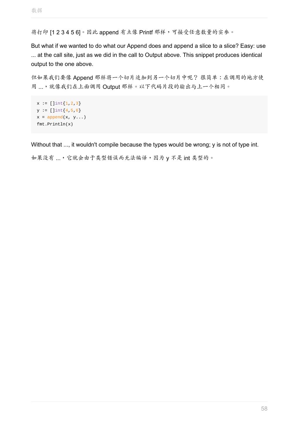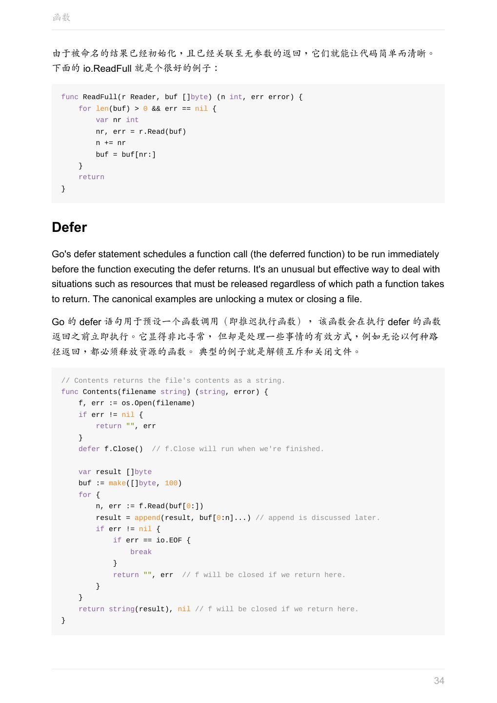24 .控制结构 f, err := os.Open(name) This statement declares two variables, f and err. A few lines later, the call to f.Stat reads, 该语句声明了两个变量 f 和 err。在几行之后,又通过 d, err := f.Stat() which looks as if it declares d and err. Notice, though, that err appears in both statements. This duplication is legal: err is declared by the first statement, but only re-assigned in the second. This means that the call to f.Stat uses the existing err variable declared above, and just gives it a new value. 调用了 f.Stat。它看起来似乎是声明了 d 和 err。 注意,尽管两个语句中都出现了 err,但这 种重复仍然是合法的:err 在第一条语句中被声明,但在第二条语句中只是被再次赋值罢了。 也就是说,调用 f.Stat 使用的是前面已经声明的 err,它只是被重新赋值了而已。 In a := declaration a variable v may appear even if it has already been declared, provided: 在满足下列条件时,已被声明的变量 v 可出现在:= 声明中: this declaration is in the same scope as the existing declaration of v (if v is already declared in an outer scope, the declaration will create a new variable §), the corresponding value in the initialization is assignable to v, and there is at least one other variable in the declaration that is being declared anew. 本次声明与已声明的 v 处于同一作用域中(若 v 已在外层作用域中声明过,则此次声明 会创建一个新的变量 §), 在初始化中与其类型相应的值才能赋予 v,且 在此次声明中至少另有一个变量是新声明的。 This unusual property is pure pragmatism, making it easy to use a single err value, for example, in a long if-else chain. You'll see it used often. 这个特性简直就是纯粹的实用主义体现,它使得我们可以很方面地只使用一个 err 值,例如, 在一个相当长的 if-else 语句链中, 你会发现它用得很频繁。 § It's worth noting here that in Go the scope of function parameters and return values is the same as the function body, even though they appear lexically outside the braces that enclose the body. § 值得一提的是,即便 Go 中的函数形参和返回值在词法上处于大括号之外, 但它们的作用 域和该函数体仍然相同。 24