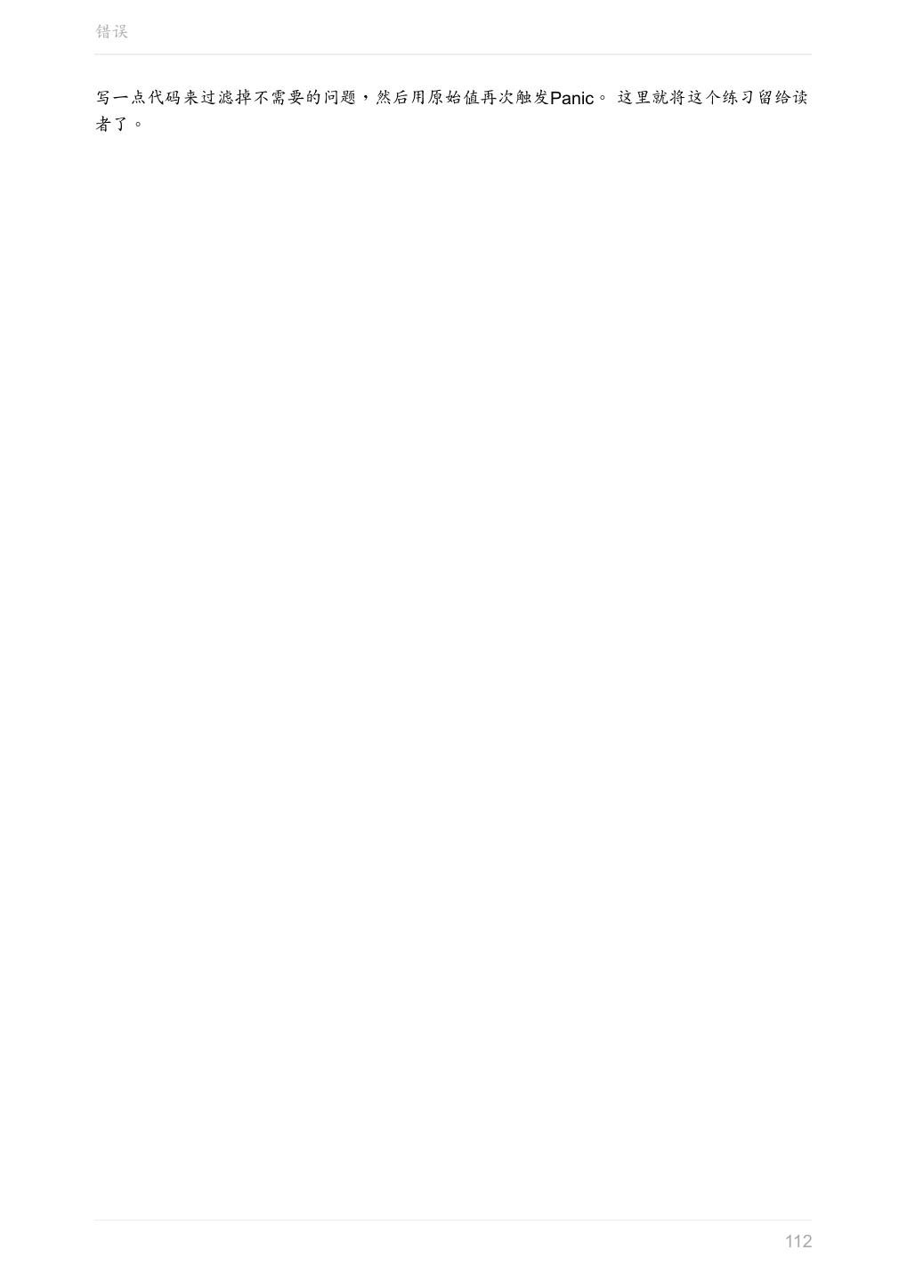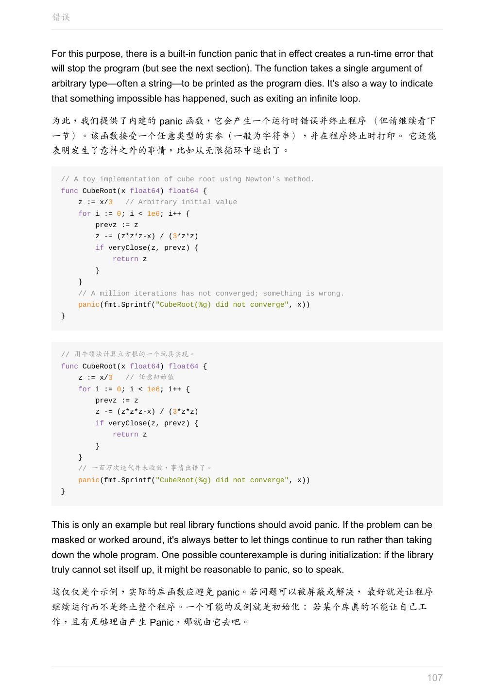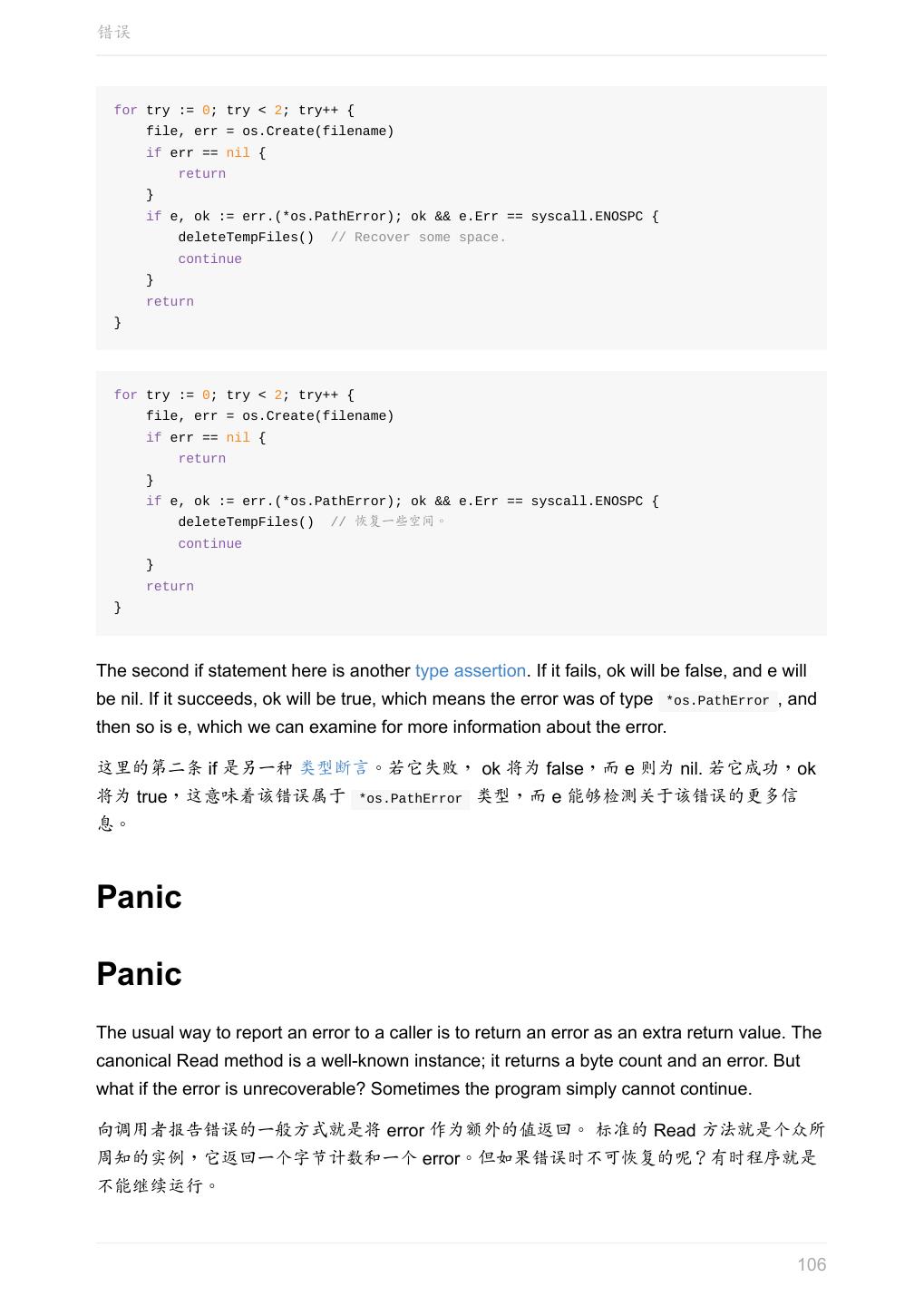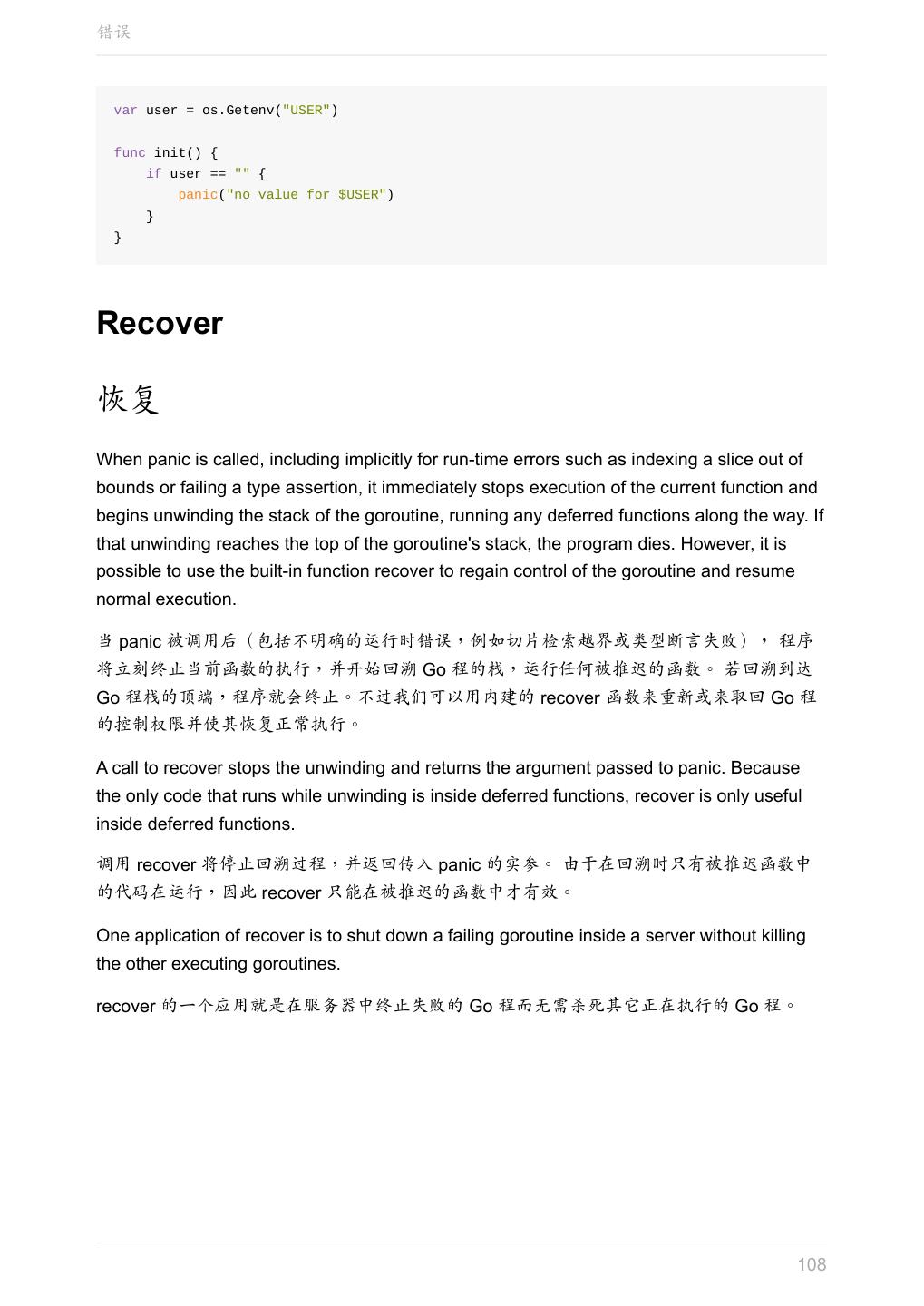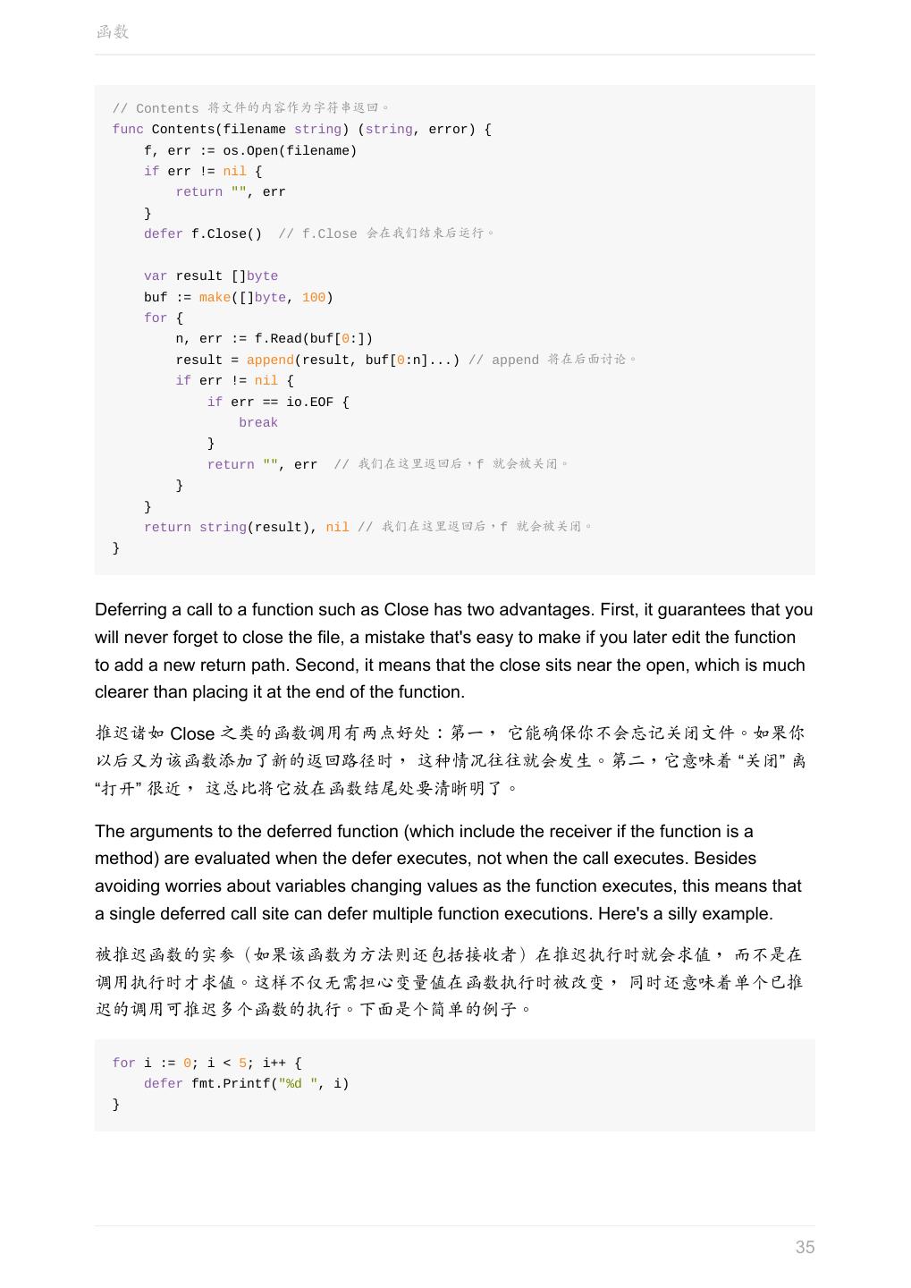 23 .控制结构 if err := file.Chmod(0664); err != nil { log.Print(err) return err } In the Go libraries, you'll find that when an if statement doesn't flow into the next statement— that is, the body ends in break, continue, goto, or return—the unnecessary else is omitted. 在 Go 的库中,你会发现若 if 语句不会执行到下一条语句时,亦即其执行体 以 break、 continue、goto 或 return 结束时,不必要的 else 会被省略。 f, err := os.Open(name) if err != nil { return err } codeUsing(f) This is an example of a common situation where code must guard against a sequence of error conditions. The code reads well if the successful flow of control runs down the page, eliminating error cases as they arise. Since error cases tend to end in return statements, the resulting code needs no else statements. 下例是一种常见的情况,代码必须防范一系列的错误条件。若控制流成功继续, 则说明程序 已排除错误。由于出错时将以 return 结束, 之后的代码也就无需 else 了。 f, err := os.Open(name) if err != nil { return err } d, err := f.Stat() if err != nil { f.Close() return err } codeUsing(f, d) Redeclaration and reassignment 重新声明与再次赋值 An aside: The last example in the previous section demonstrates a detail of how the := short declaration form works. The declaration that calls os.Open reads, 题外话:上一节中最后一个示例展示了短声明 := 如何使用。 调用了 os.Open 的声明为 23