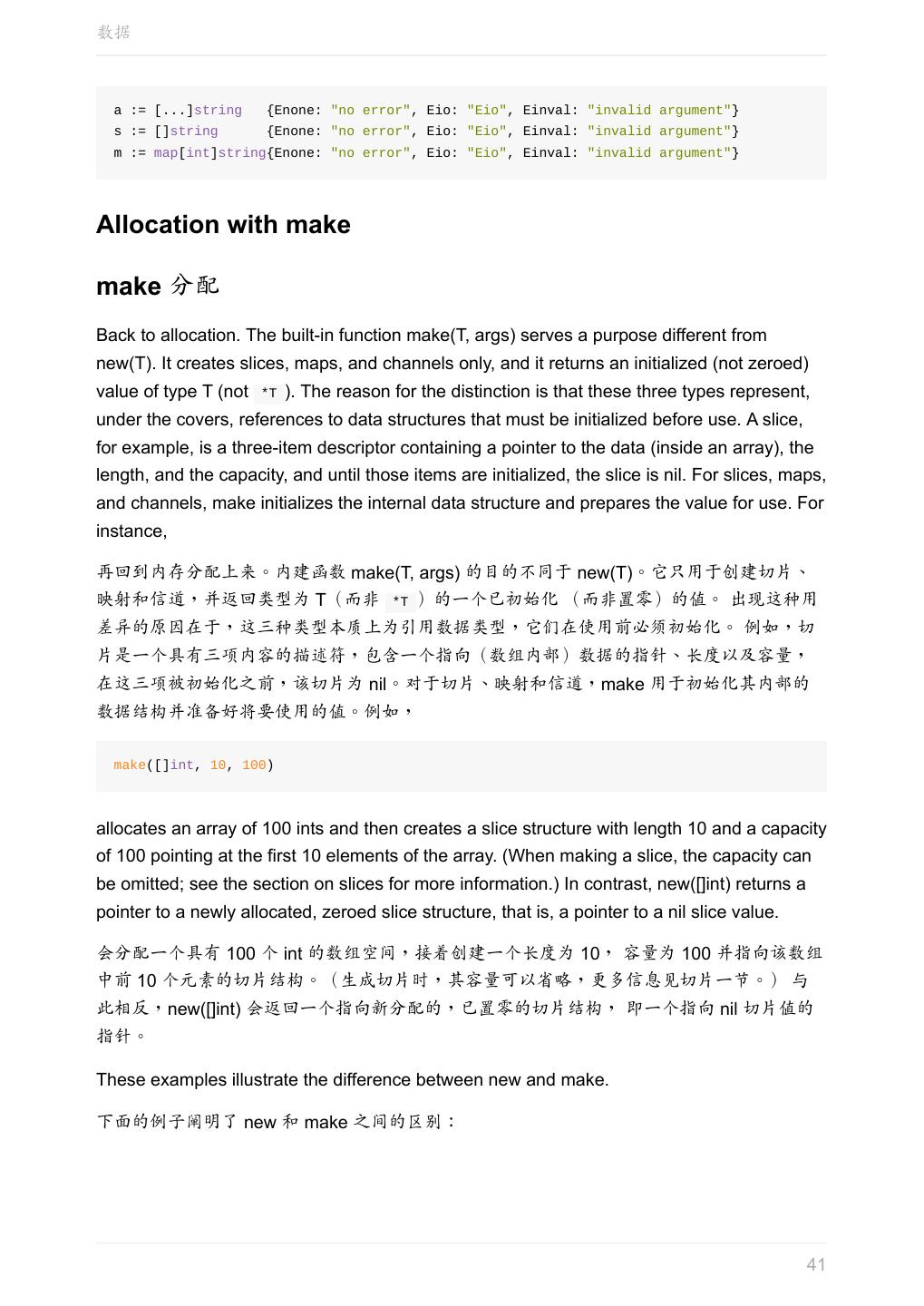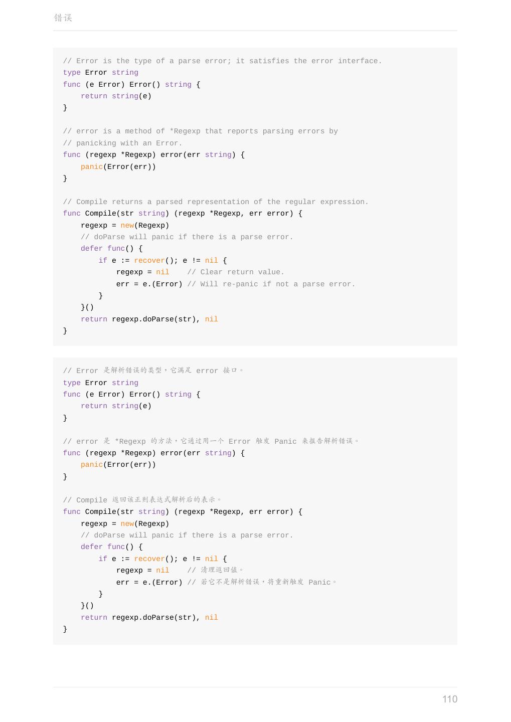 14 .注释 If the name always begins the comment, the output of godoc can usefully be run through grep. Imagine you couldn't remember the name"Compile" but were looking for the parsing function for regular expressions, so you ran the command, 若注释总是以名称开头,godoc 的输出就能通过 grep 变得更加有用。假如你记不住 “Compile” 这个名称,而又在找正则表达式的解析函数, 那就可以运行 $ godoc regexp | grep parse If all the doc comments in the package began, "This function...", grep wouldn't help you remember the name. But because the package starts each doc comment with the name, you'd see something like this, which recalls the word you're looking for. 若包中的所有文档注释都以 “此函数…” 开头,grep 就无法帮你记住此名称。 但由于每个包的 文档注释都以其名称开头,你就能看到这样的内容,它能显示你正在寻找的词语。 $ godoc regexp | grep parse Compile parses a regular expression and returns, if successful, a Regexp parsed. It simplifies safe initialization of global variables holding cannot be parsed. It simplifies safe initialization of global variables $ Go's declaration syntax allows grouping of declarations. A single doc comment can introduce a group of related constants or variables. Since the whole declaration is presented, such a comment can often be perfunctory. Go的声明语法允许成组声明。单个文档注释应介绍一组相关的常量或变量。 由于是整体声 明,这种注释往往较为笼统。 // Error codes returned by failures to parse an expression. var ( ErrInternal = errors.New("regexp: internal error") ErrUnmatchedLpar = errors.New("regexp: unmatched '('") ErrUnmatchedRpar = errors.New("regexp: unmatched ')'") ... ) // 表达式解析失败后返回错误代码。 var ( ErrInternal = errors.New("regexp: internal error") ErrUnmatchedLpar = errors.New("regexp: unmatched '('") ErrUnmatchedRpar = errors.New("regexp: unmatched ')'") ... ) 14